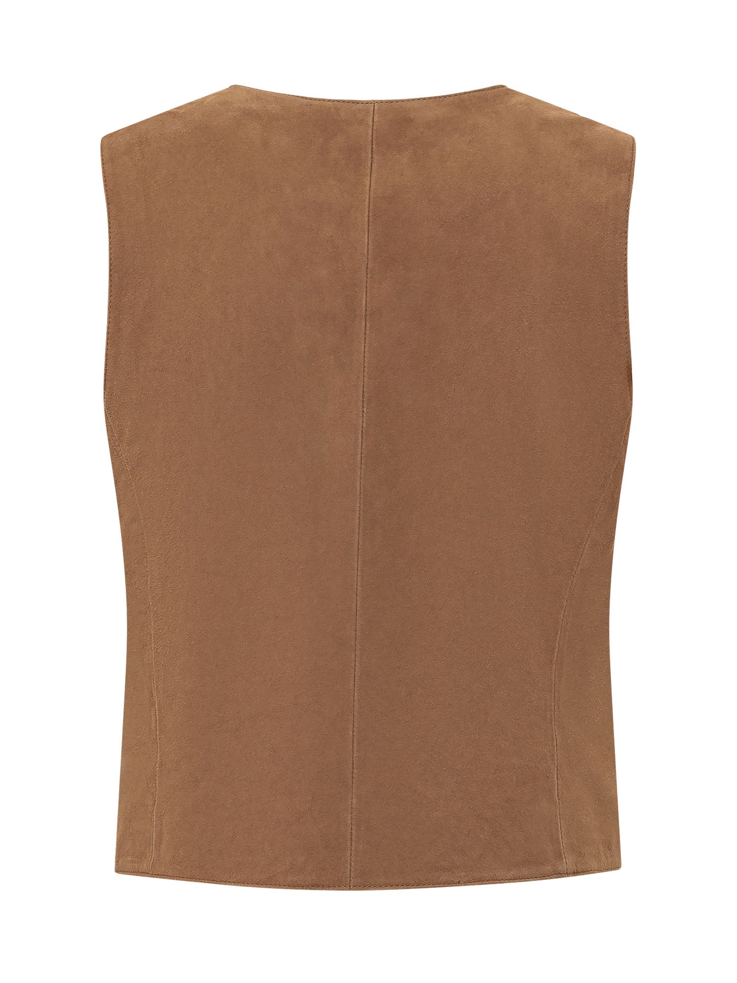 Sleeveless vest with V neck and button closure, featuring front pockets and stitched details