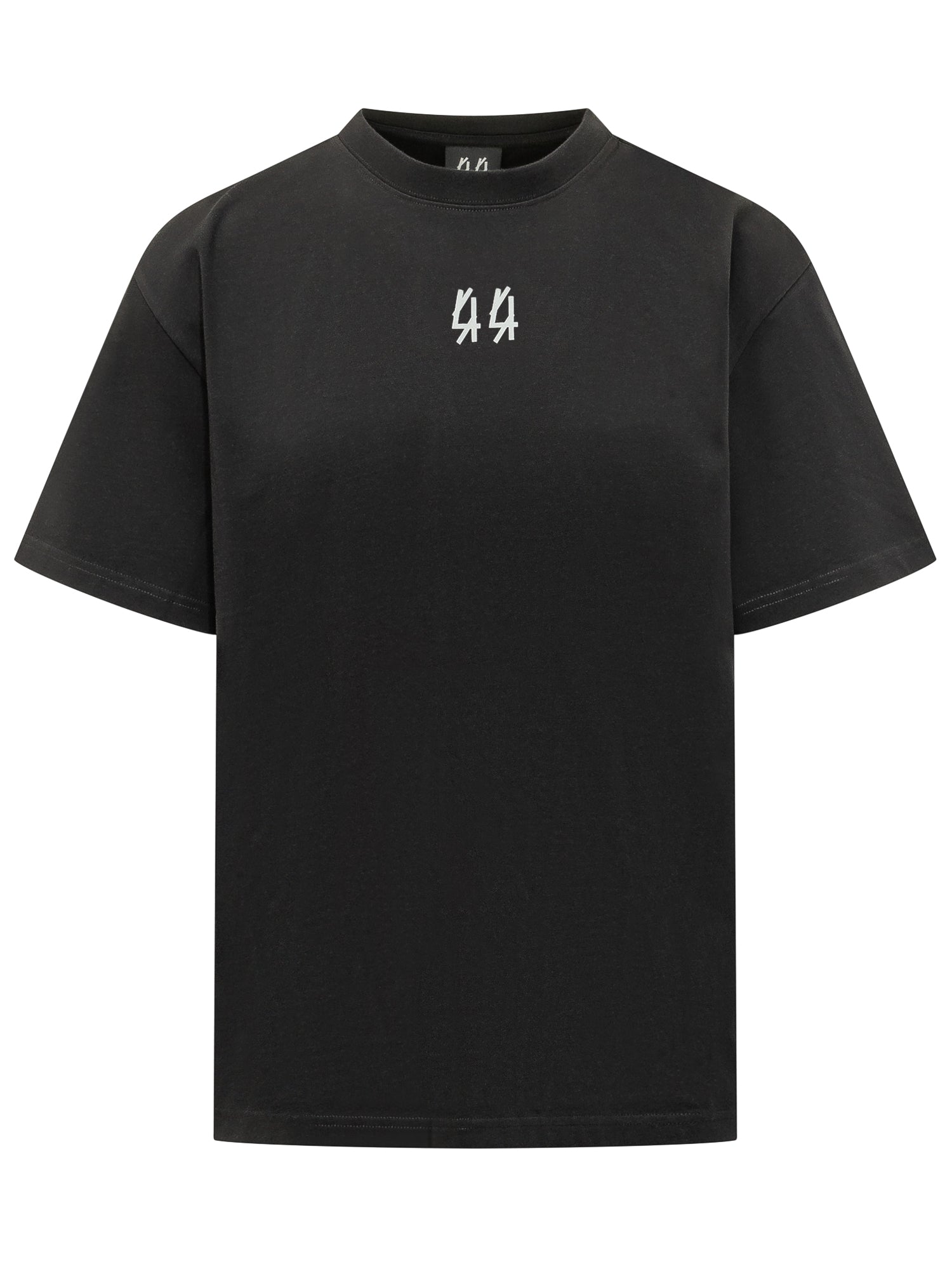 T-shirt with short sleeves and crew neck, small logo on chest, large graphic print on back.