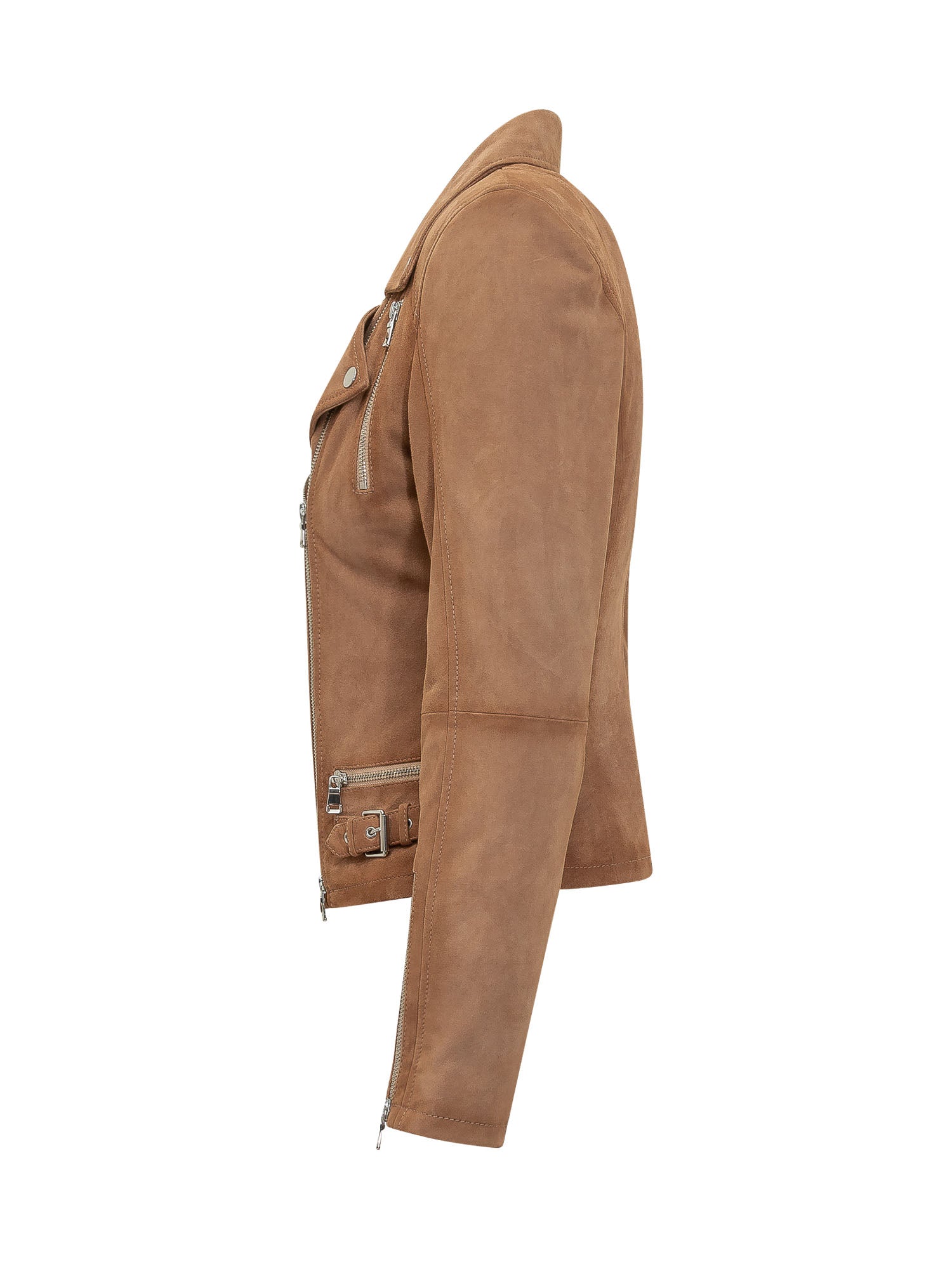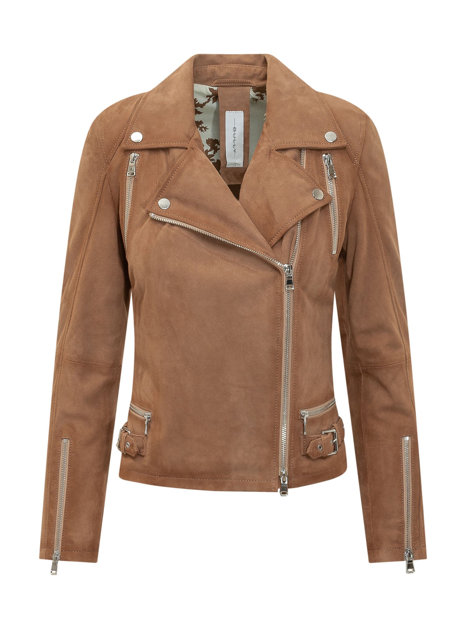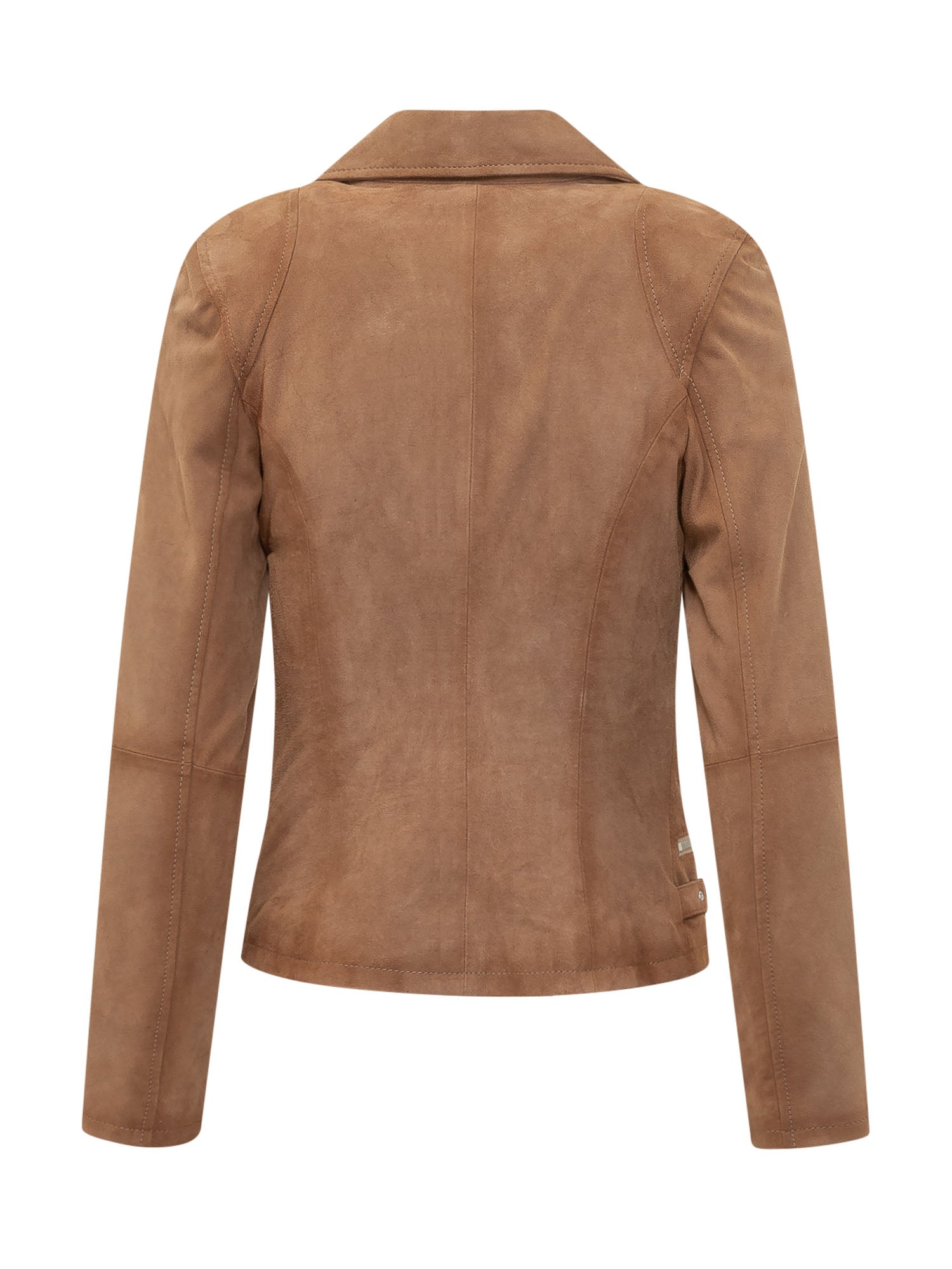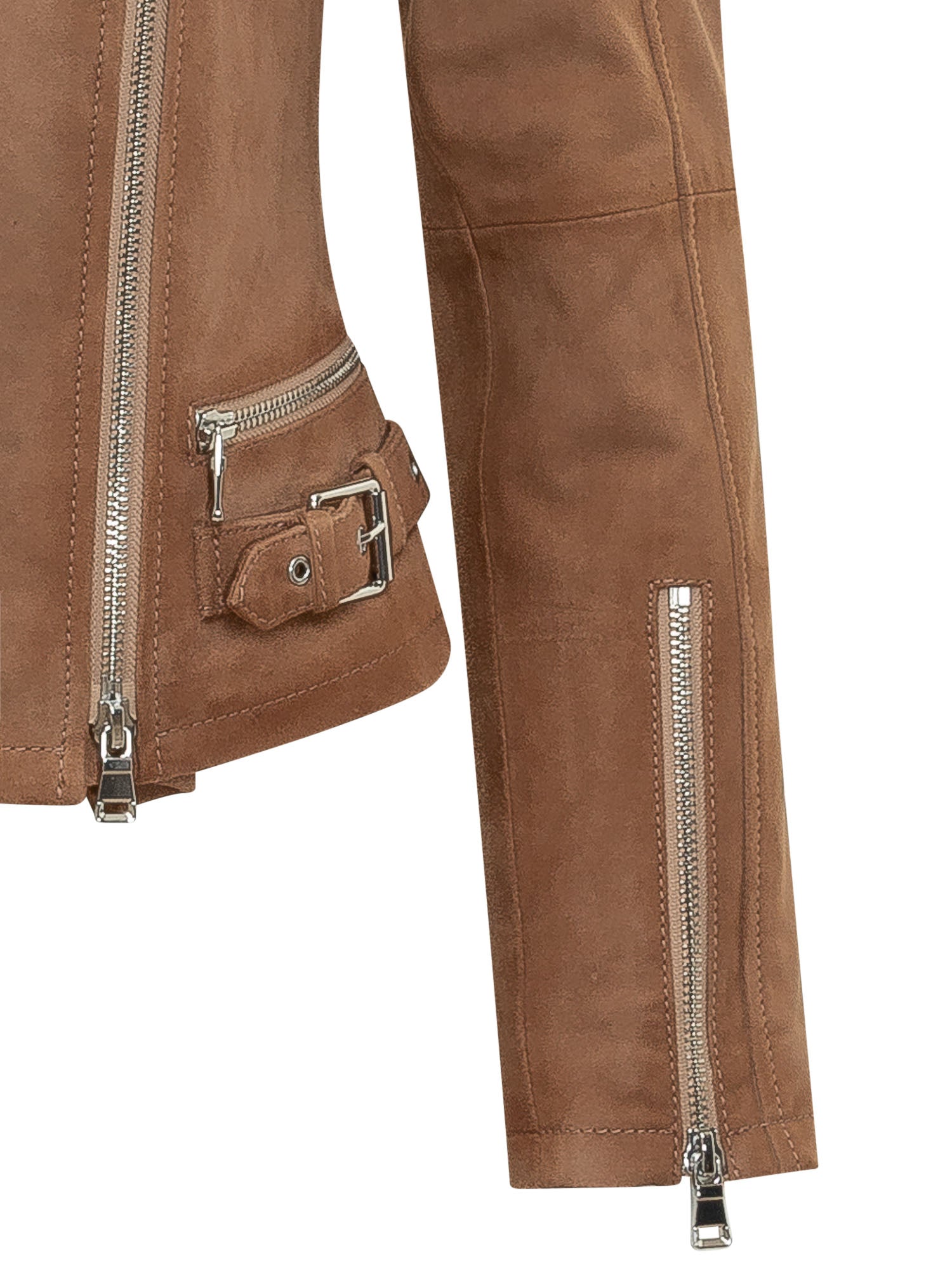 Long sleeve jacket with asymmetrical front zip closure, collar with buttons, zip pockets and side buckle details, structured design