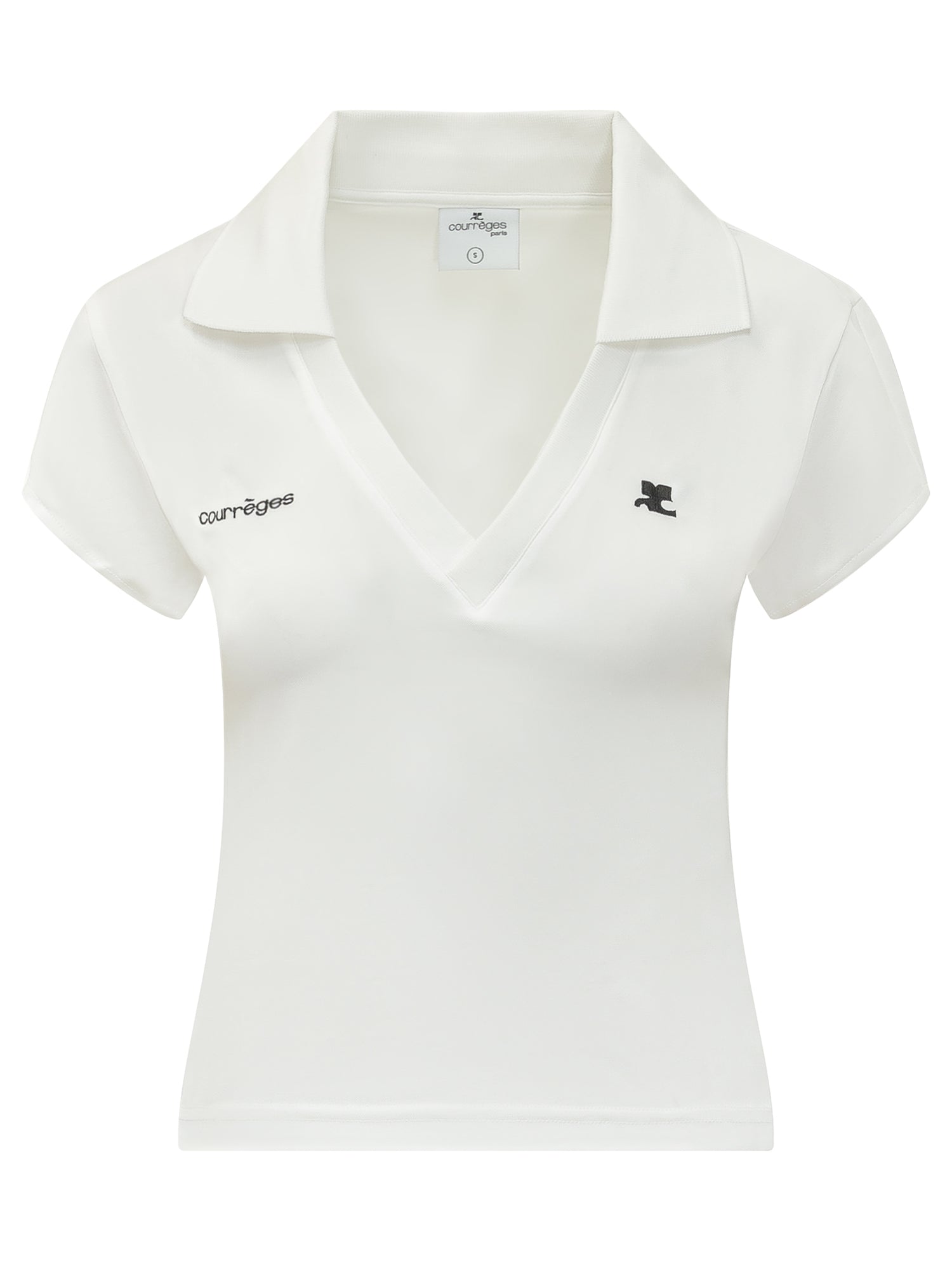 Cropped sports polo featuring a V-neckline with contrast collar. Slim fit enhances the silhouette. Short sleeves and clean design.
