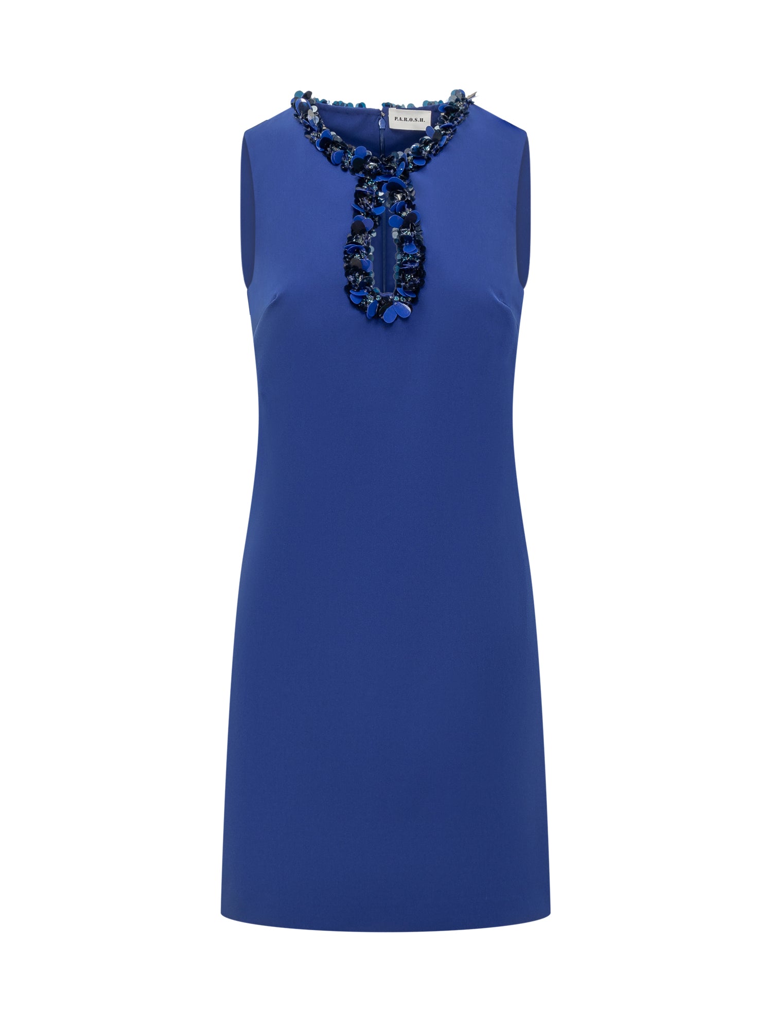 Midi dress. Sleeveless. Crew neck and center chest opening. Crepe-effect weave. Pleats at chest. Concealed zipper and hook-and-eye closure at back. Floral cut-out detail at neck. Straight silhouette.