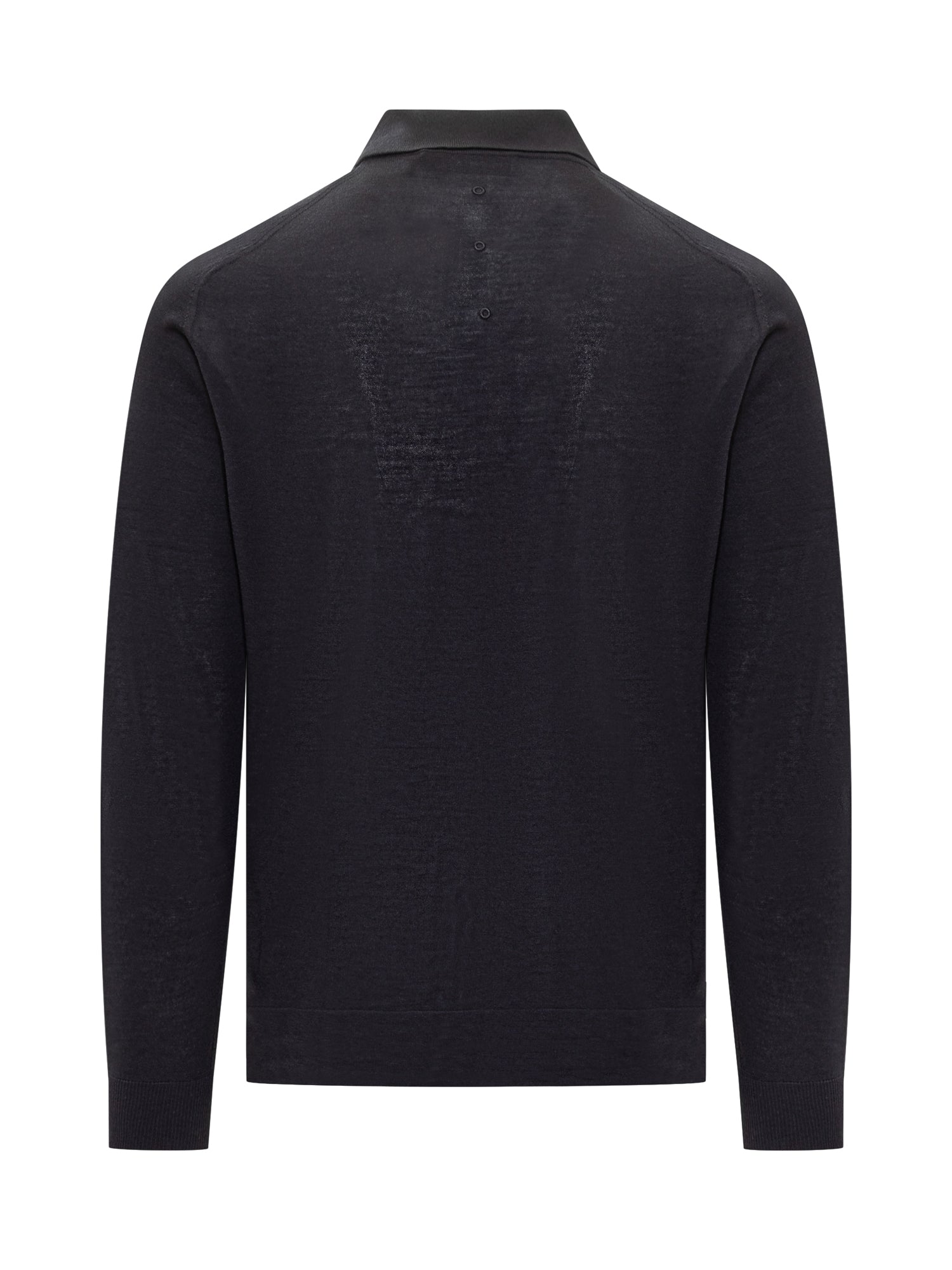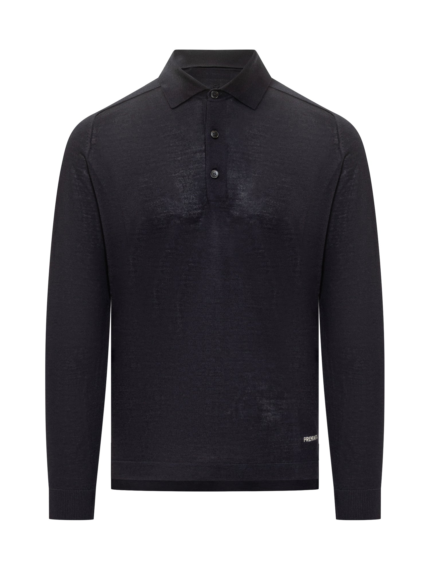 Premiata black long-sleeve polo sweater crafted from lightweight fabric. Features classic collar, three-button closure.