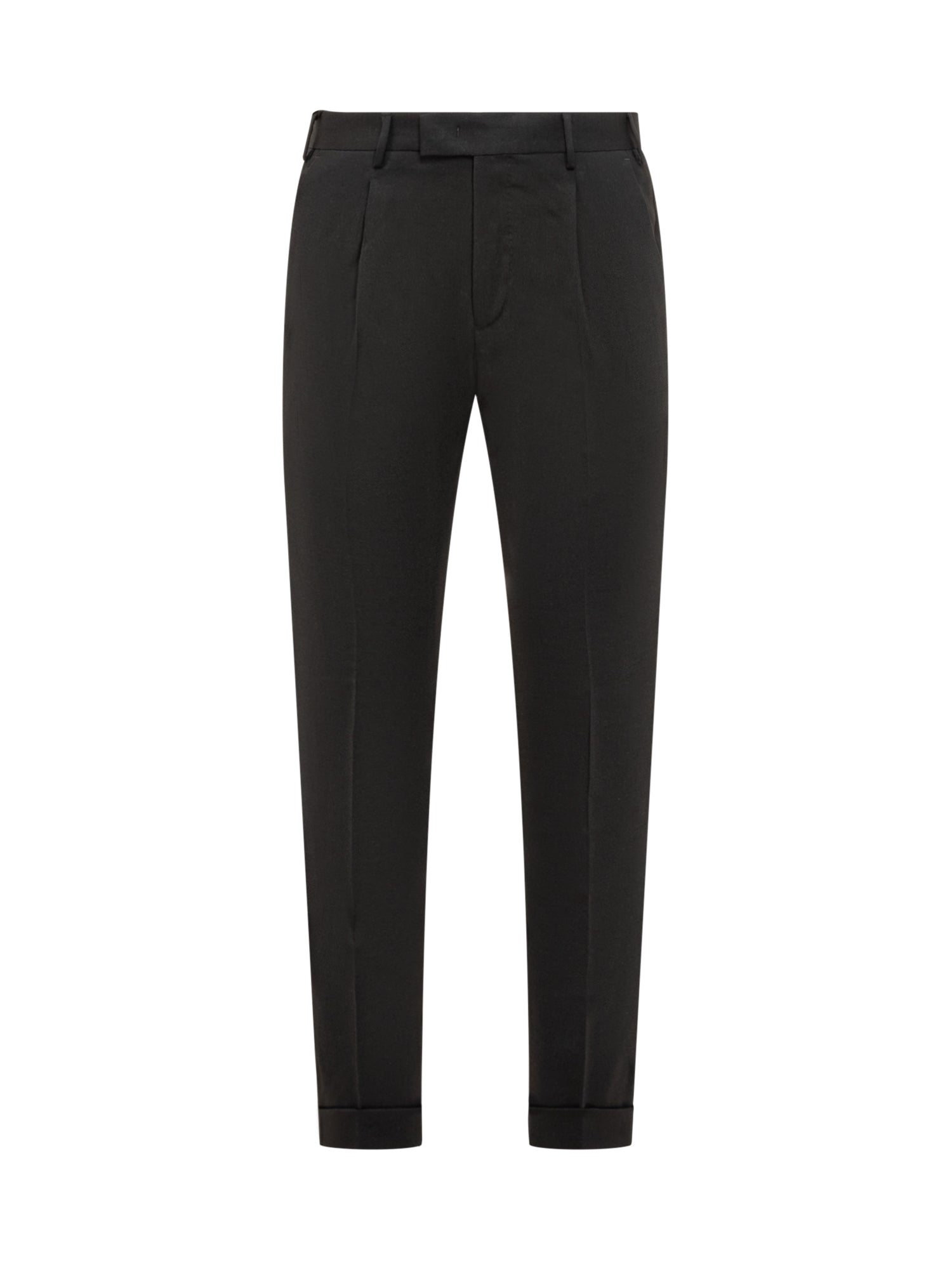 PT Torino black wool pants with front pleats and cuffed hems. Button and zip closure.