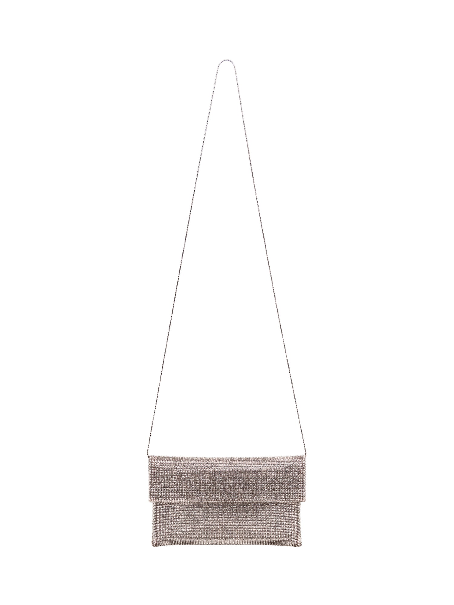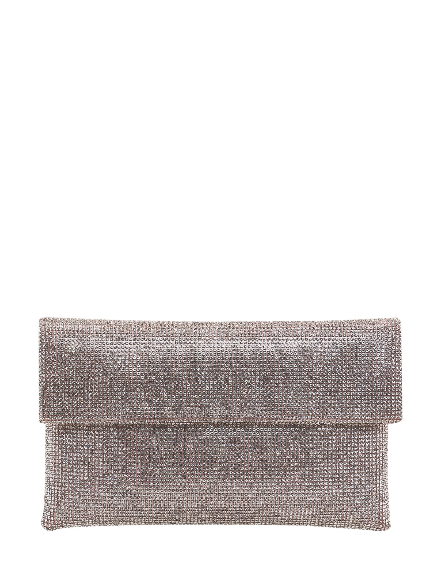 Soft clutch with flap closure and surface covered in rhinestones, elegant and luminous design