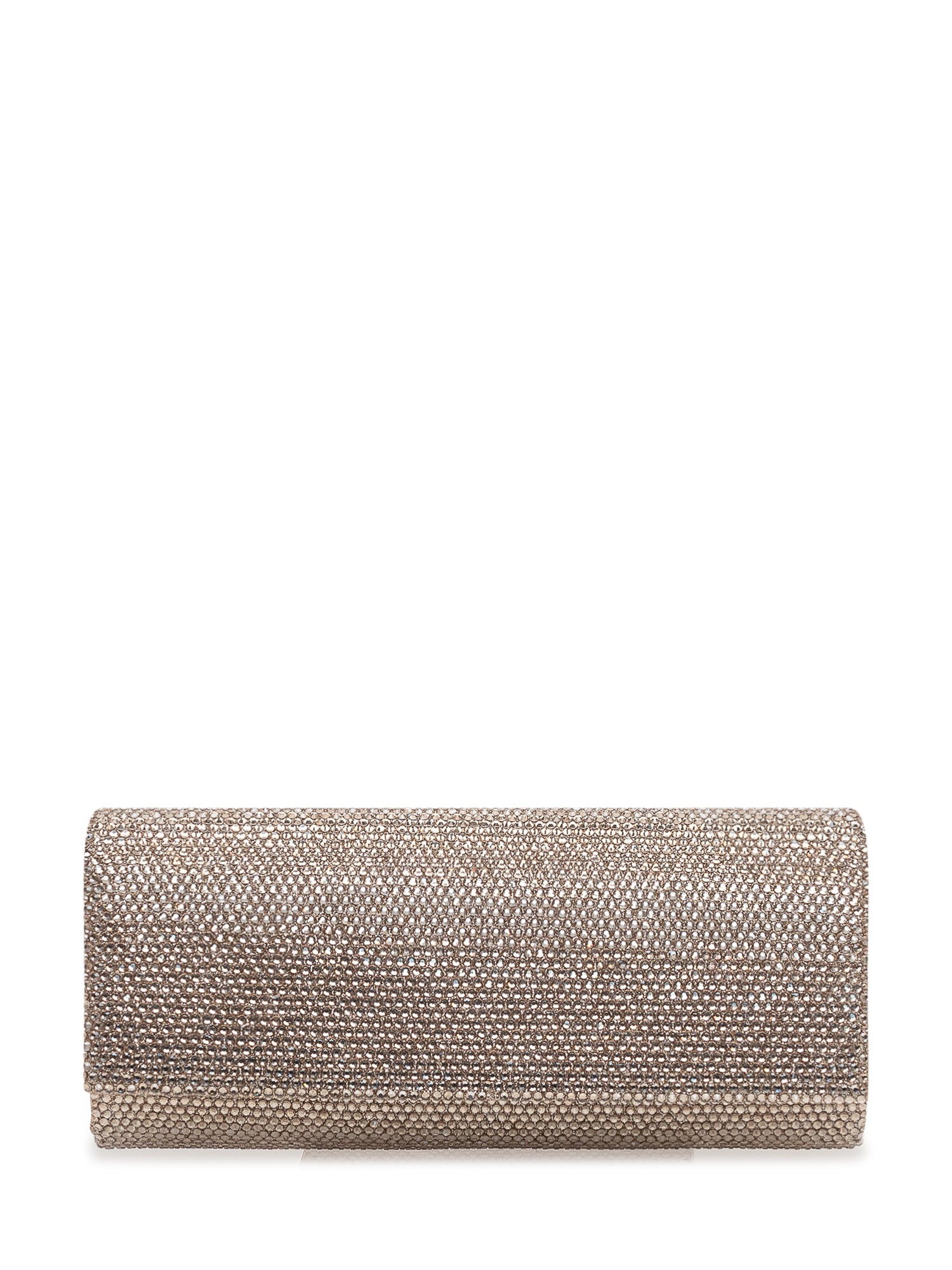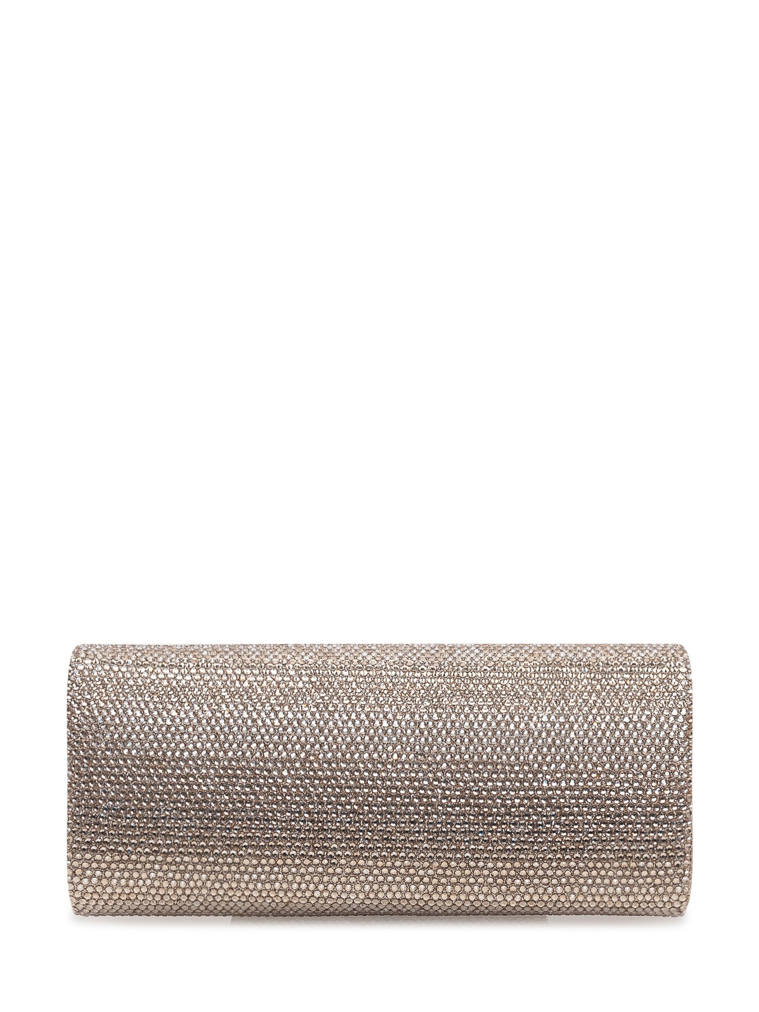 Hard-shell clutch covered in micro rhinestones with a rectangular silhouette, flap snap closure and a compact interior for essentials.Size: 8.66x3.54x1.57