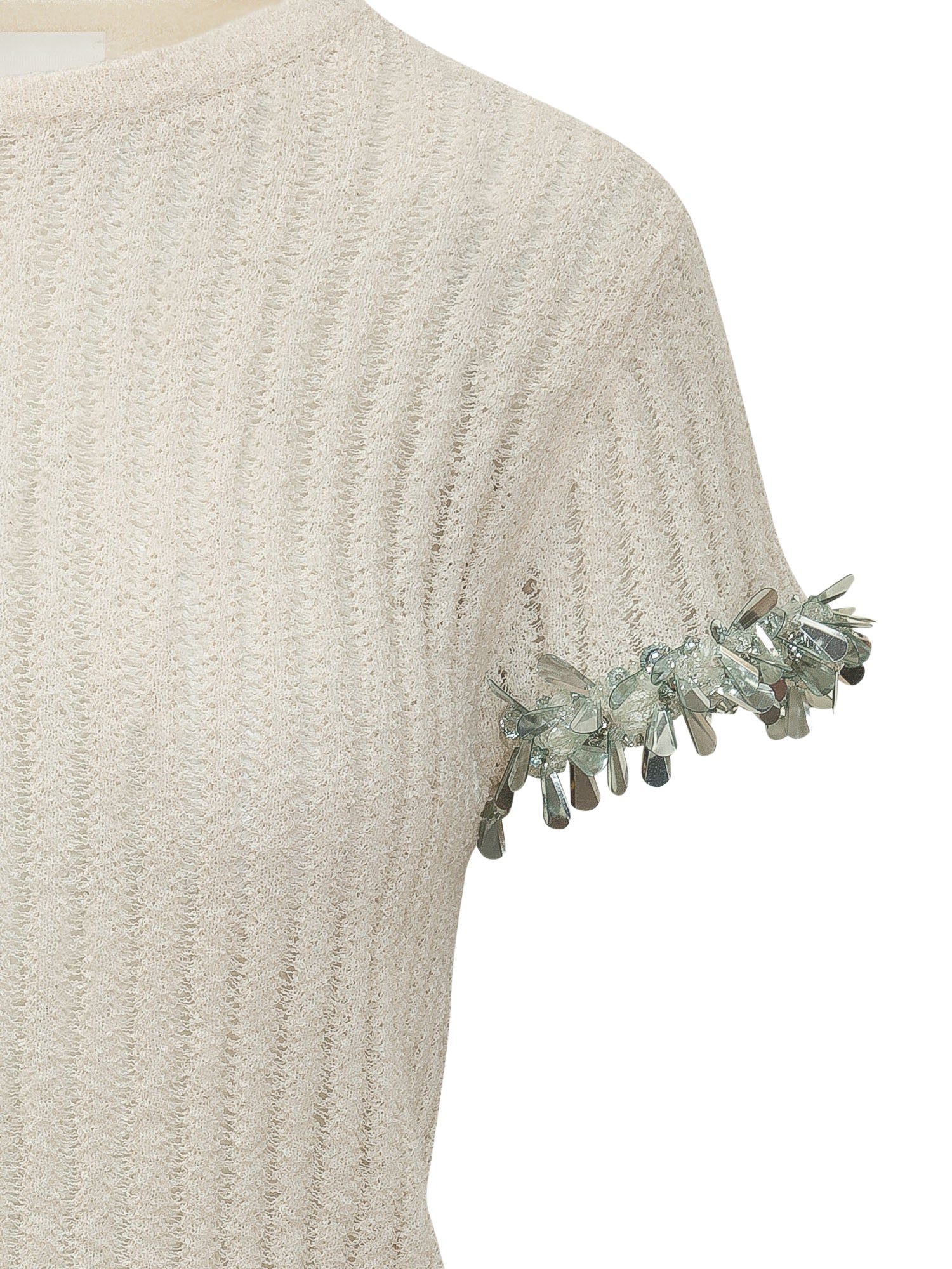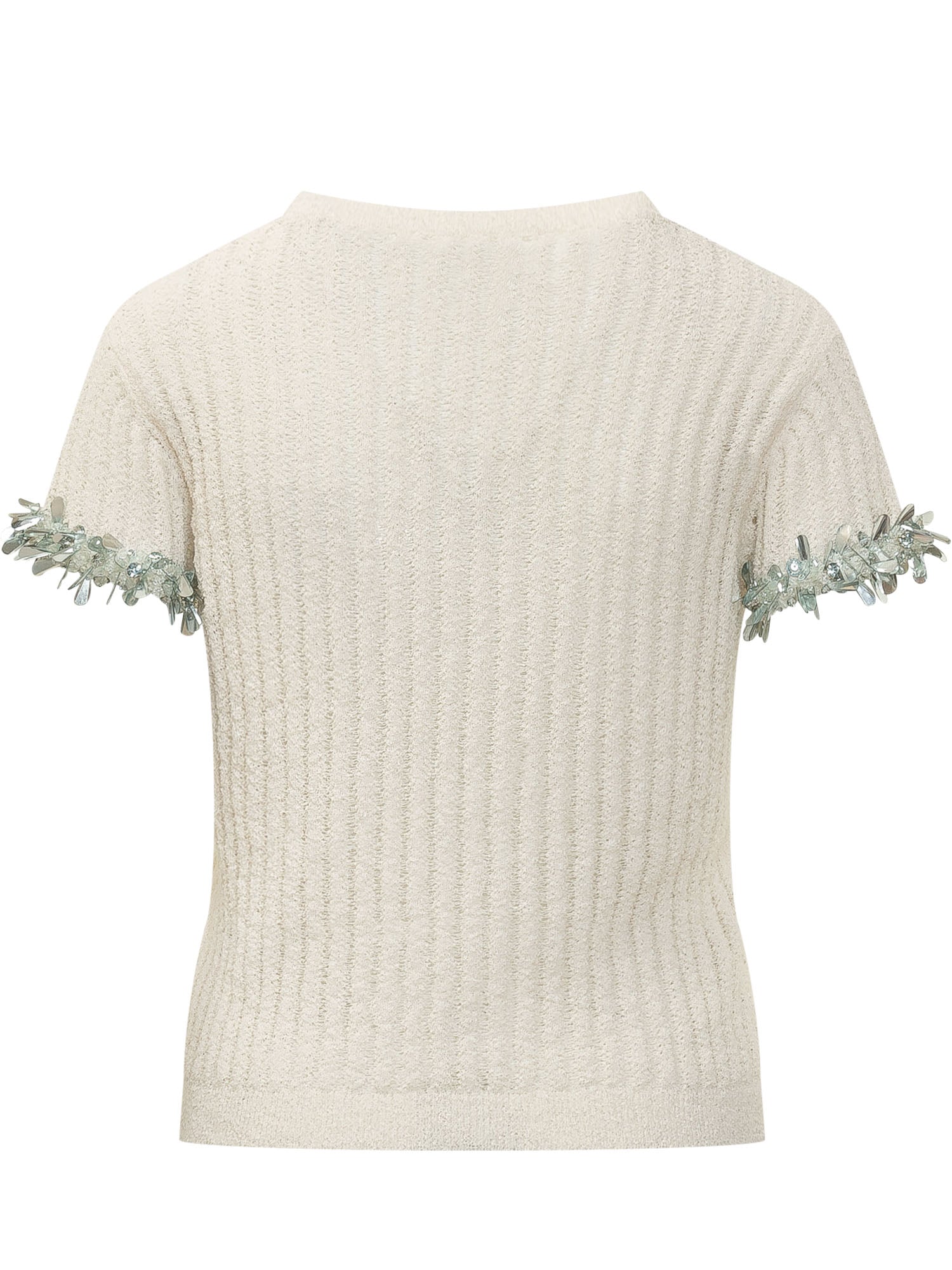 Short sleeve top with crew neck and ribbed texture. Design with decorative embellishments on the sleeves adding a luminous detail. Ideal for elegant looks and refined styling.