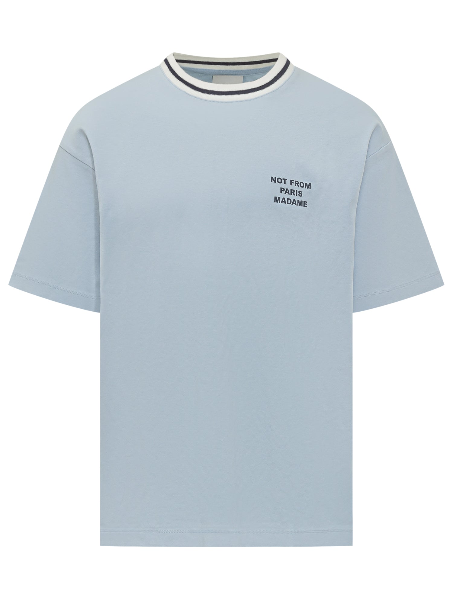 Oversized T-shirt with a minimal design, featuring a crew neck with contrast trims and a text print on the chest. Relaxed silhouette and contemporary style.