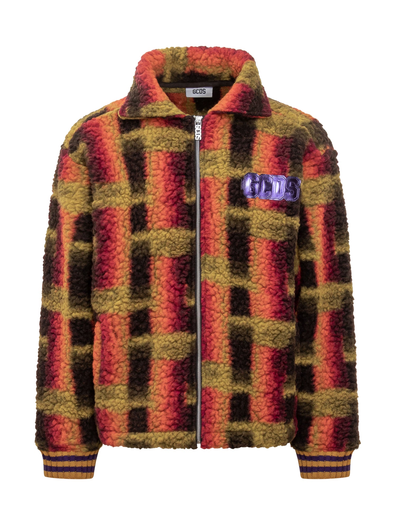 GCDS sherpa jacket with multicolor check pattern. Featuring a front zip and logo patch on the chest.