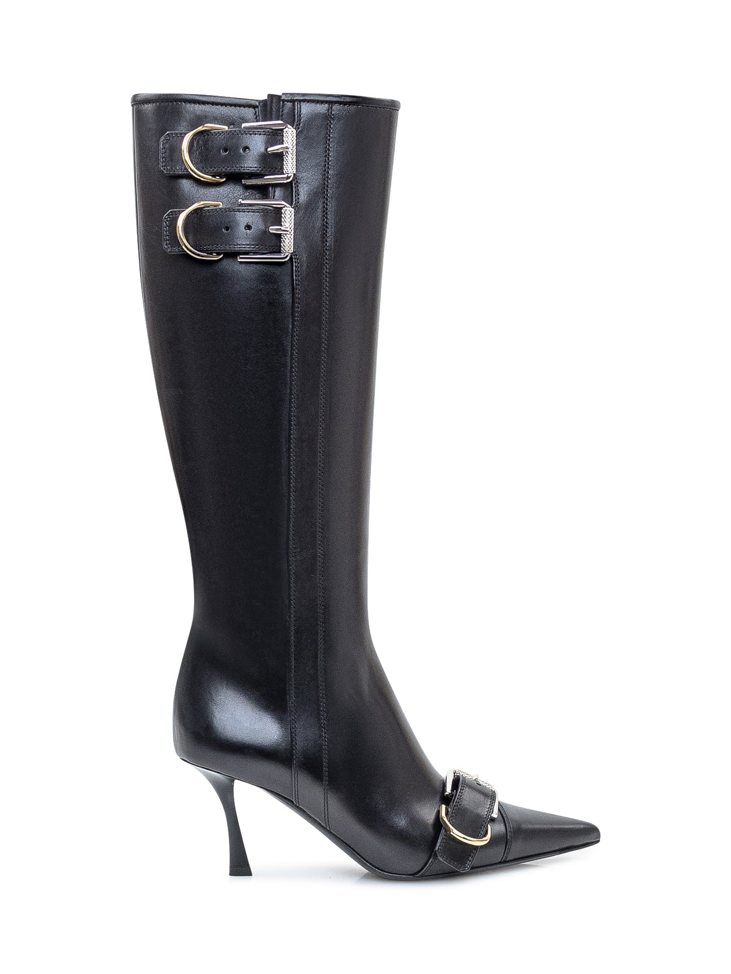 High boot in black leather. Pointed toe design. Stiletto heel. Buckles on the tip and side. Zip closure.
