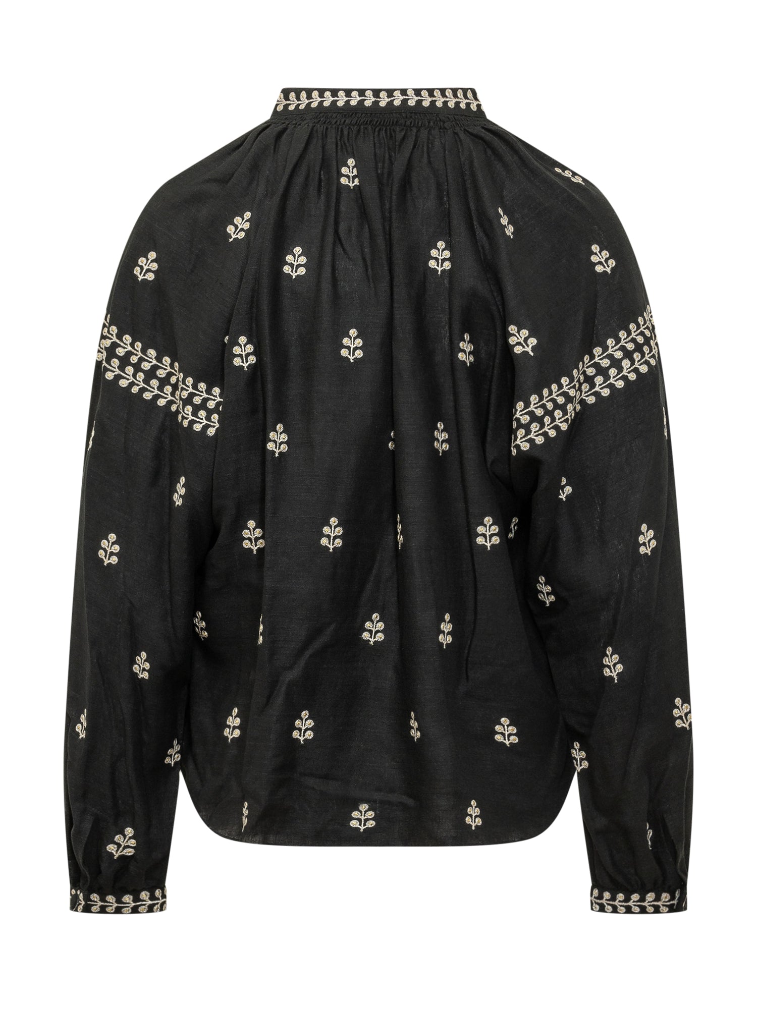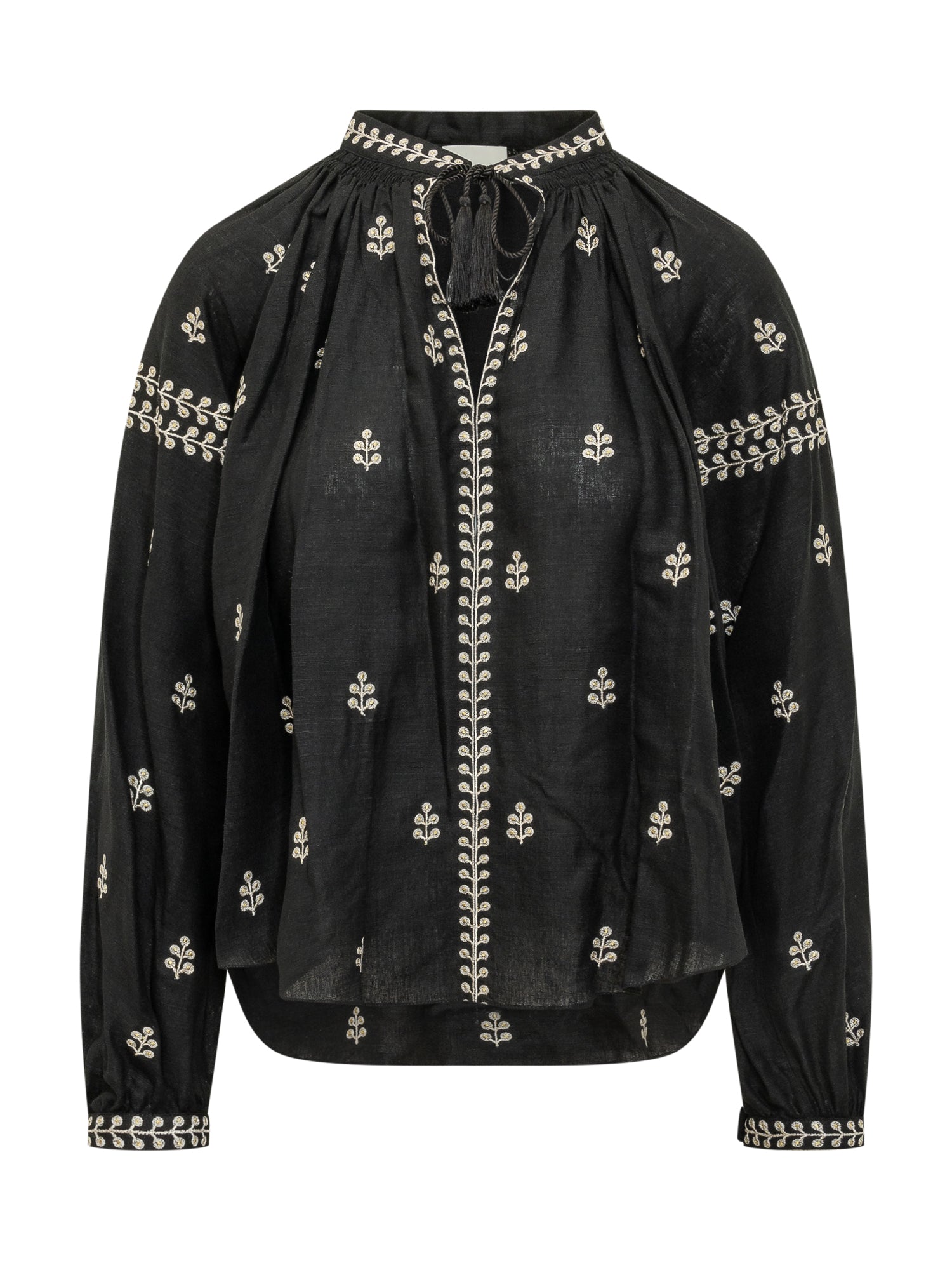 Long sleeve blouse with gathered neckline and tie closure. All over embroidery and finished cuffs create a refined look.