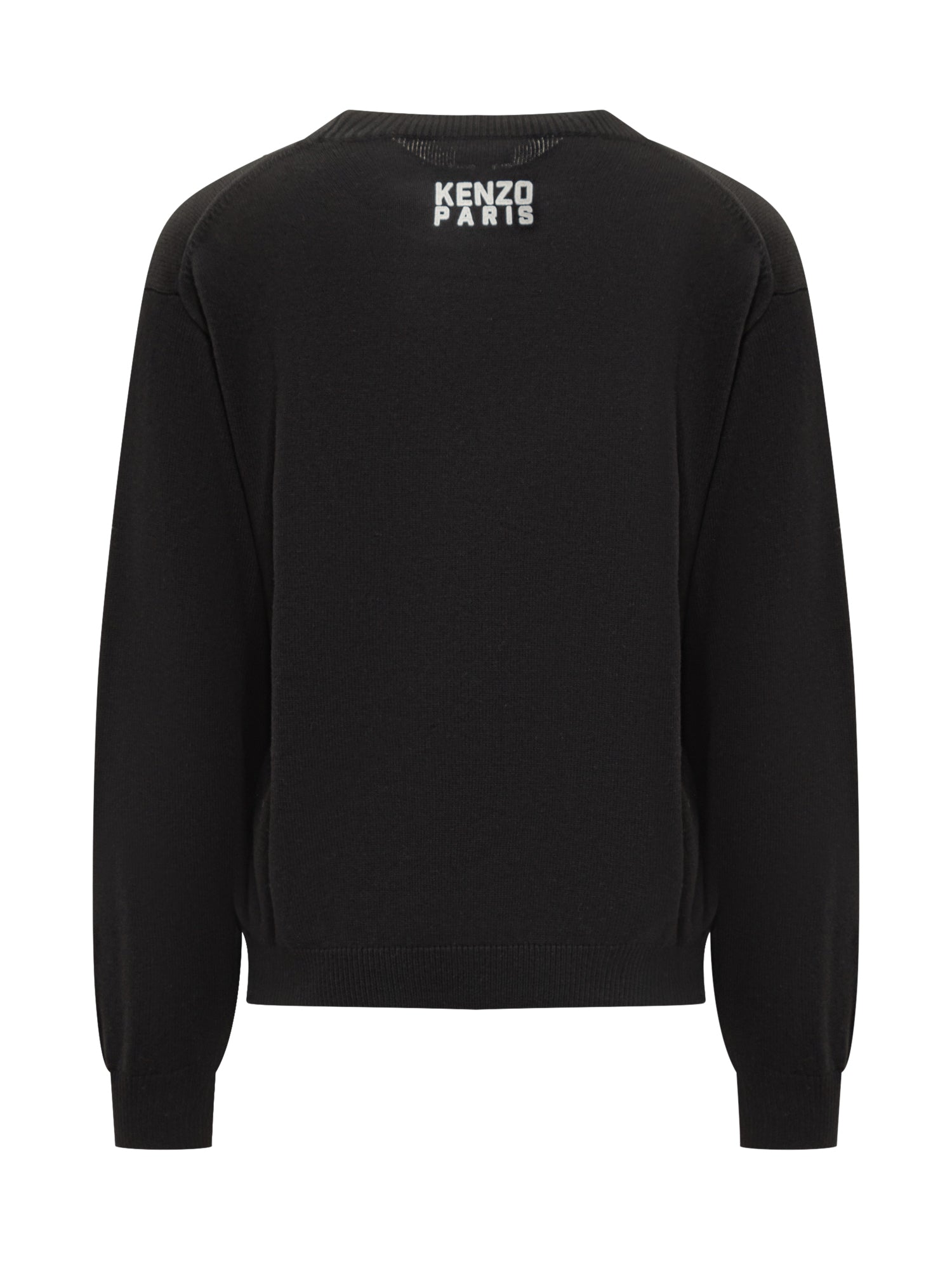 Kenzo black wool sweater featuring iconic tiger motif and Kenzo Paris lettering.