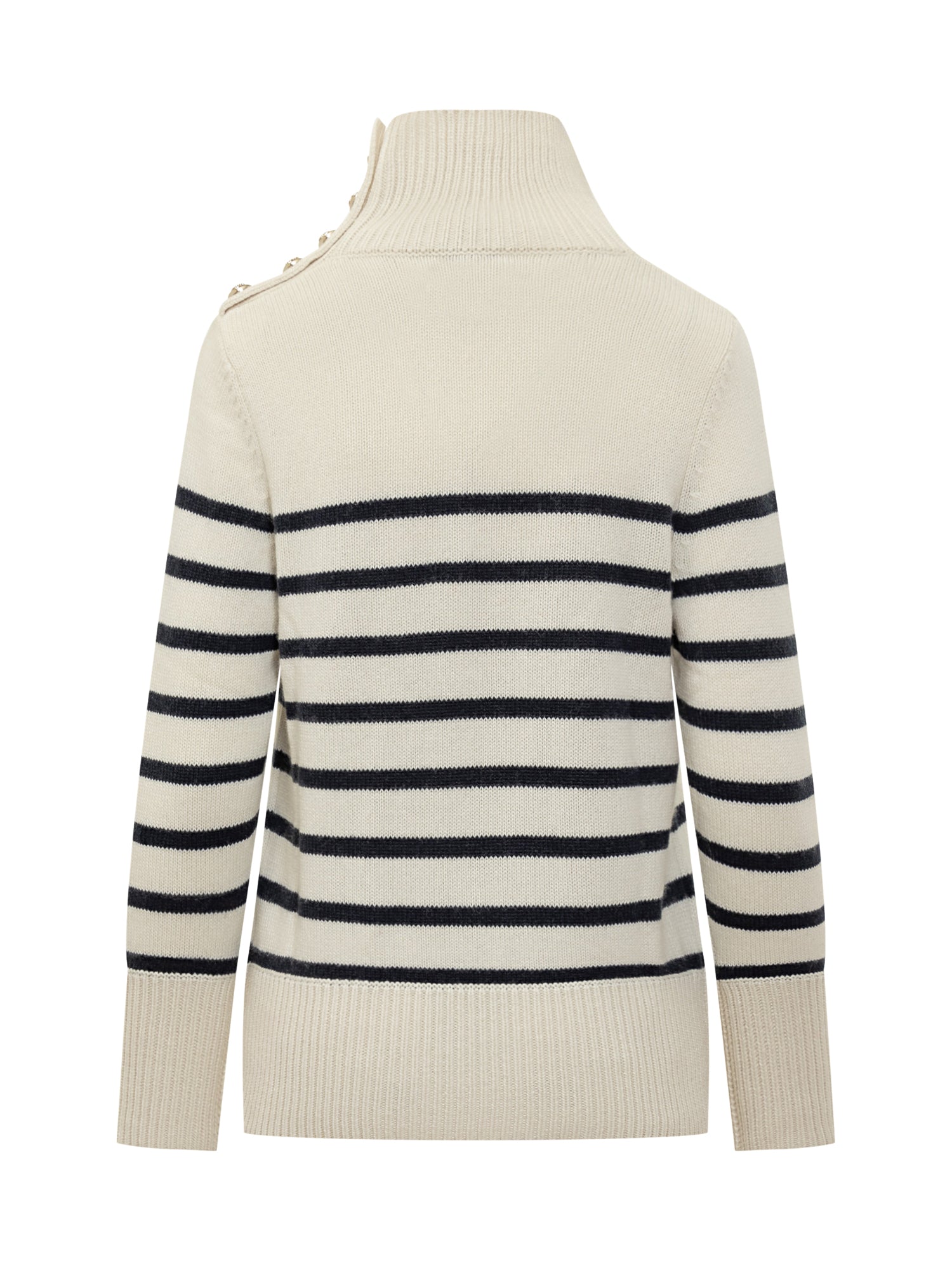 Kujten striped white and blue cashmere sweater with turtleneck and gold buttons on the shoulder.