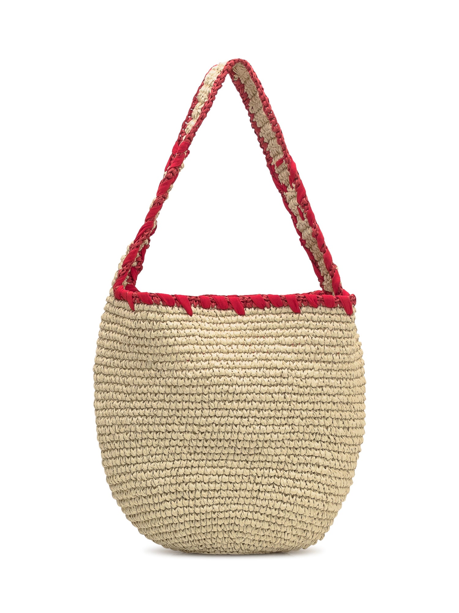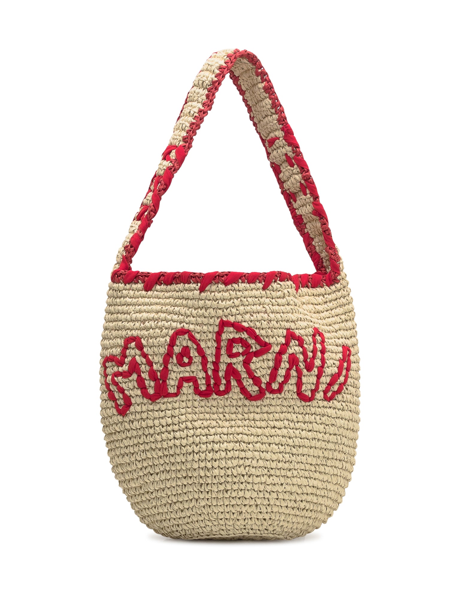 Marni bag in natural woven raffia with red embroidered logo and matching braided handle.