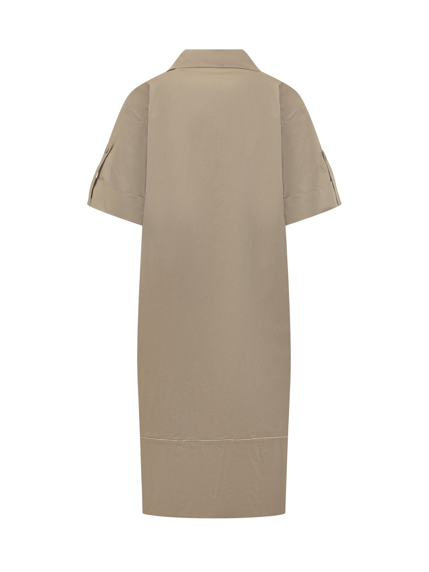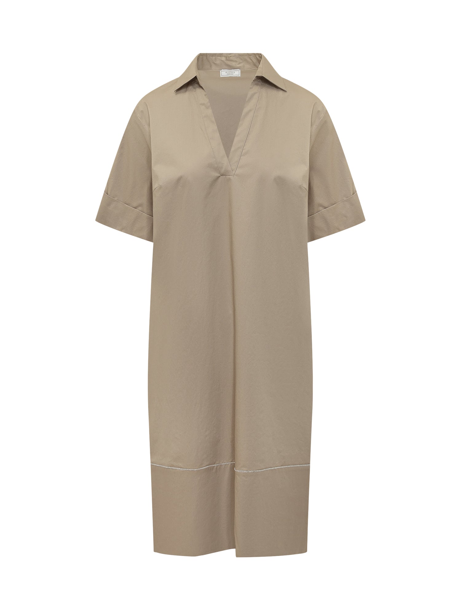 Midi dress with a fluid silhouette and relaxed fit, featuring a V-neck finished with a classic collar. Short sleeves with turn-up cuffs and straight hem. Crafted from lightweight satin with a smooth, refined finish.