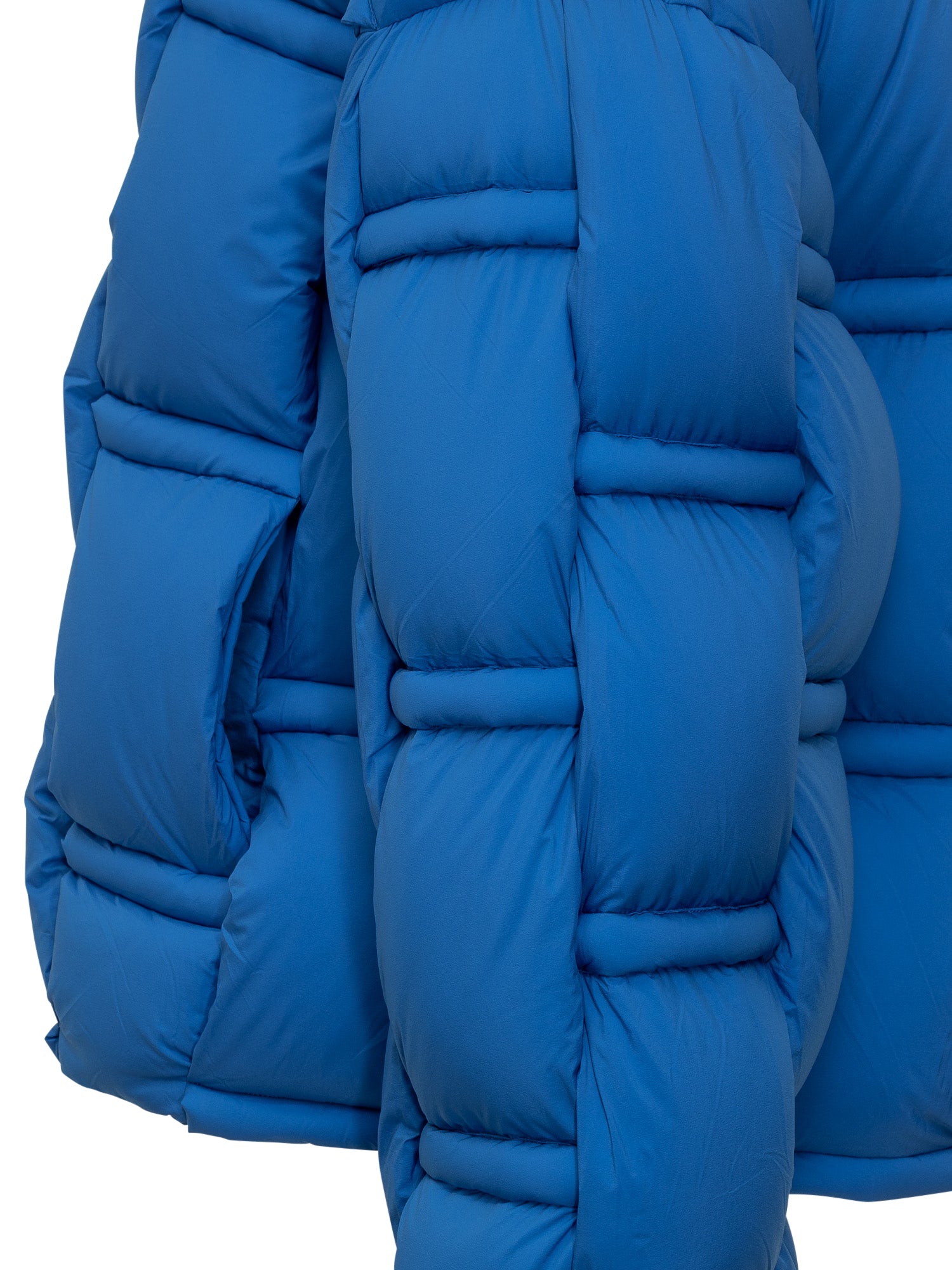 Raxxy oversized blue puffer with geometric quilting and high collar.