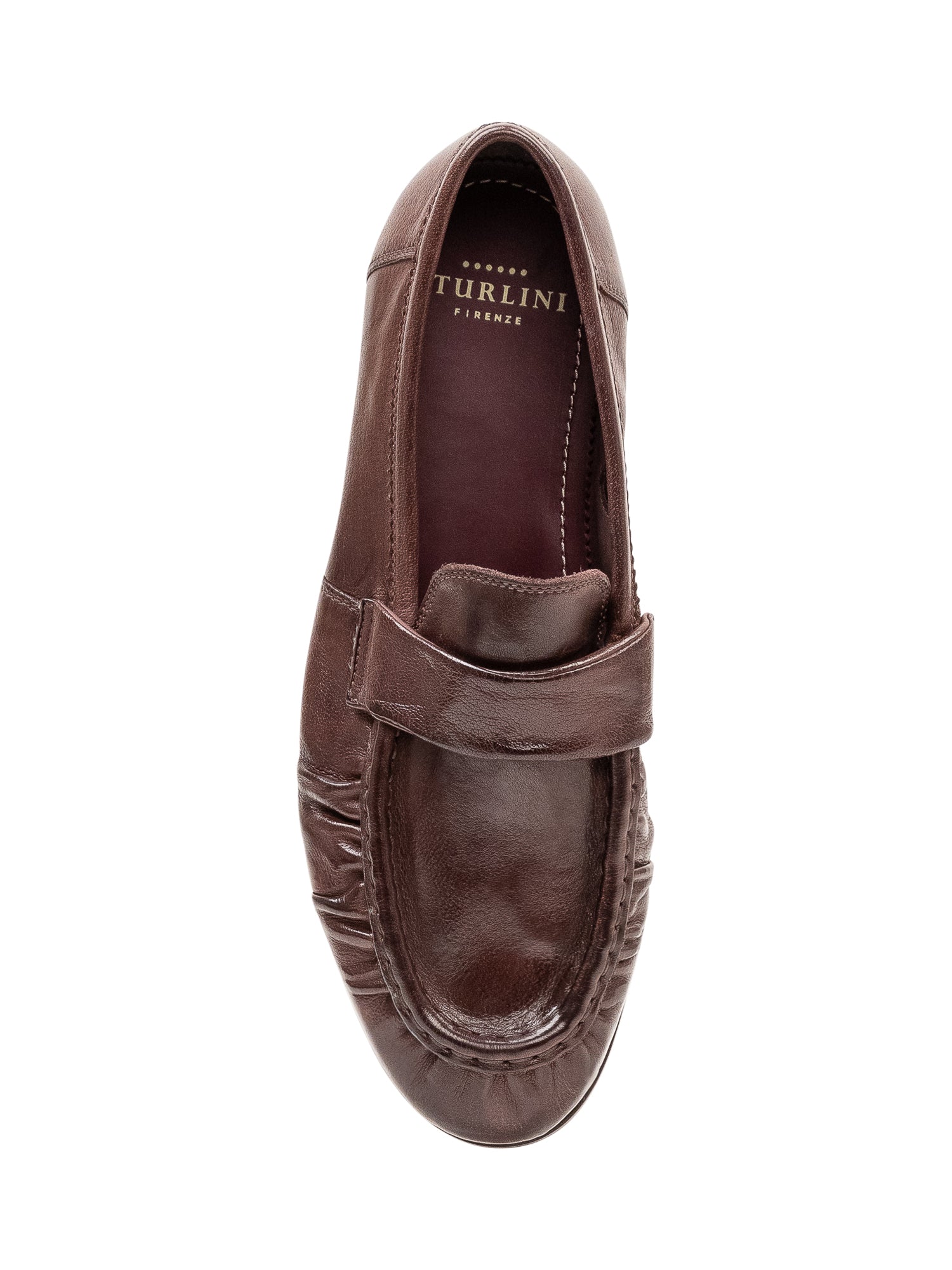 Loafer with rounded toe, visible stitching and strap on the upper, low sole