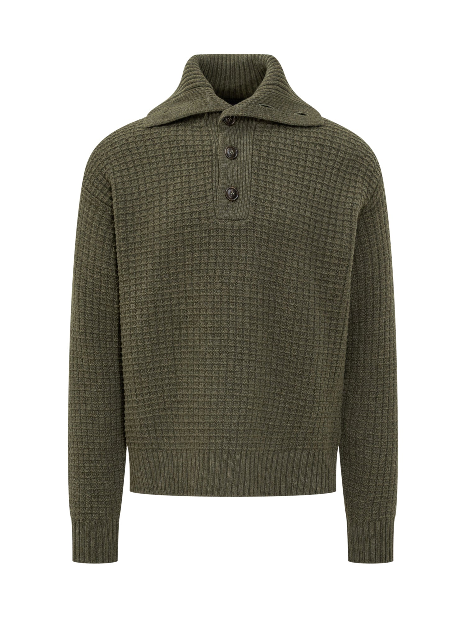 Woolrich green wool waffle-knit sweater with collar and three-button closure.