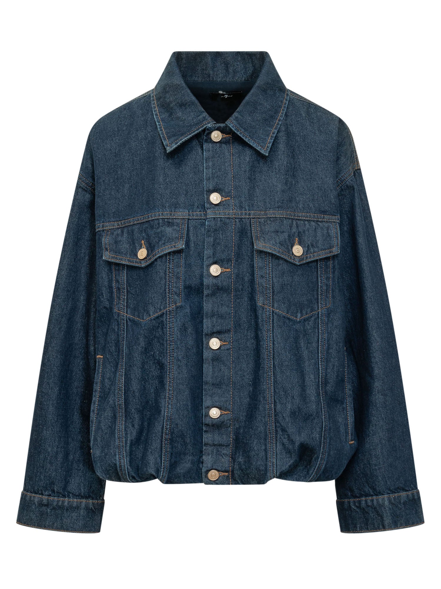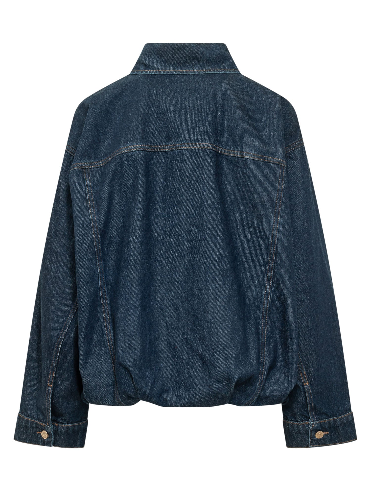 Denim jacket with classic collar and front button closure, flap patch pockets and gathered hem, structured design with visible stitching