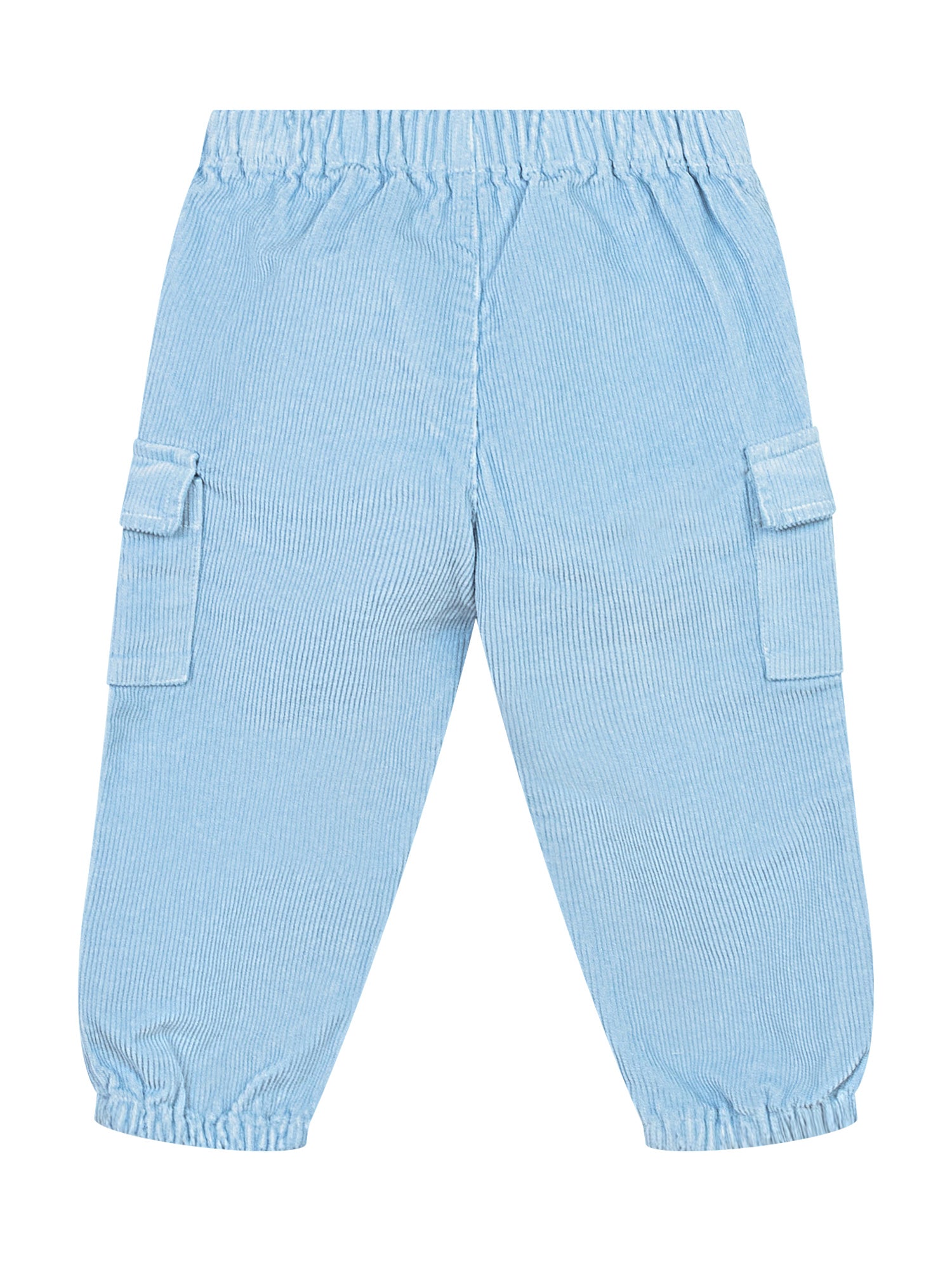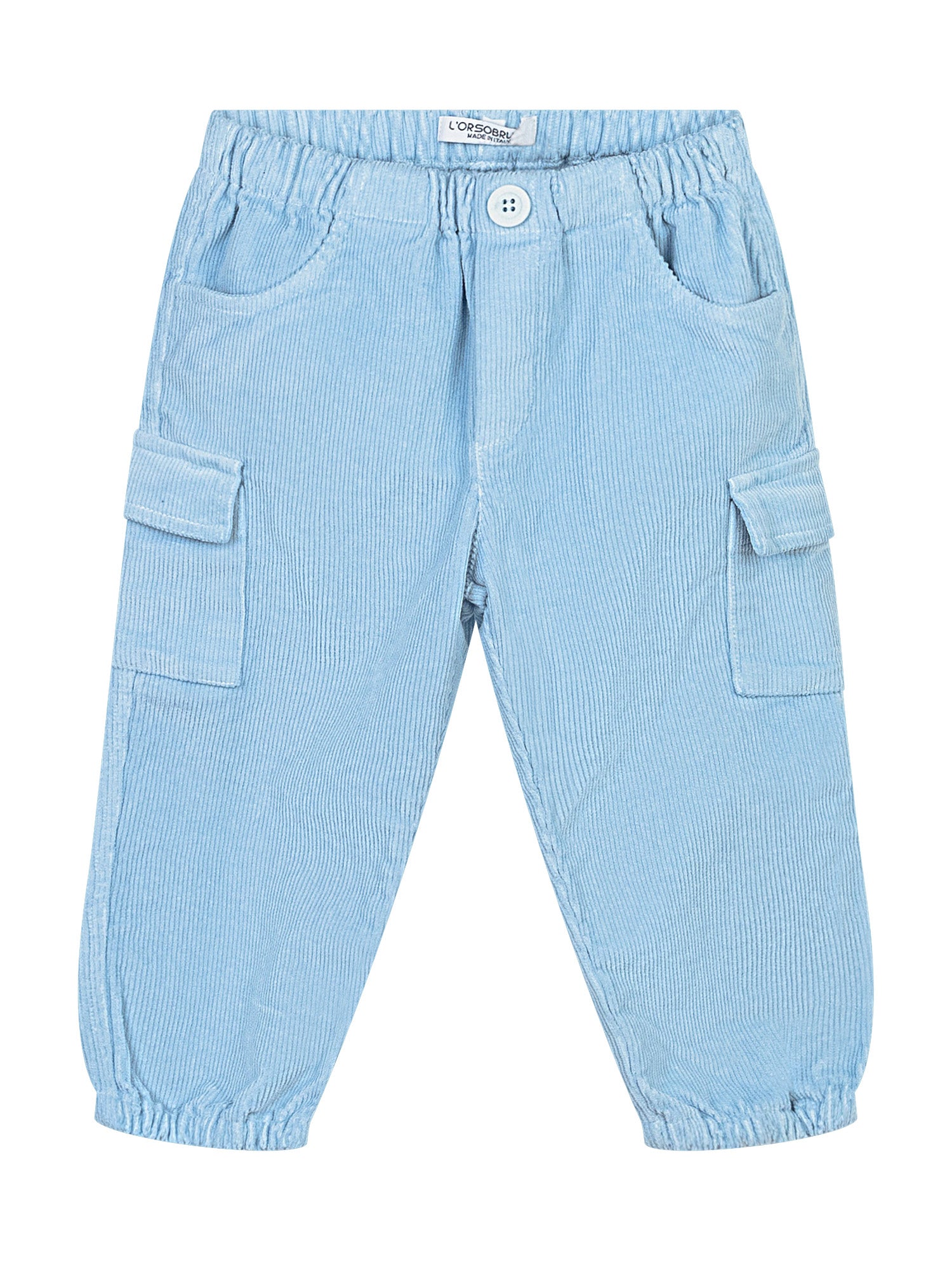 L Orso Bruno corduroy pants in light blue with side cargo pockets, elastic waist and cuffs.