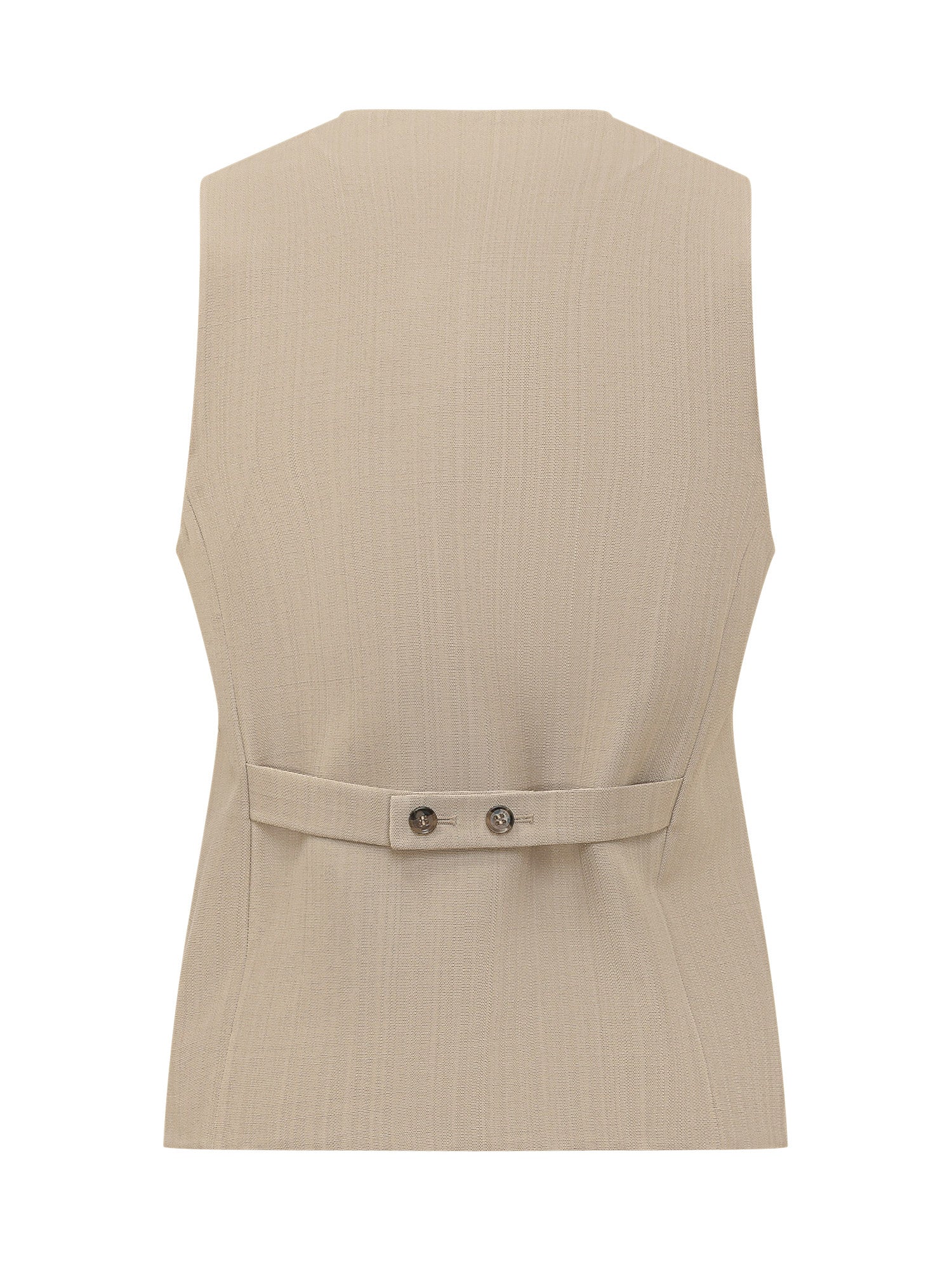 Womens tailored vest, high neck and sleeveless design, front button closure, welt pockets, structured silhouette.