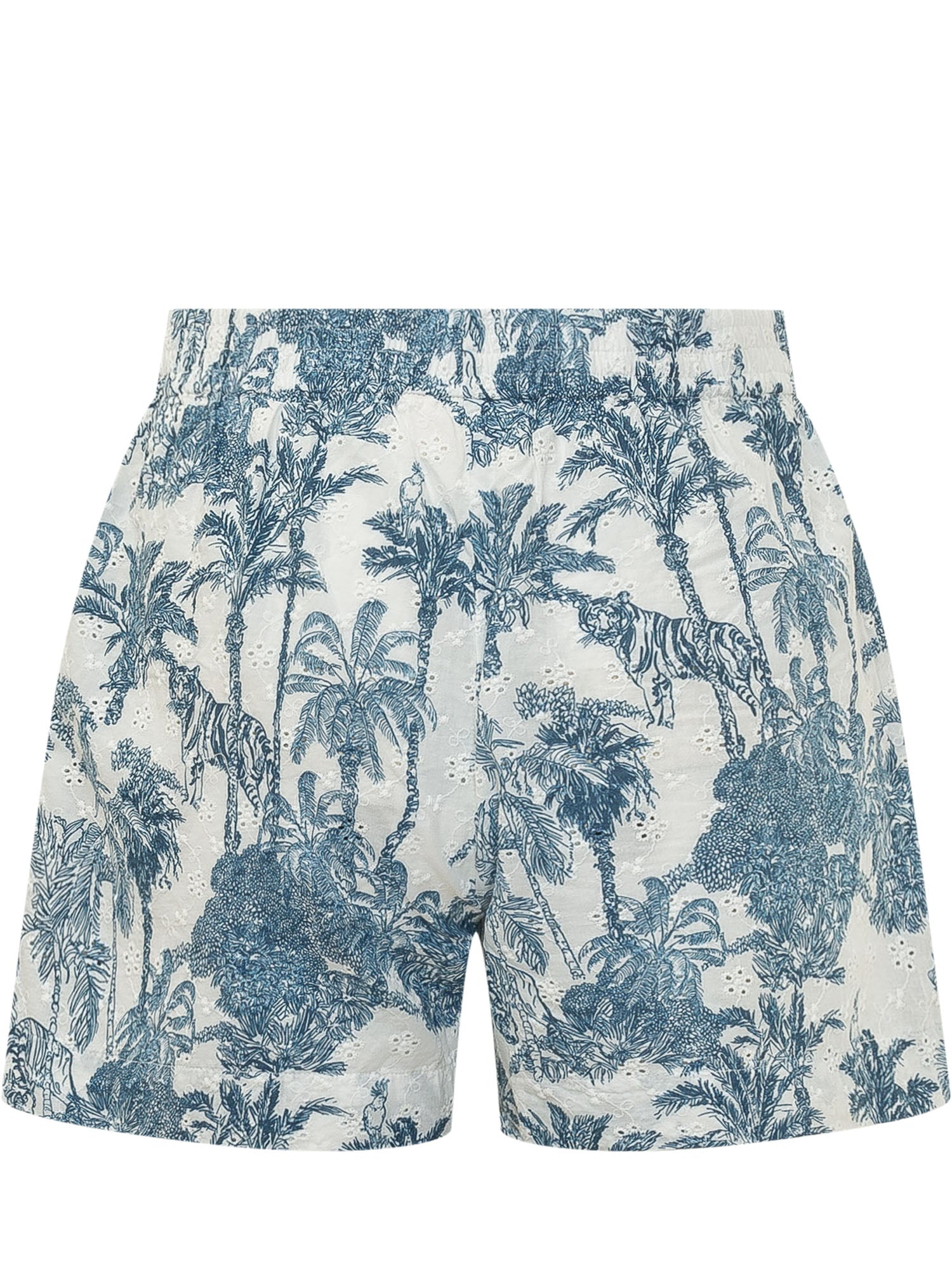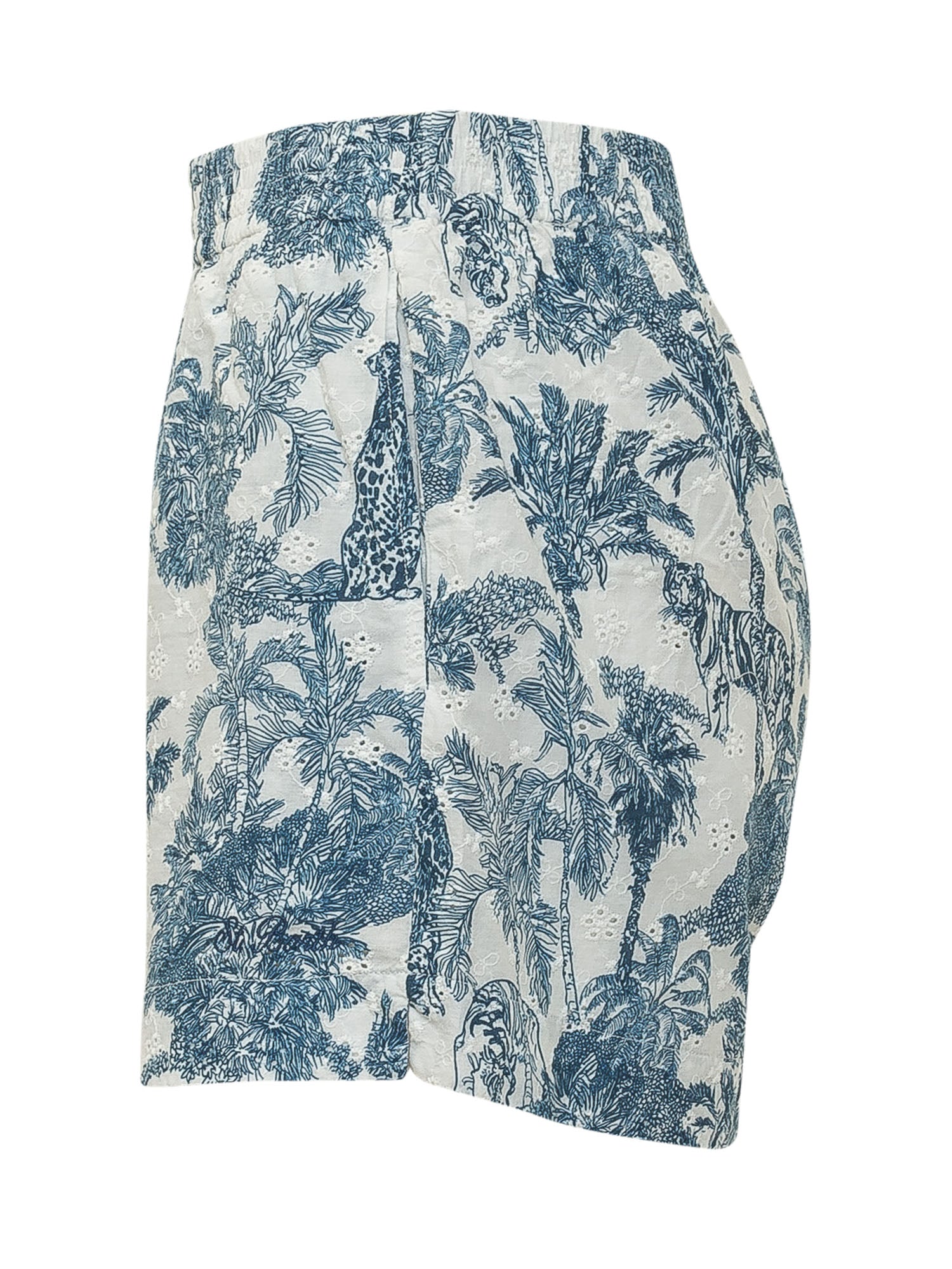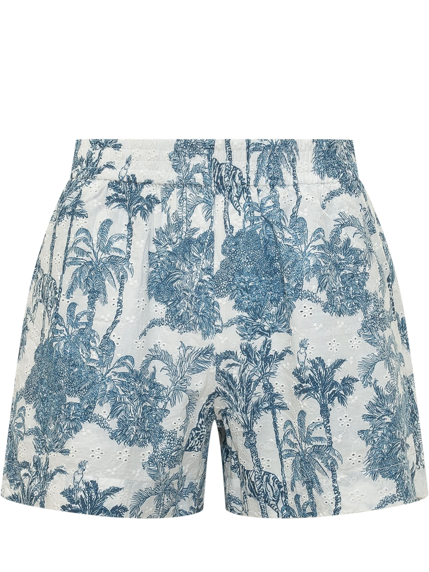 Lightweight shorts crafted from fabric featuring a refined tropical toile print in blue tones on a light background, depicting palm trees and natural motifs. Designed with an elasticated waistband for optimal comfort and a relaxed silhouette that adds movement. Ideal for fresh and sophisticated summer looks.