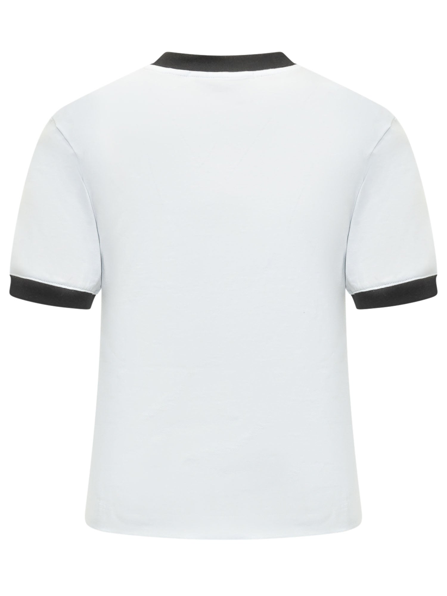 Short-sleeve cotton T-shirt featuring a crew neck with contrasting trims on the collar and sleeves. Designed with a graphic chest print combining the logo and a heart motif for a casual and distinctive look.