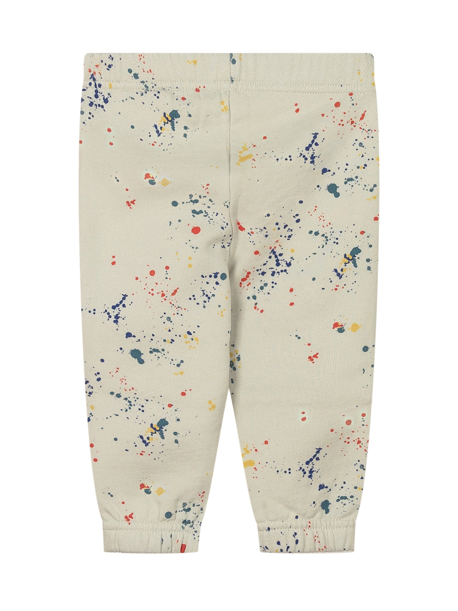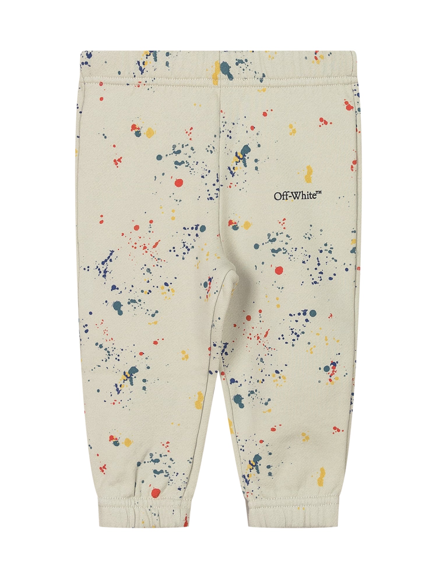 Off-White kids pants in beige cotton with elastic waistband and colorful splash print.