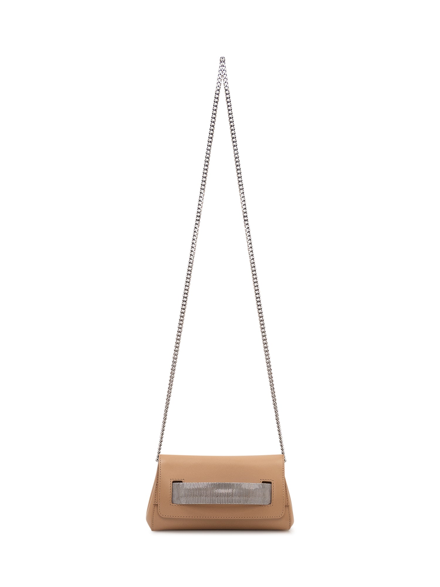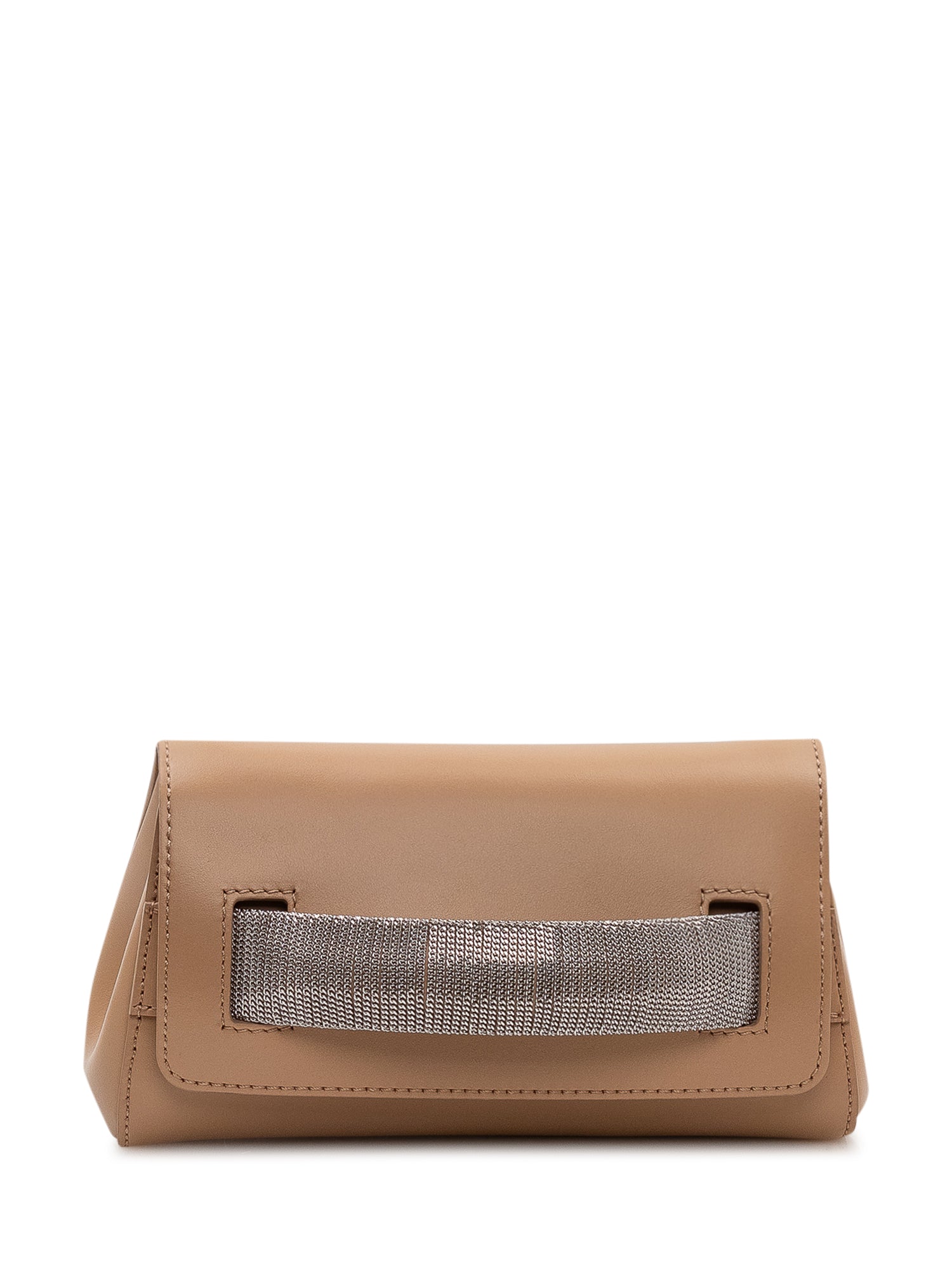 Compact and structured leather clutch bag featuring a top flap and a front metal chain handle for a modern and sophisticated touch. Perfect for completing elegant or evening looks.