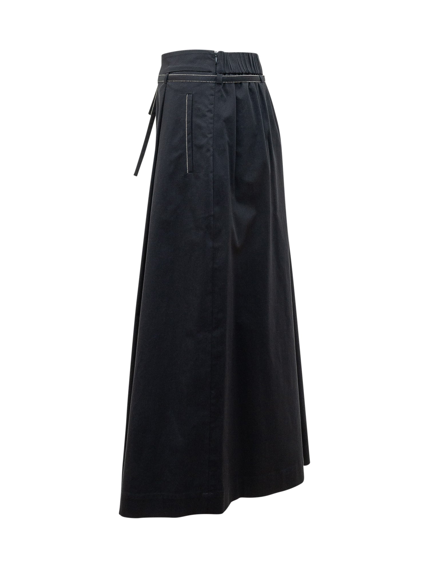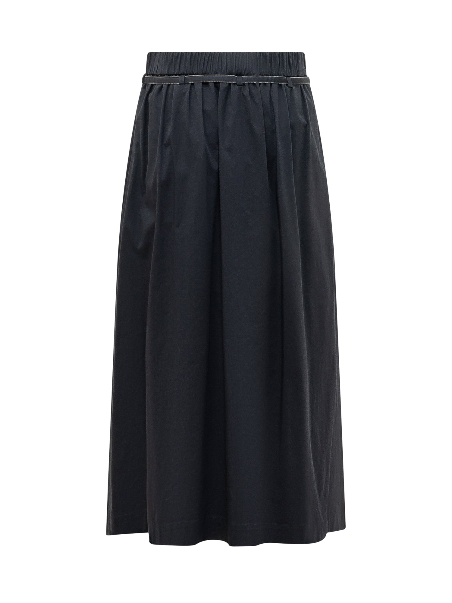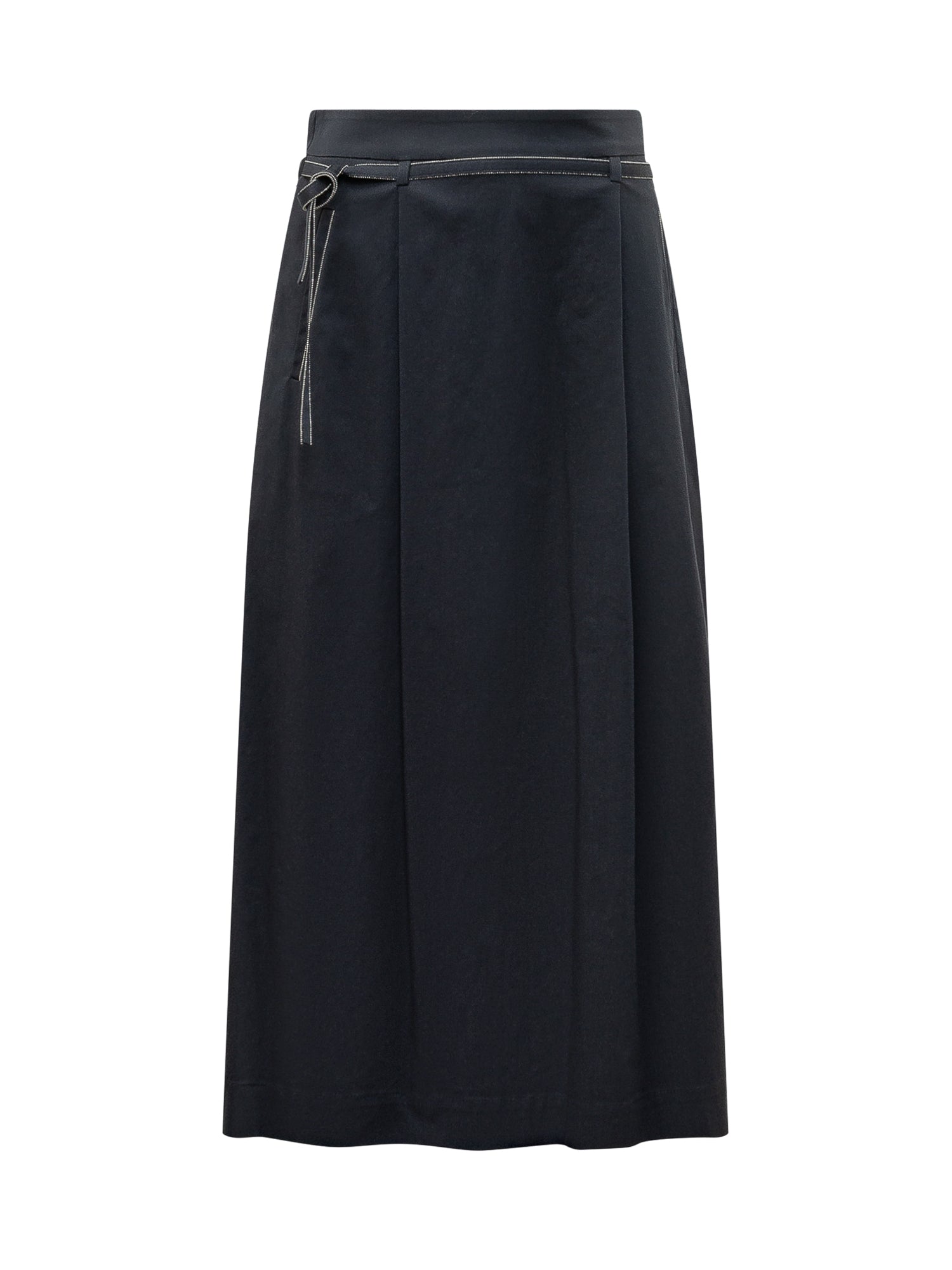 Long gabardine skirt with wide silhouette and front pleats. Slim belt with loops and concealed side closure. Flowing design ideal for elegant and contemporary looks.
