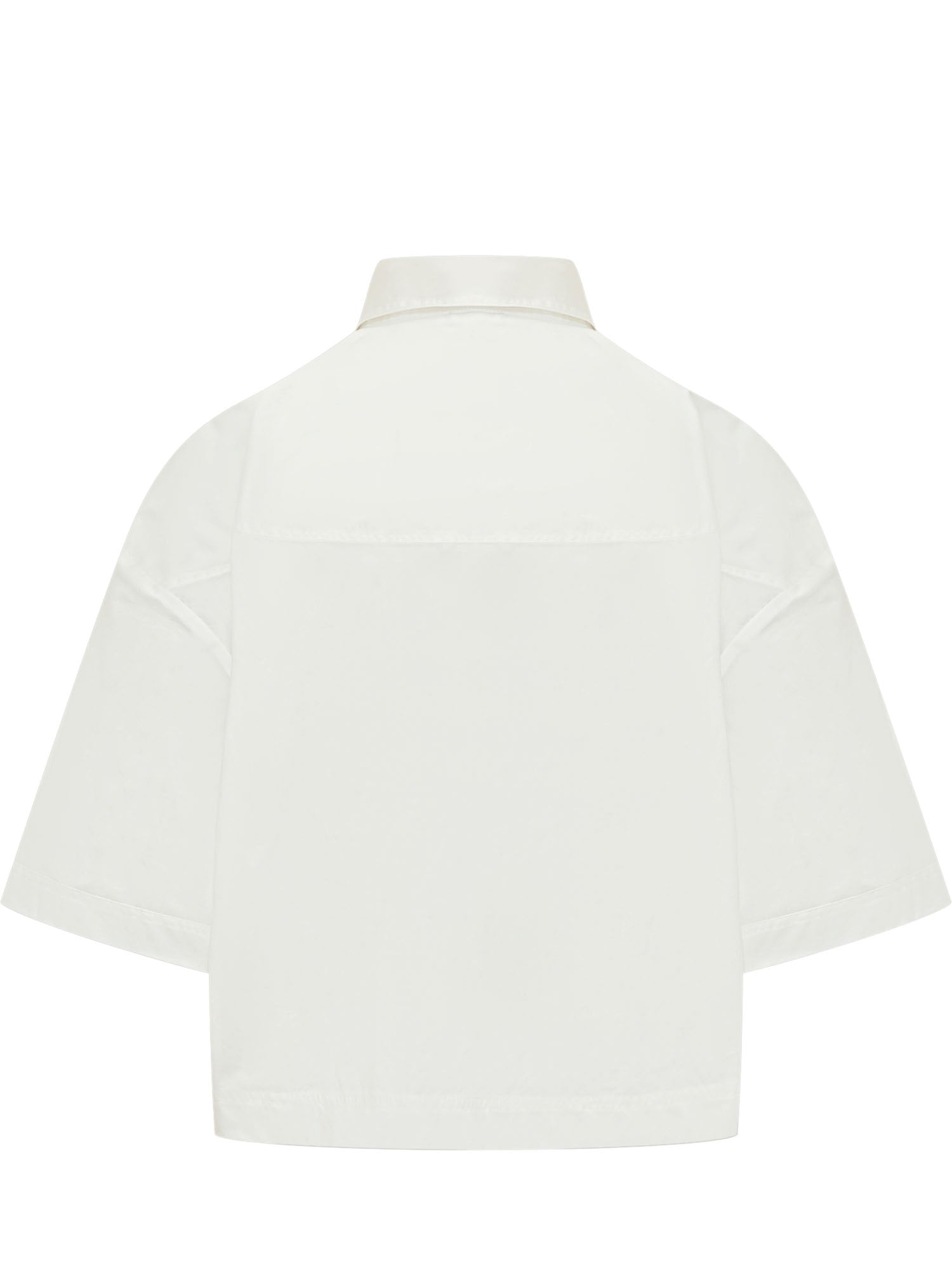 Cropped short sleeve shirt with concealed front closure and collar featuring metal decorative details, relaxed silhouette