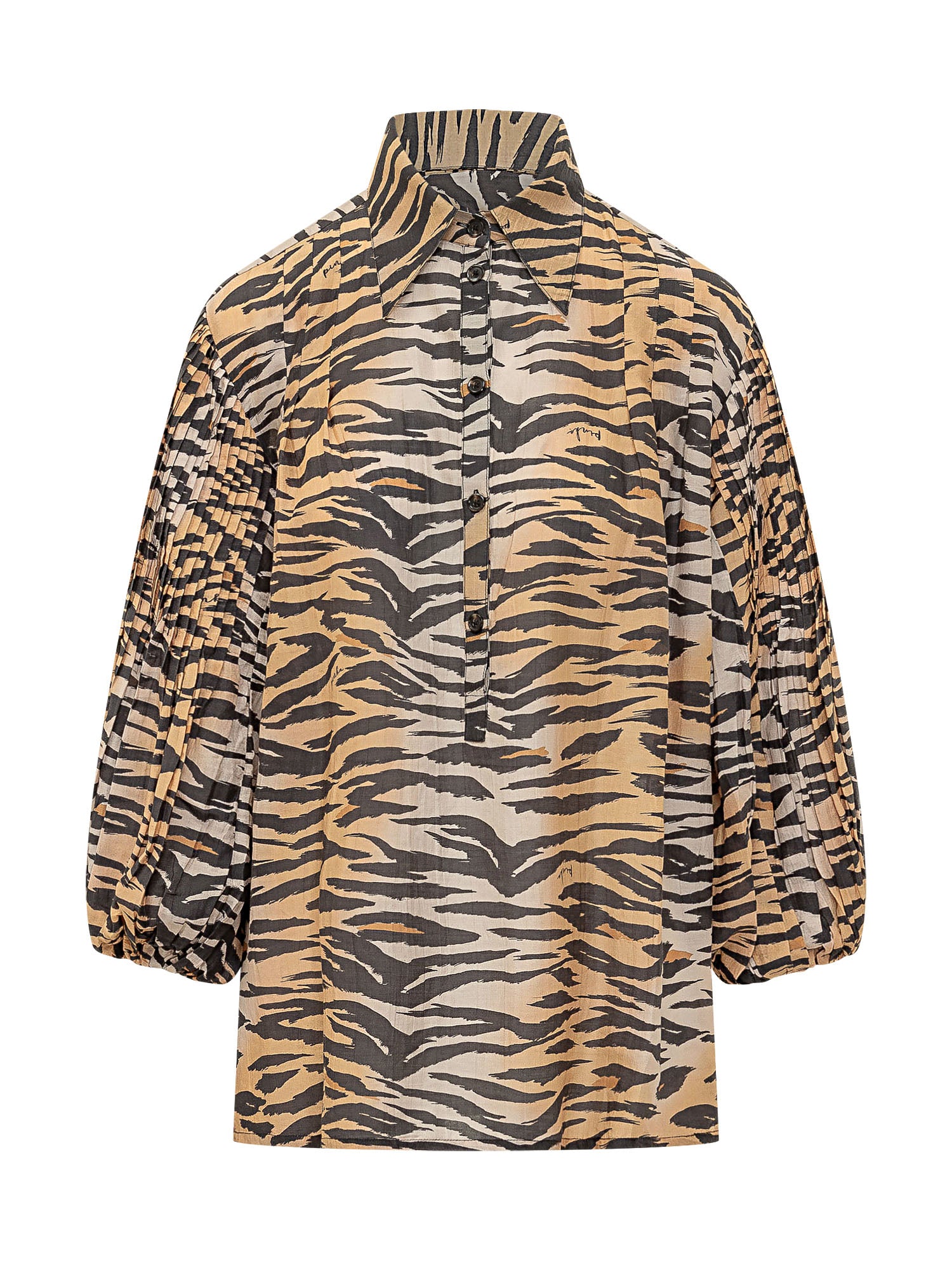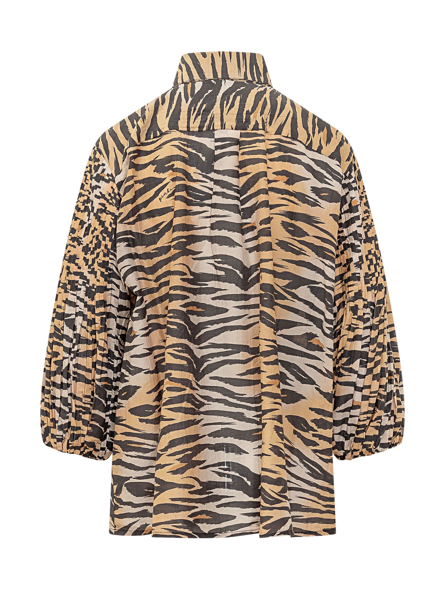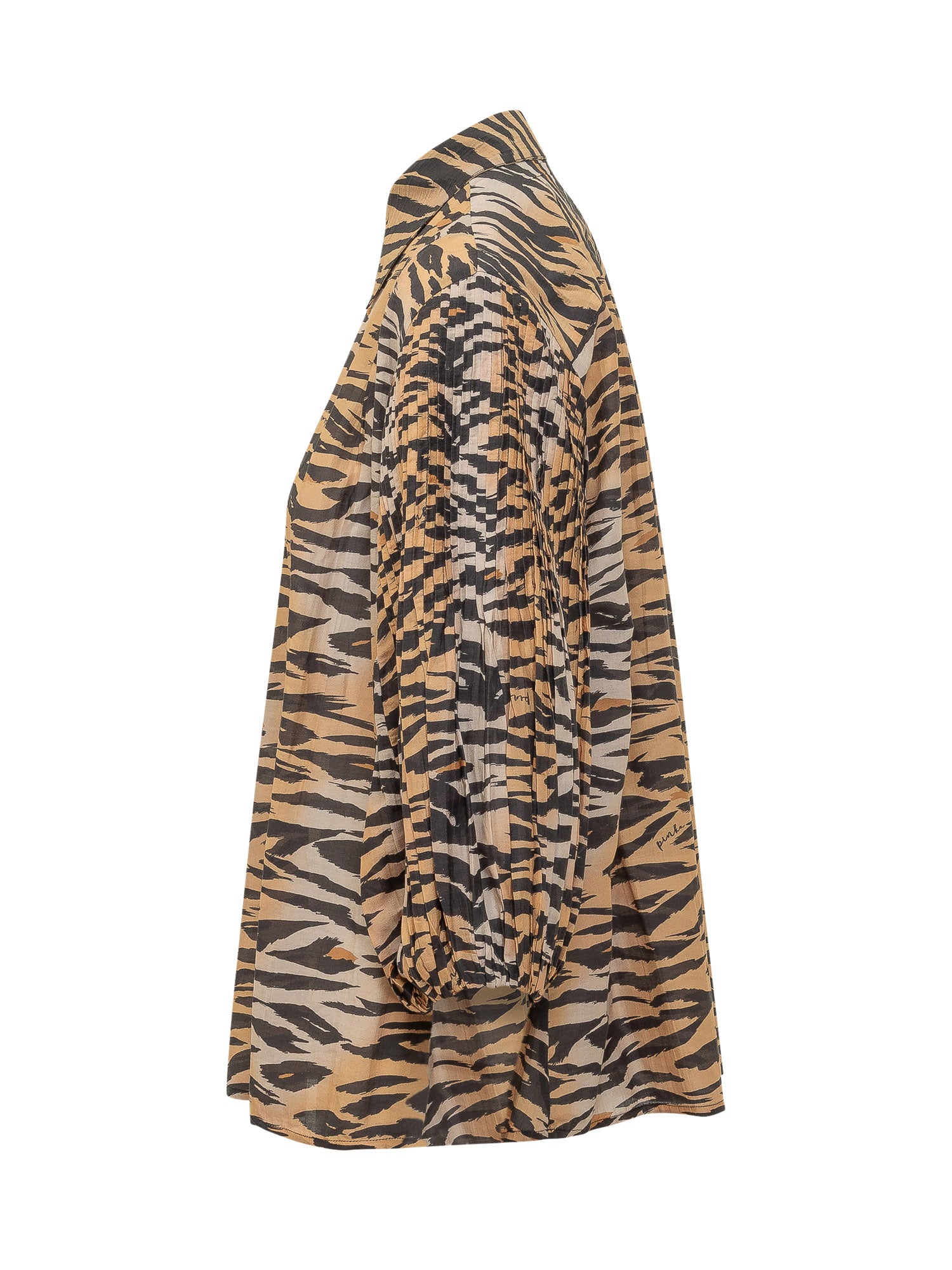 Voile blouse with animal print, classic collar and front button closure. Long voluminous sleeves with elastic cuffs and pleated detailing. Relaxed silhouette ideal for refined looks.