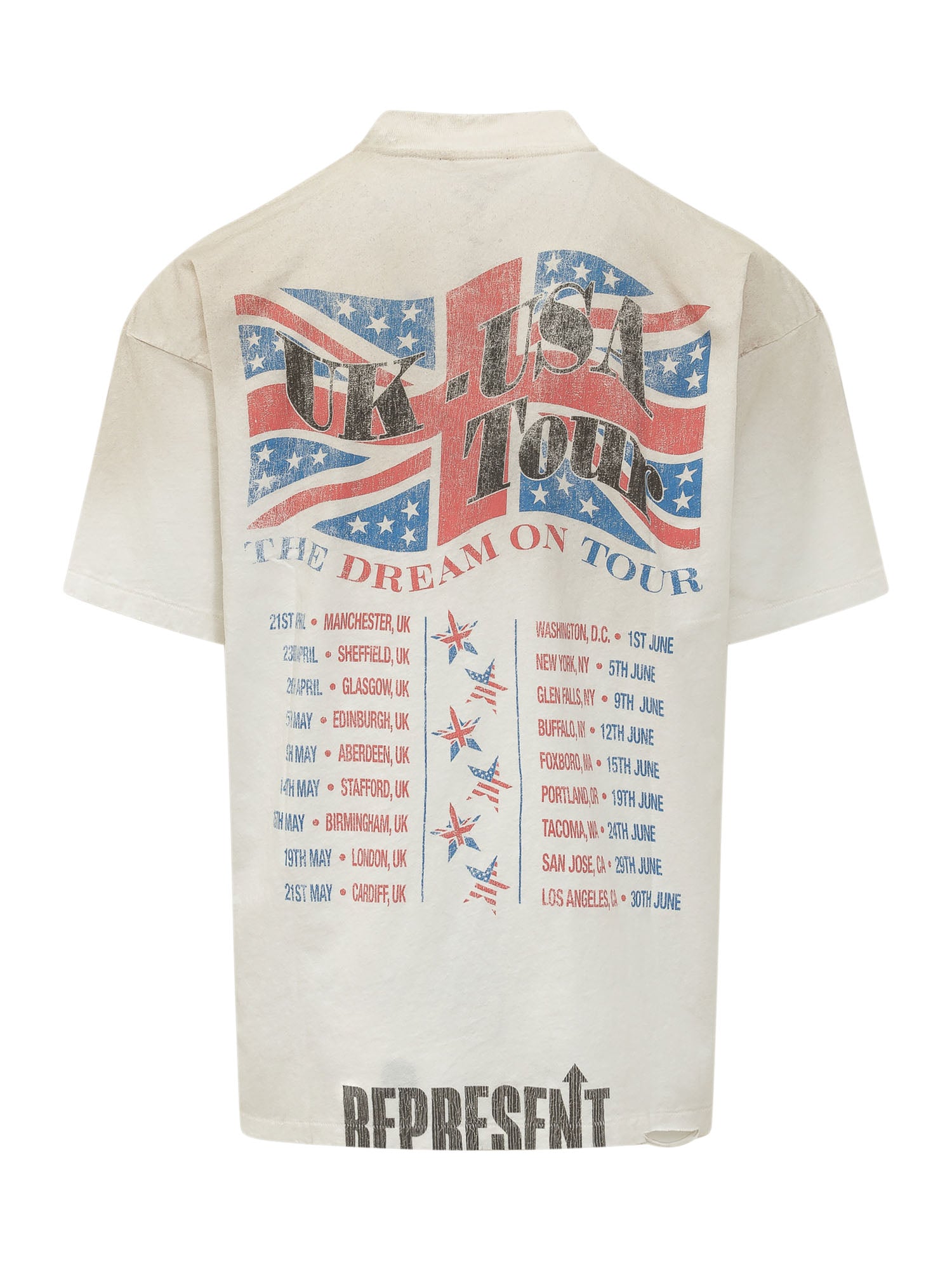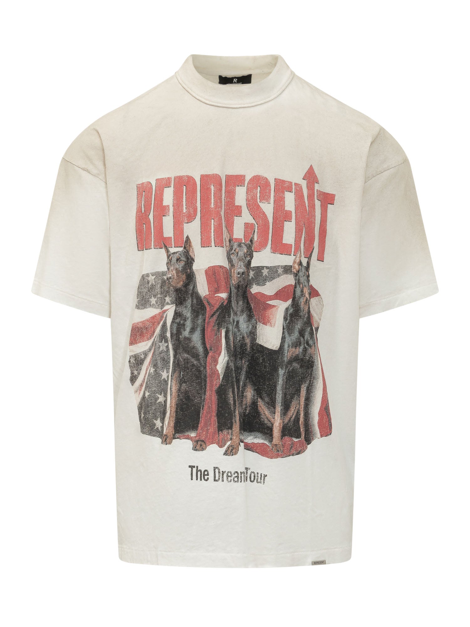Men s short-sleeve crew neck T-shirt with a relaxed fit. The design features a large front graphic print with the Represent lettering and an illustration of three Dobermans over a flag background, creating a bold contemporary streetwear look.