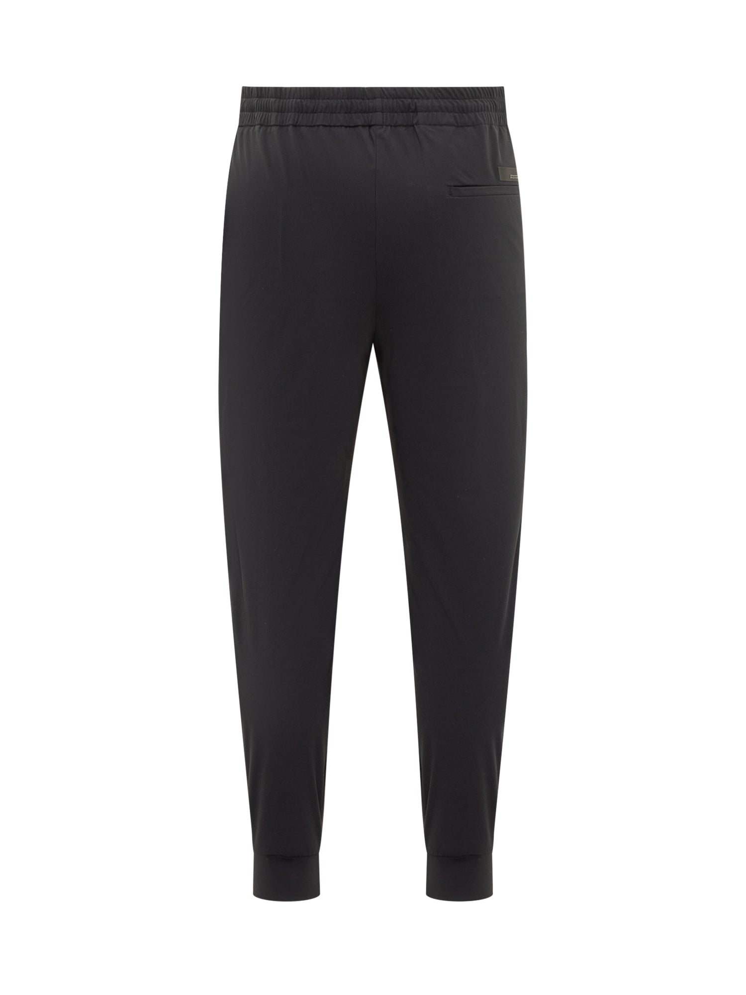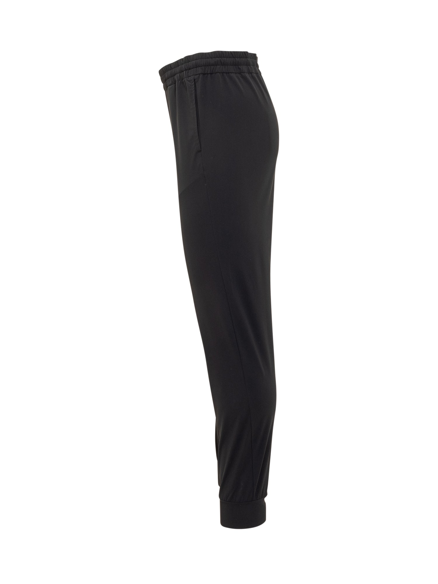 Jogger pants. Elasticated waistband with drawstring. Elasticized band bottom. Pockets on the sides. Flush pocket on the back. Blue color.