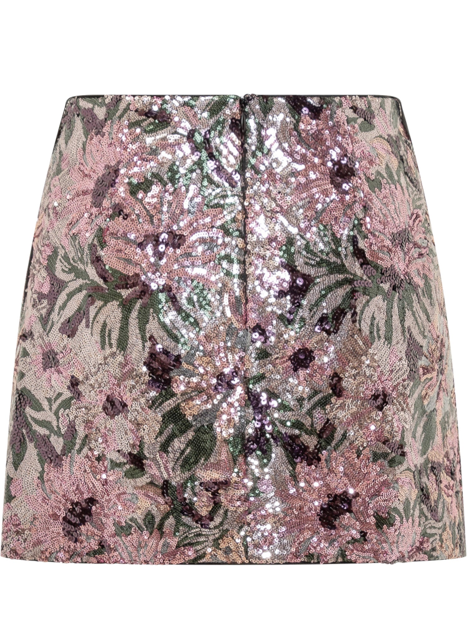 Mini skirt embellished with floral sequin embroidery for a bright, sophisticated look. The straight silhouette enhances the figure and adds an elegant touch to evening outfits.