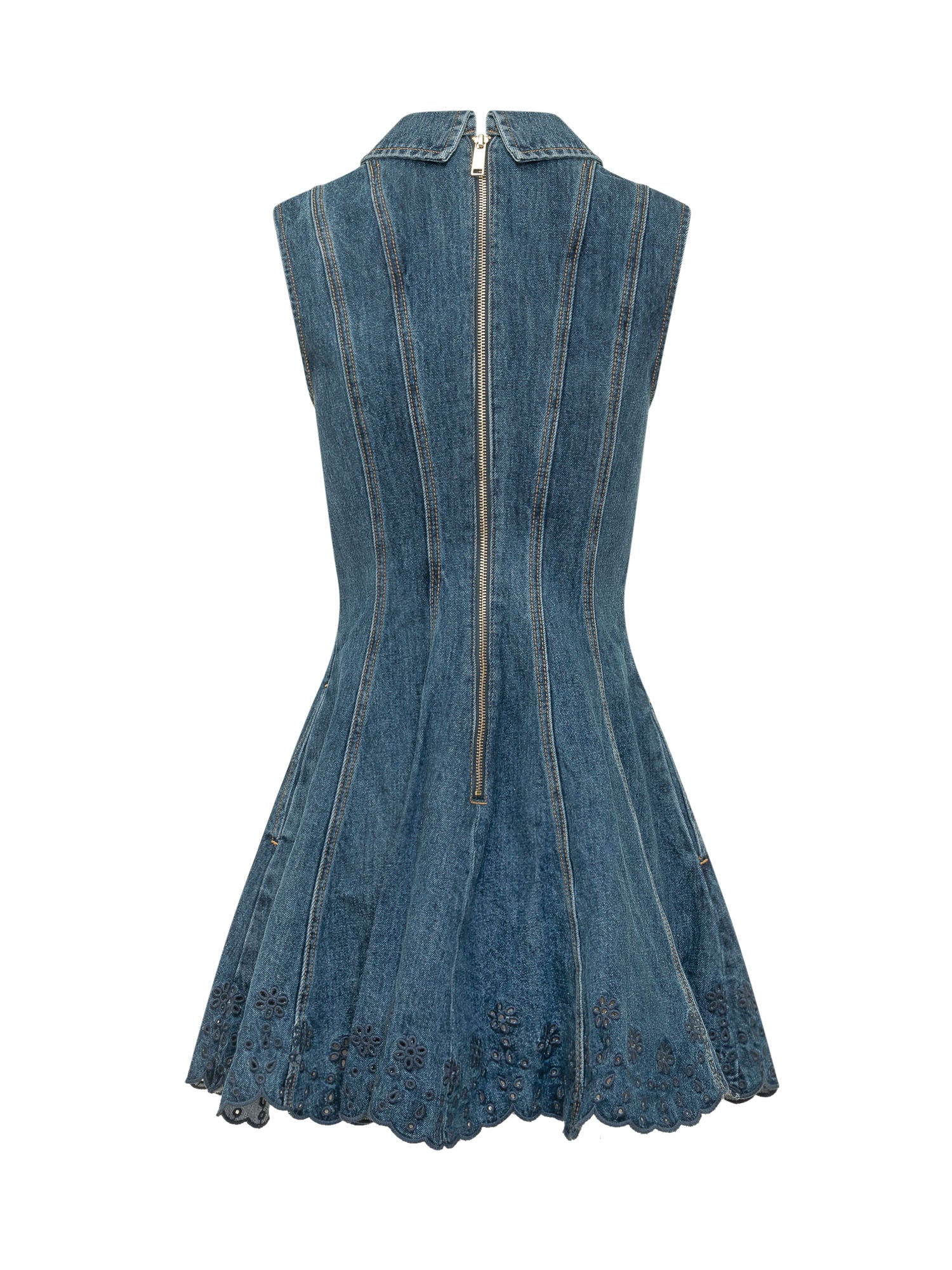 Women s blue denim mini dress featuring a classic collar, front button placket and a flattering flared silhouette. The hem is finished with delicate broderie detailing that adds a feminine and romantic touch, perfect for summer casual looks or chic daytime outfits.