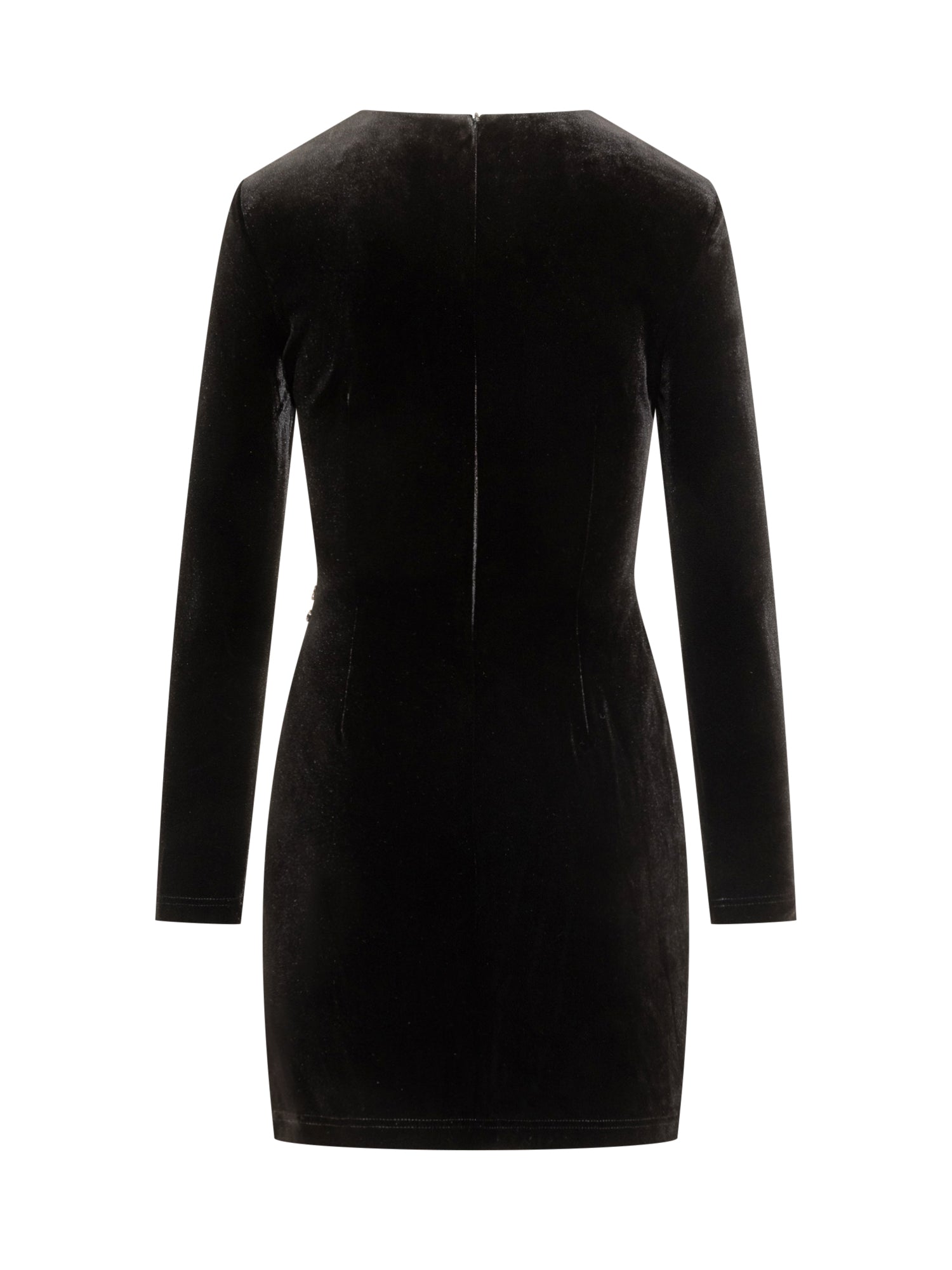 Short black velvet dress with long sleeves, side draping and jewel embellishment.