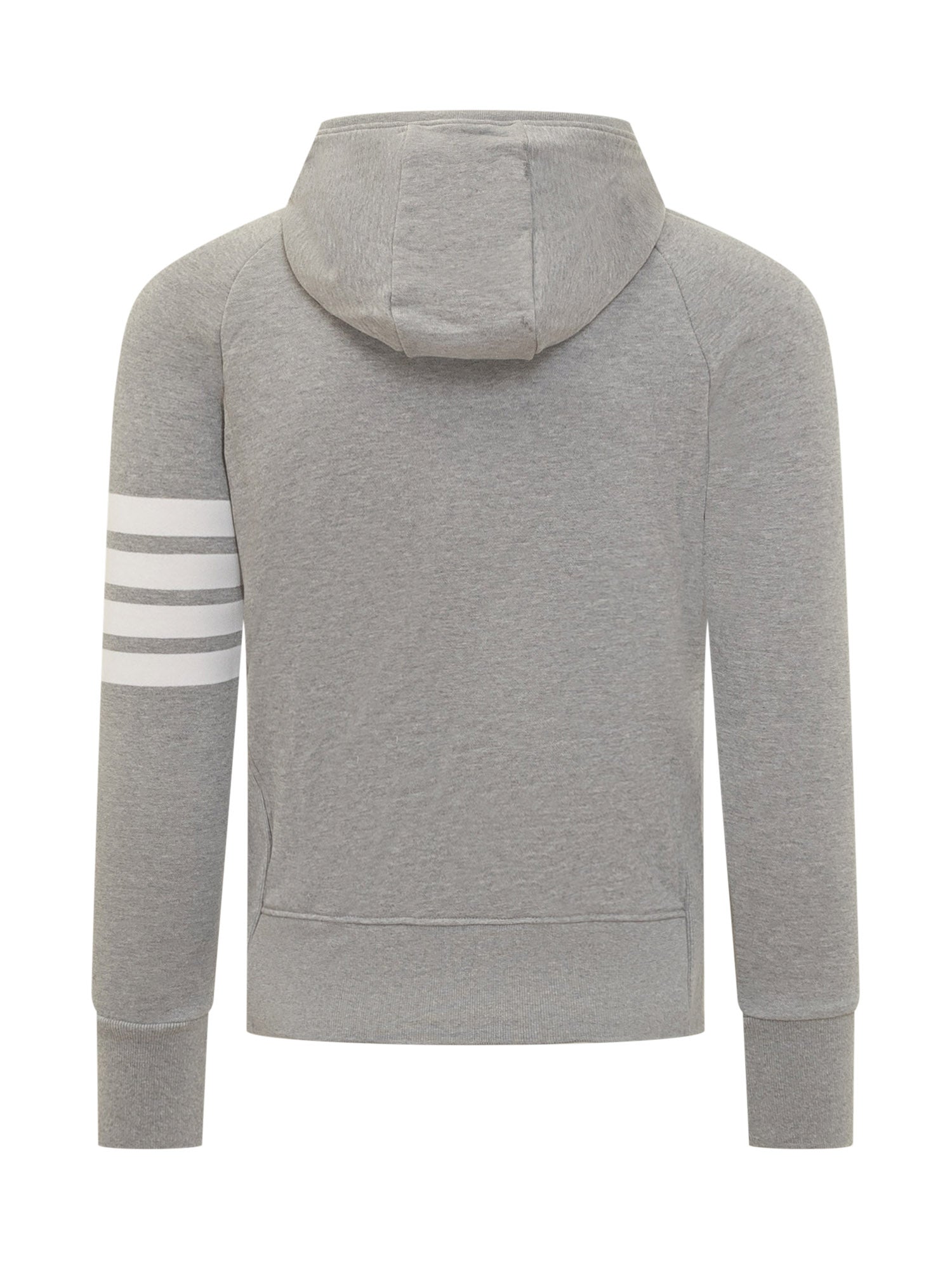 Hood with drawstring. Long sleeves. Ribbed hem and cuffs. 4 bar logo on the sleeve. Zip closure. Central pouch pocket. Striped grosgrain tongue on the back of the neck.