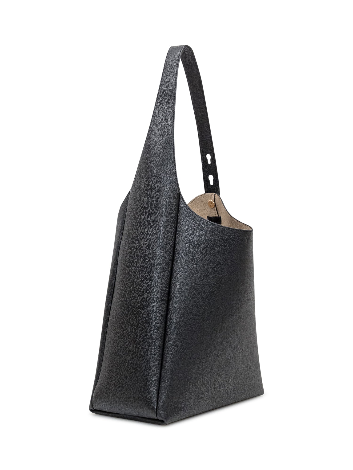 Hobo bag by Tory Burch crafted from black grained leather. Featuring a sleek and modern silhouette, it offers a wide handle for comfortable shoulder wear. The interior includes a pocket, and the top closes securely with a metal clasp.