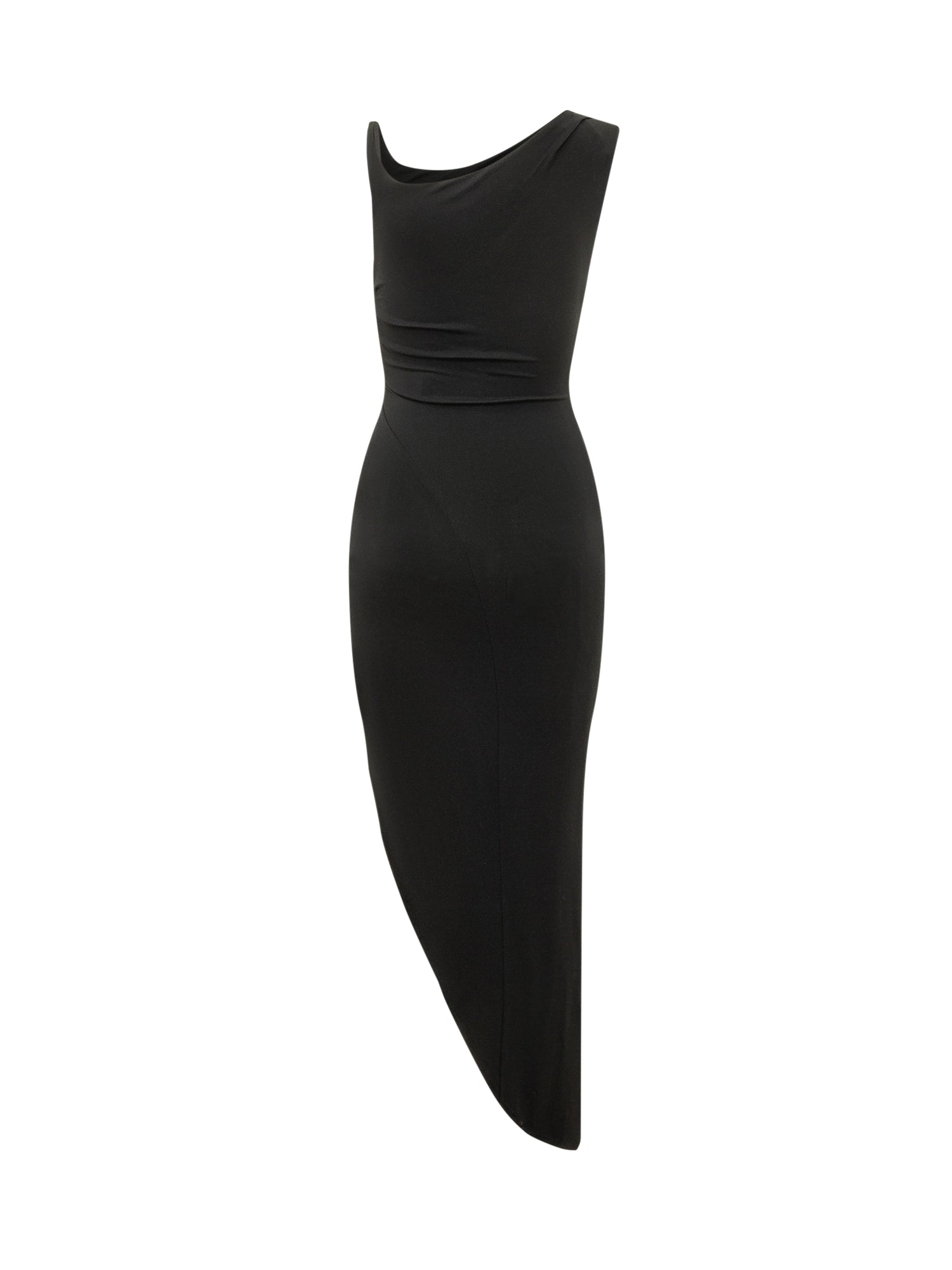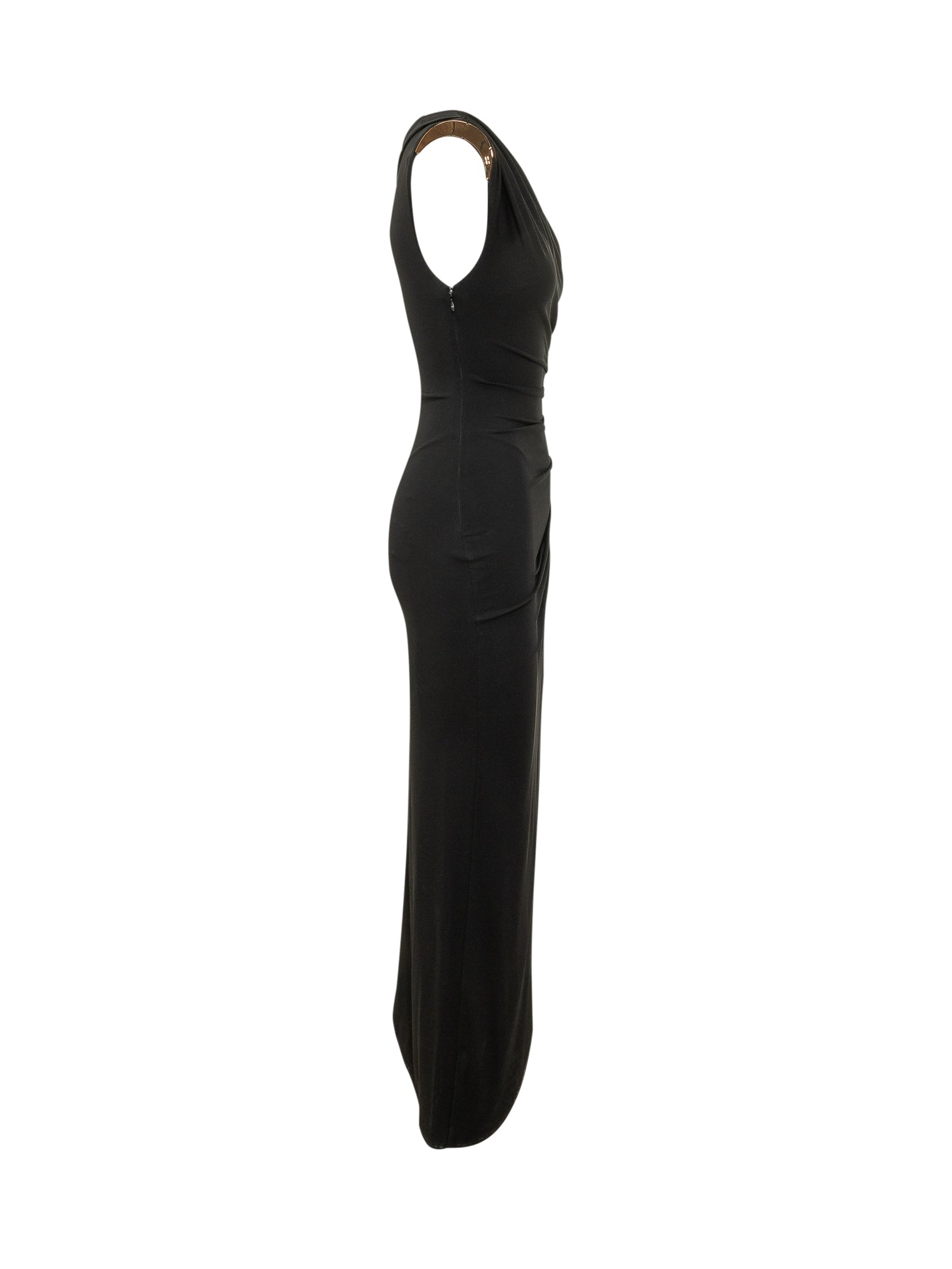 Long one shoulder dress with draped bodice, fitted shape that enhances the silhouette, side slit for easier movement, ideal for ceremonies and evening events, elegant and refined style.
