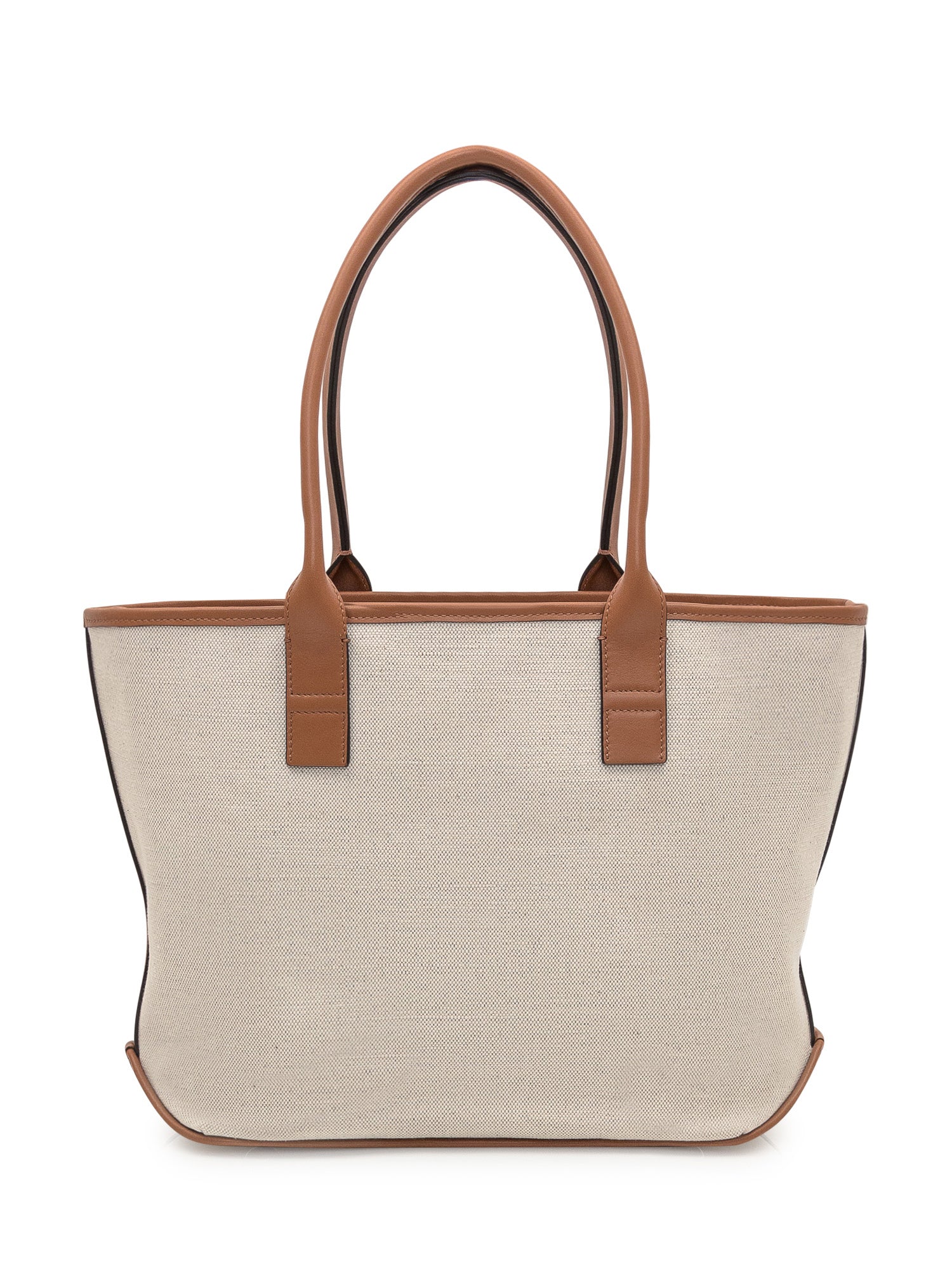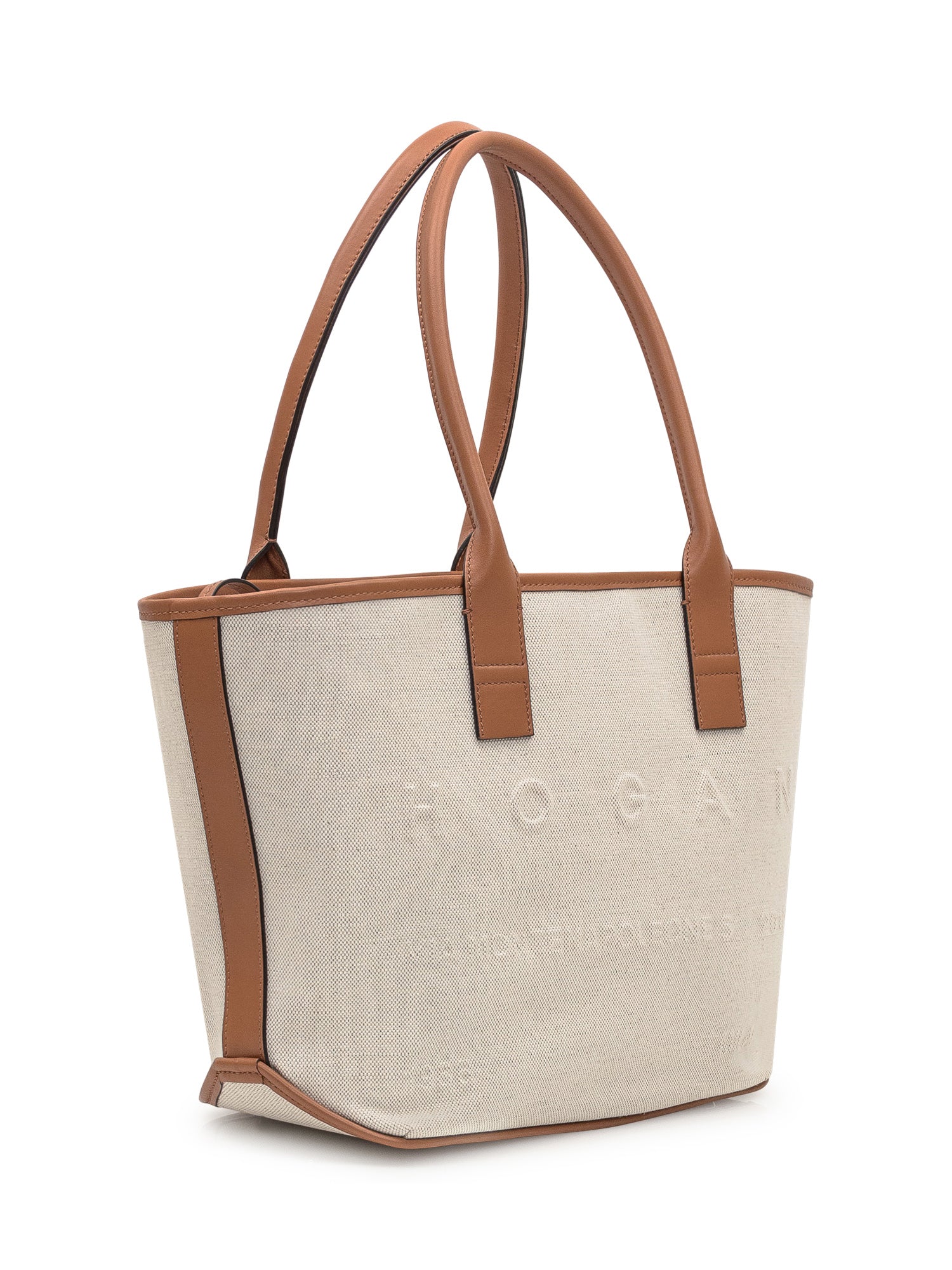 The Address Shopping bag by Hogan is crafted from beige canvas with elegant tan leather trims, offering a natural and timeless look. The tone-on-tone logo is subtly embossed on the front, adding a discreet touch of brand identity. Equipped with two structured leather handles, it can be comfortably carried by hand or over the shoulder. The interior features a practical zipped pocket, while the top closes with a leather drawstring for a refined everyday style.