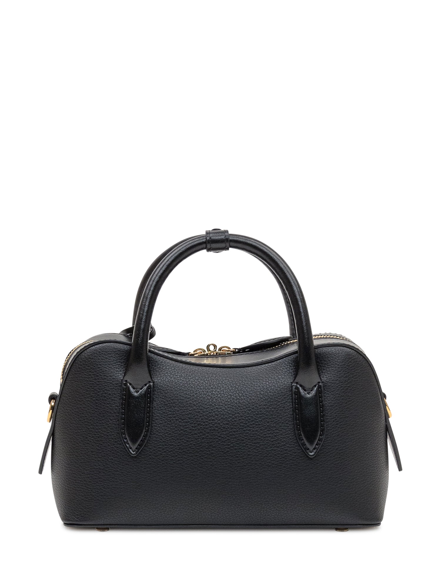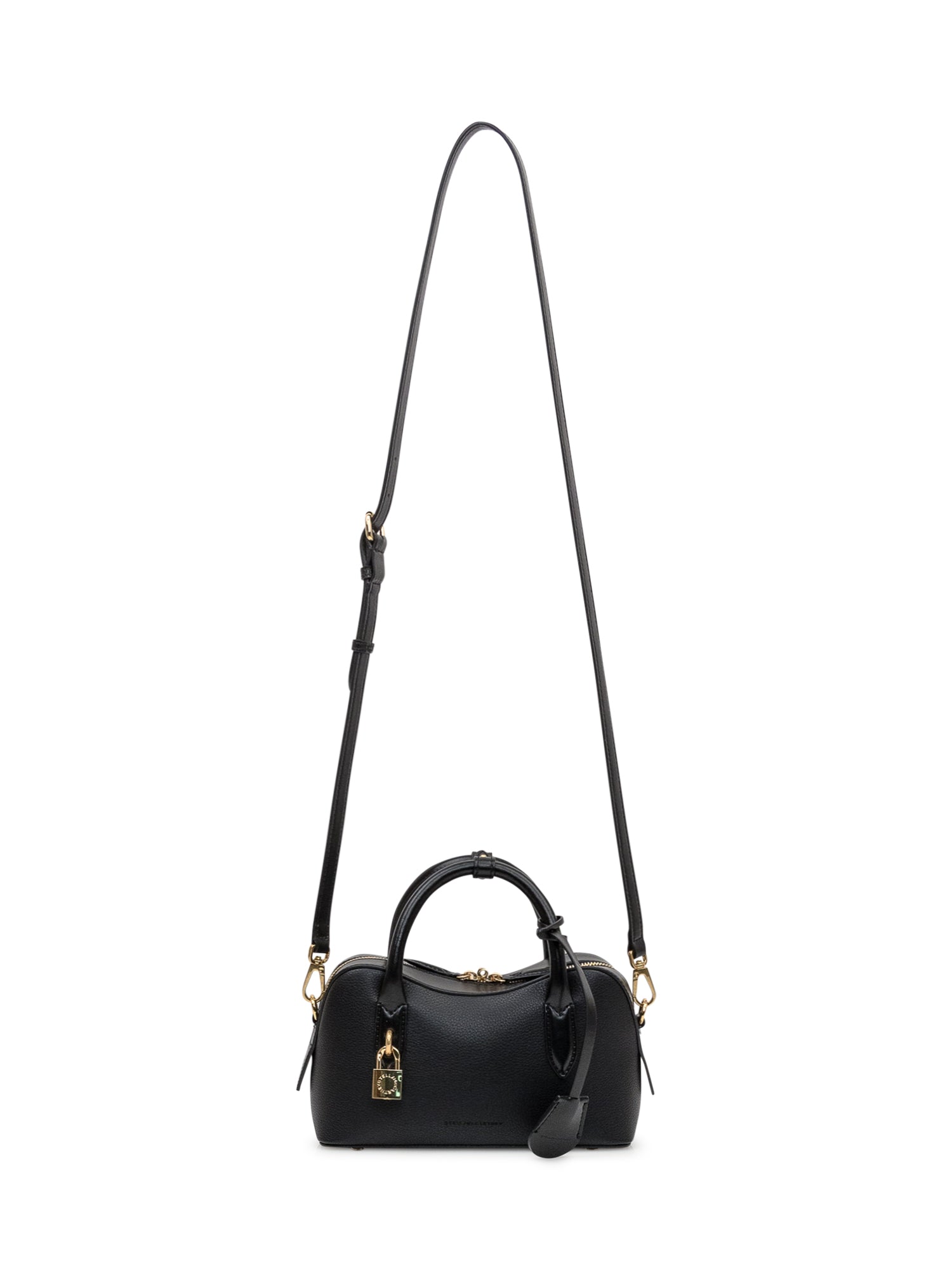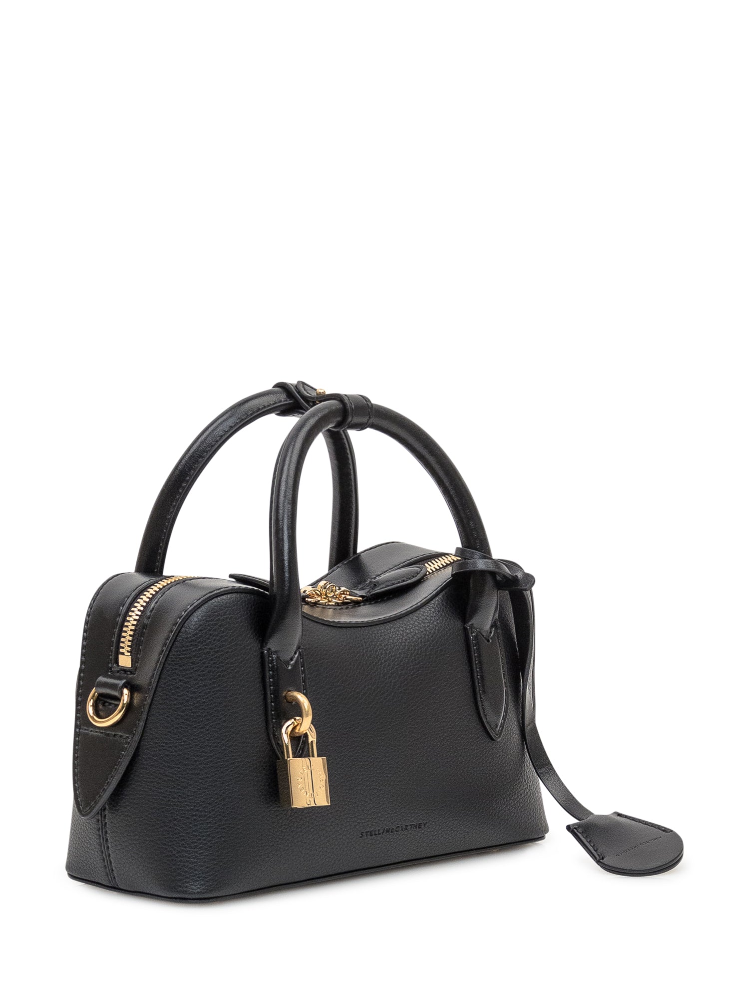 Stella McCartney bowling bag in black eco-leather with gold-tone details and decorative padlock. Compact design with double handle and zip closure.