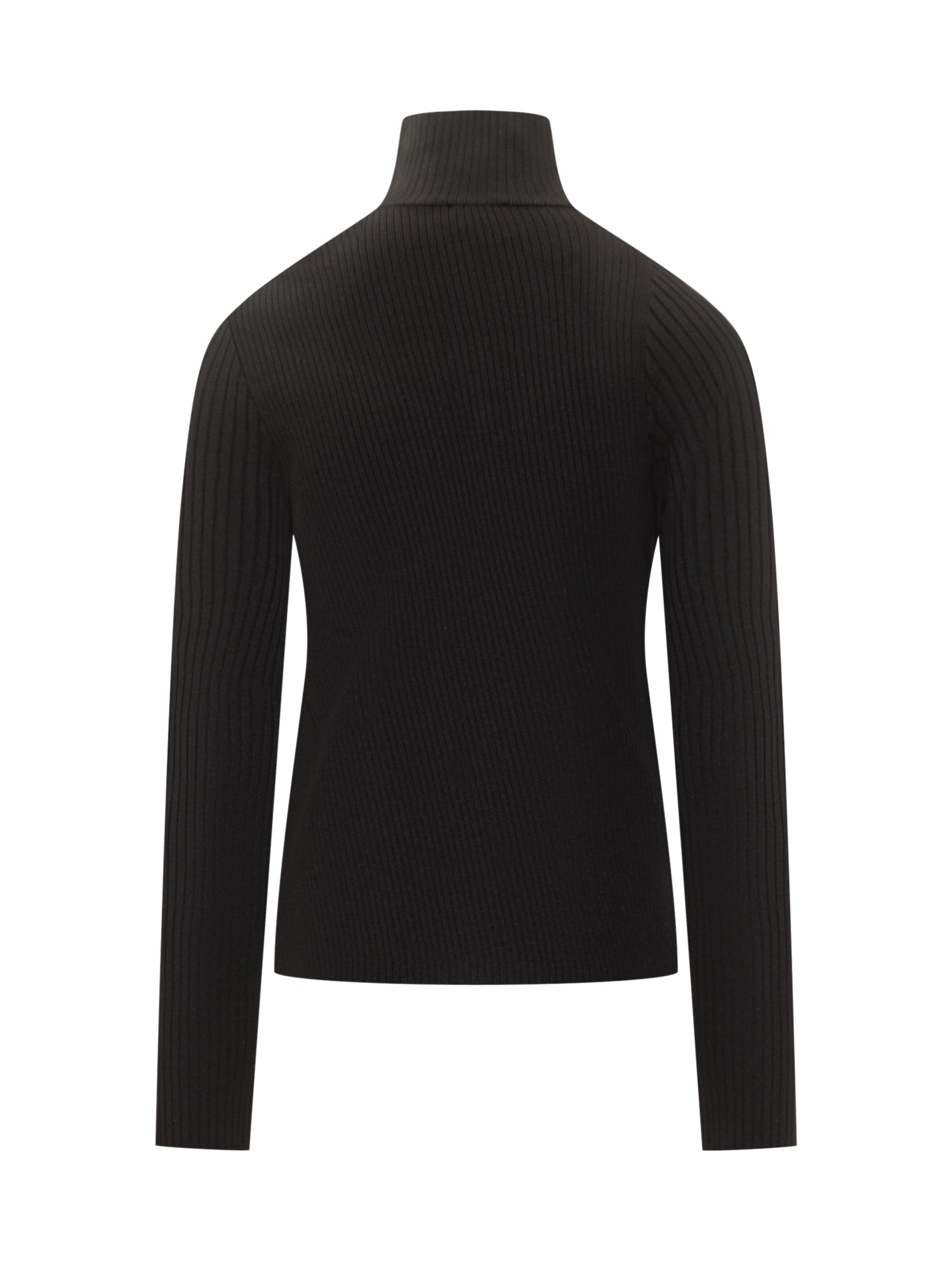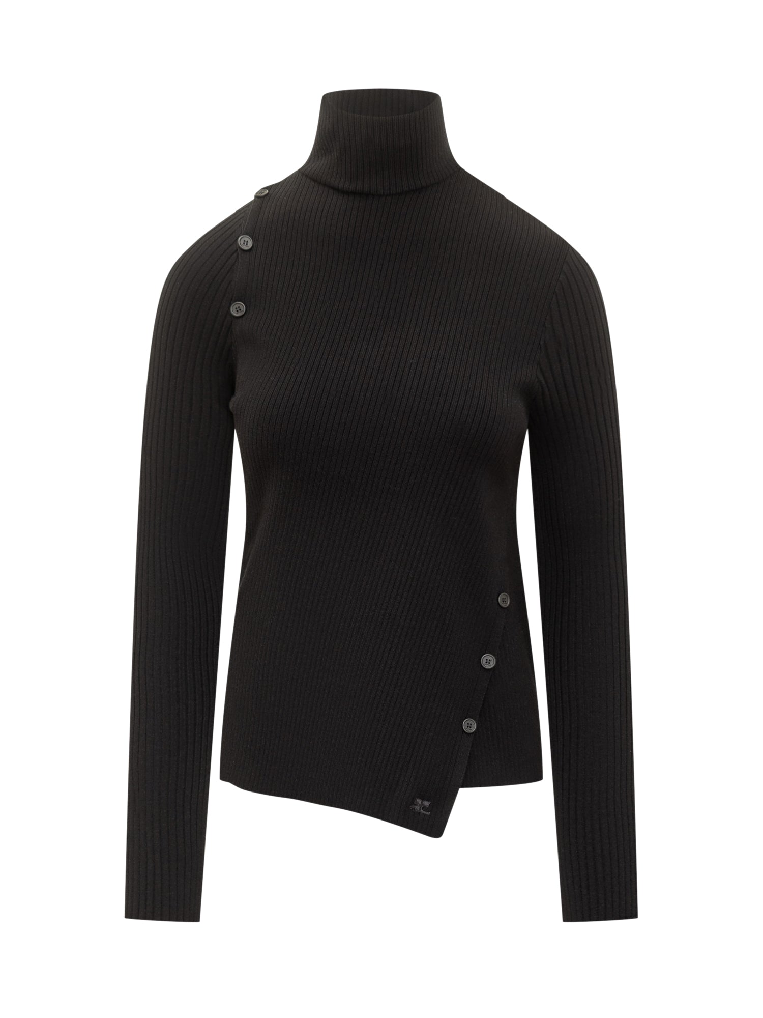 Dolcevita Courrèges nero a coste in maglia stretch con chiusura asimmetrica a bottoni e logo discreto sul fondo.