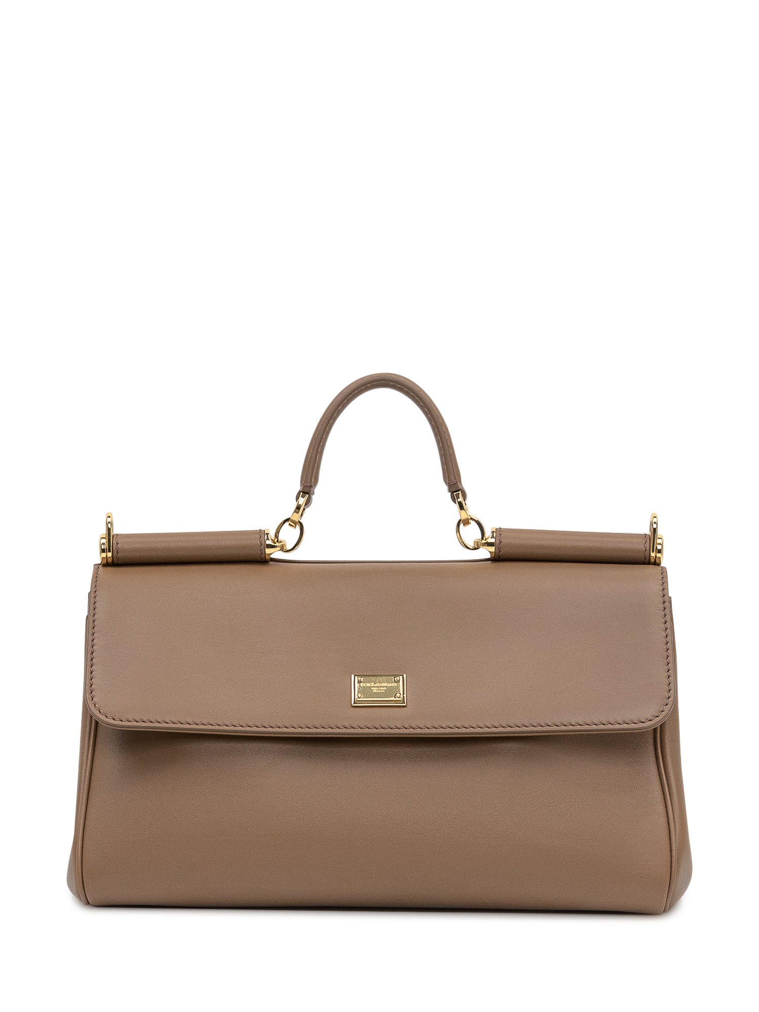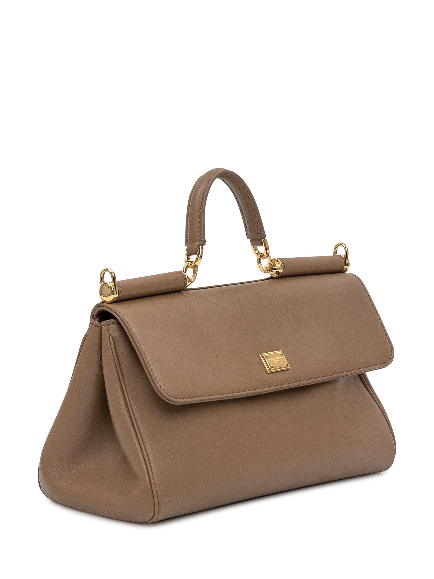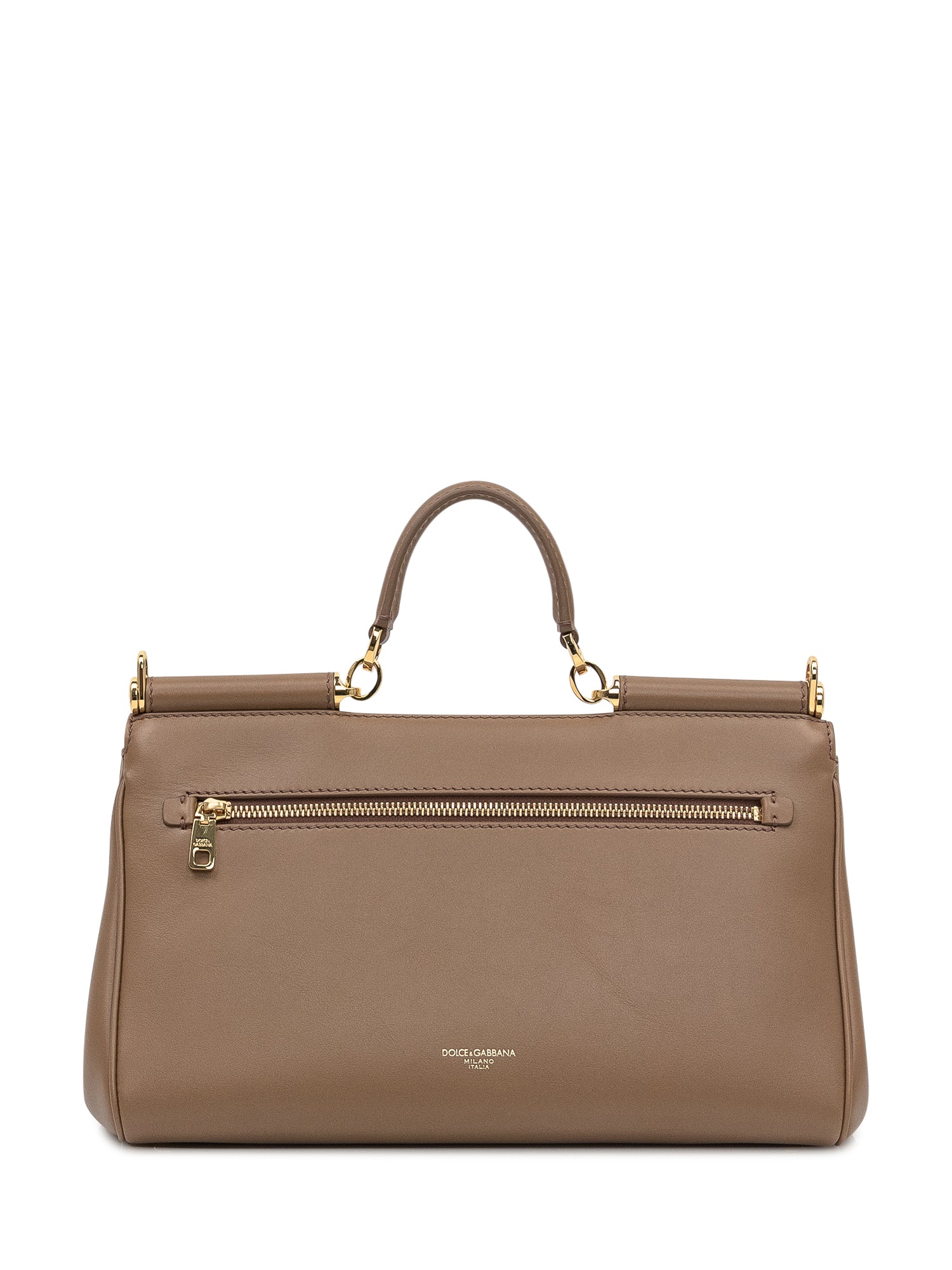 Elegante borsa Dolce & Gabbana Lux Ottone Vintage in pelle taupe con manico superiore, tracolla regolabile e dettagli in metallo dorato.