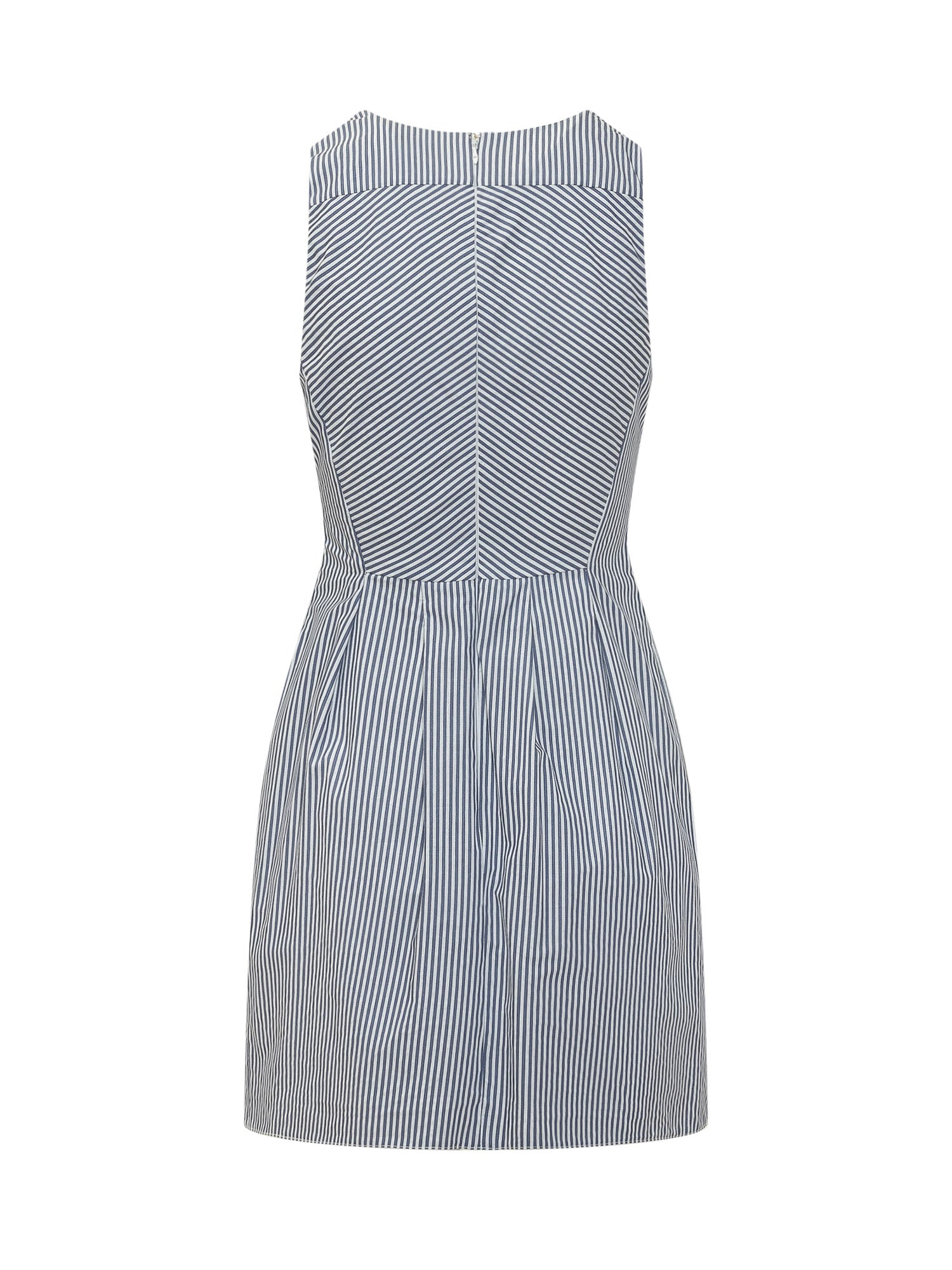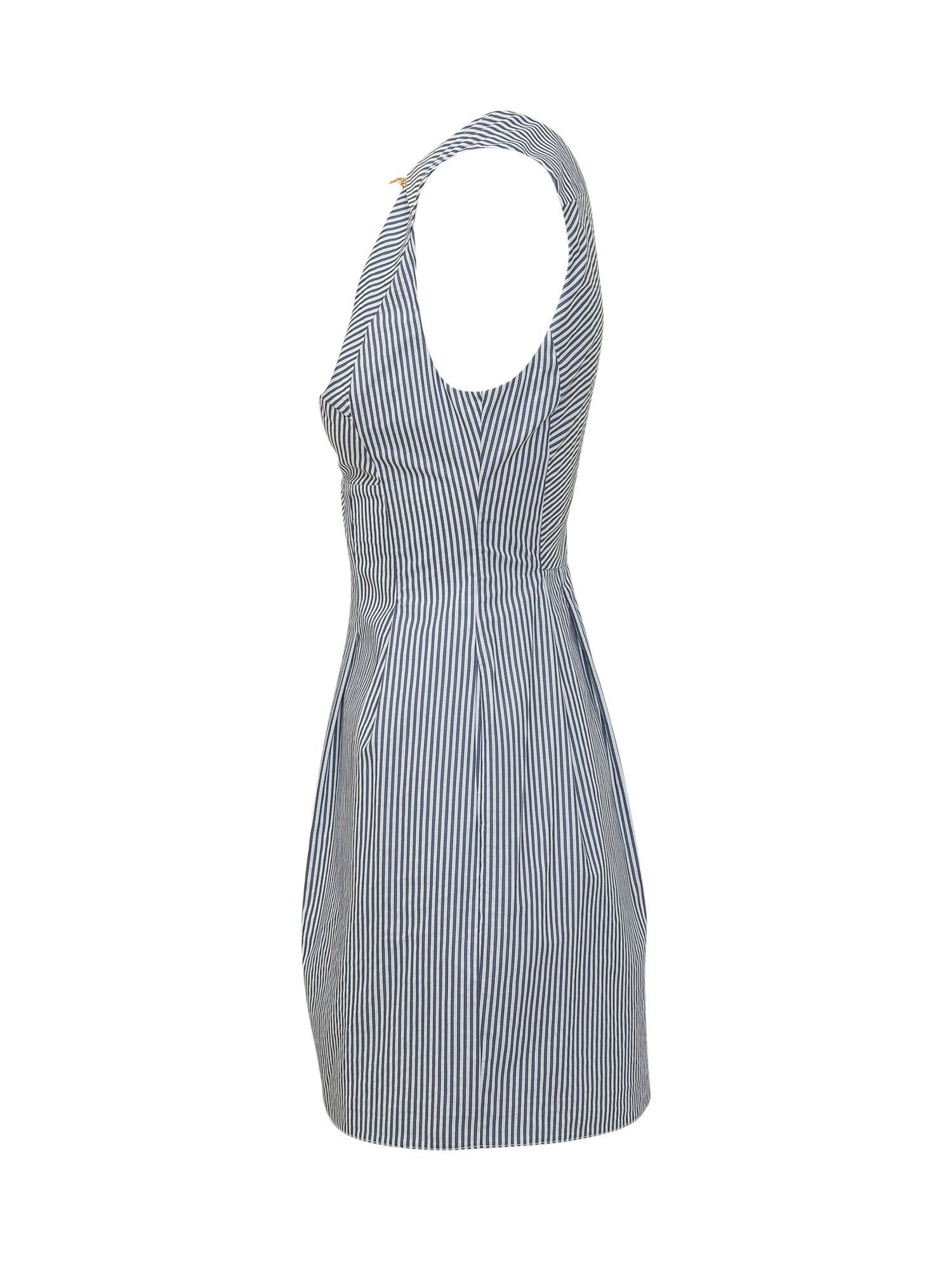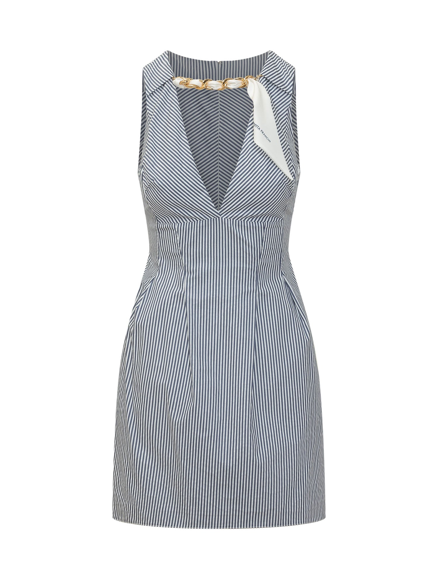 Abito mini smanicato in tessuto a righe verticali con scollo a V profondo. Il collo è impreziosito da una catena decorativa con foulard in tessuto che aggiunge un tocco elegante e distintivo. Silhouette strutturata con pieghe sul davanti che valorizzano la figura.