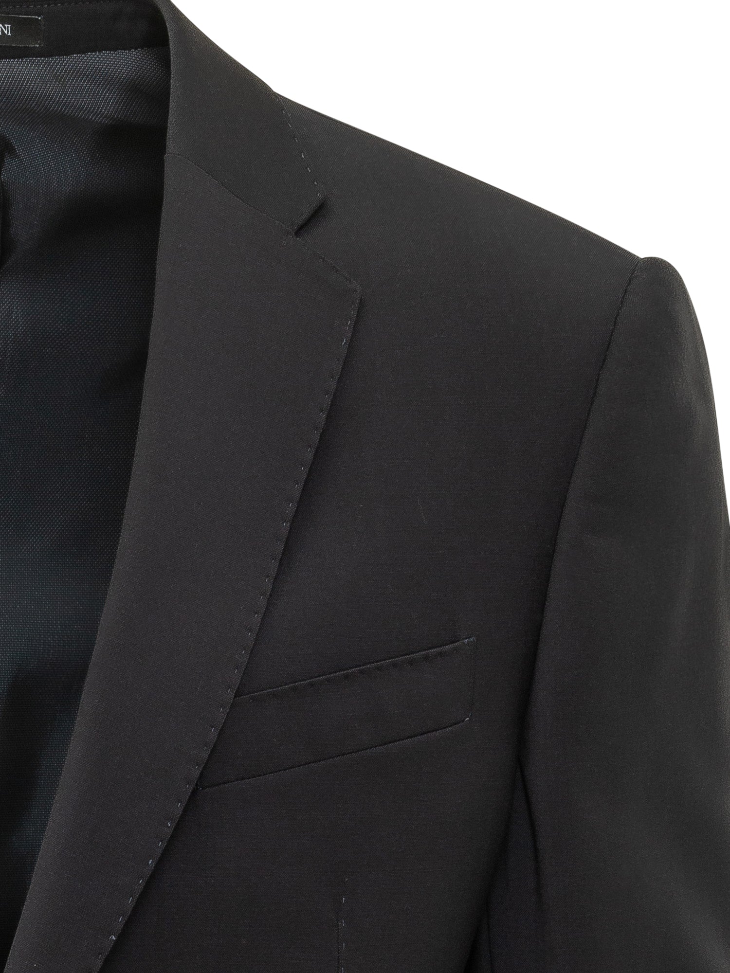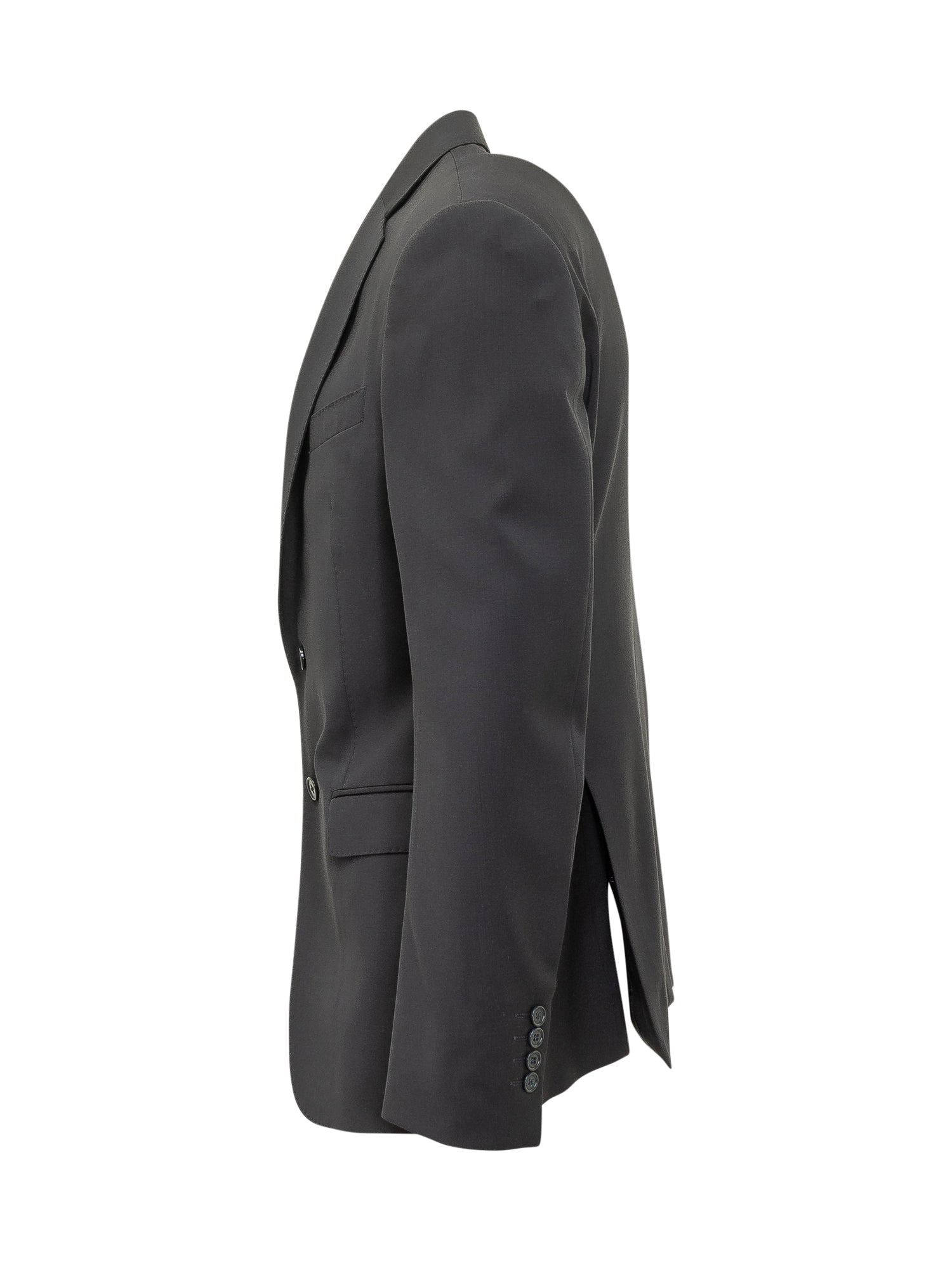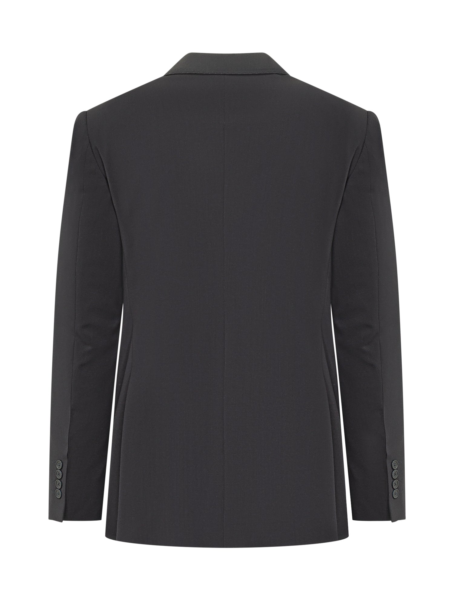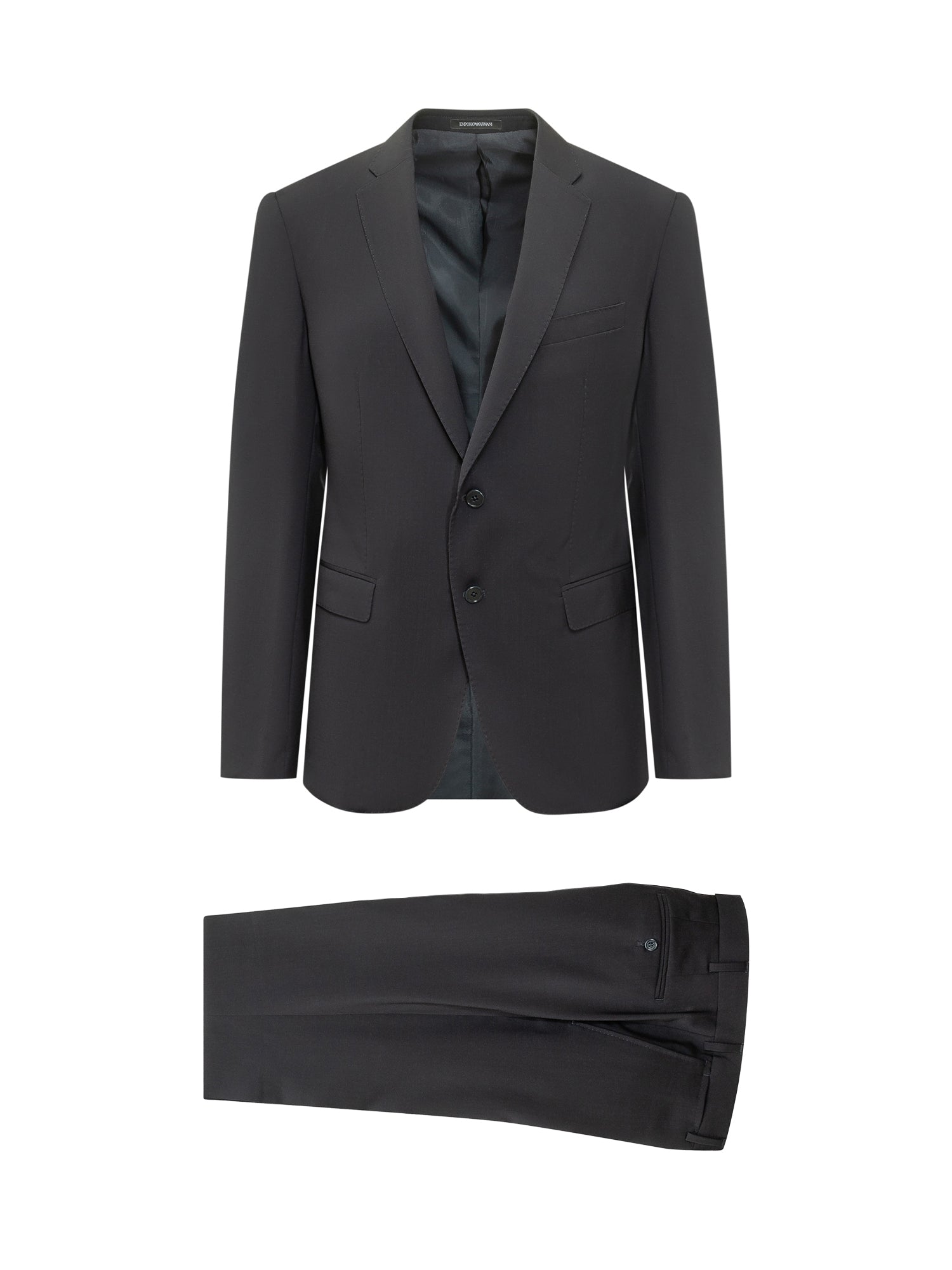 Abito monopetto composto da giacca e pantalone. Giacca con rever classico, chiusura a due bottoni, tasche con patta e taschino sul petto. Pantalone con chiusura frontale e tasche laterali. Linea strutturata e formale.