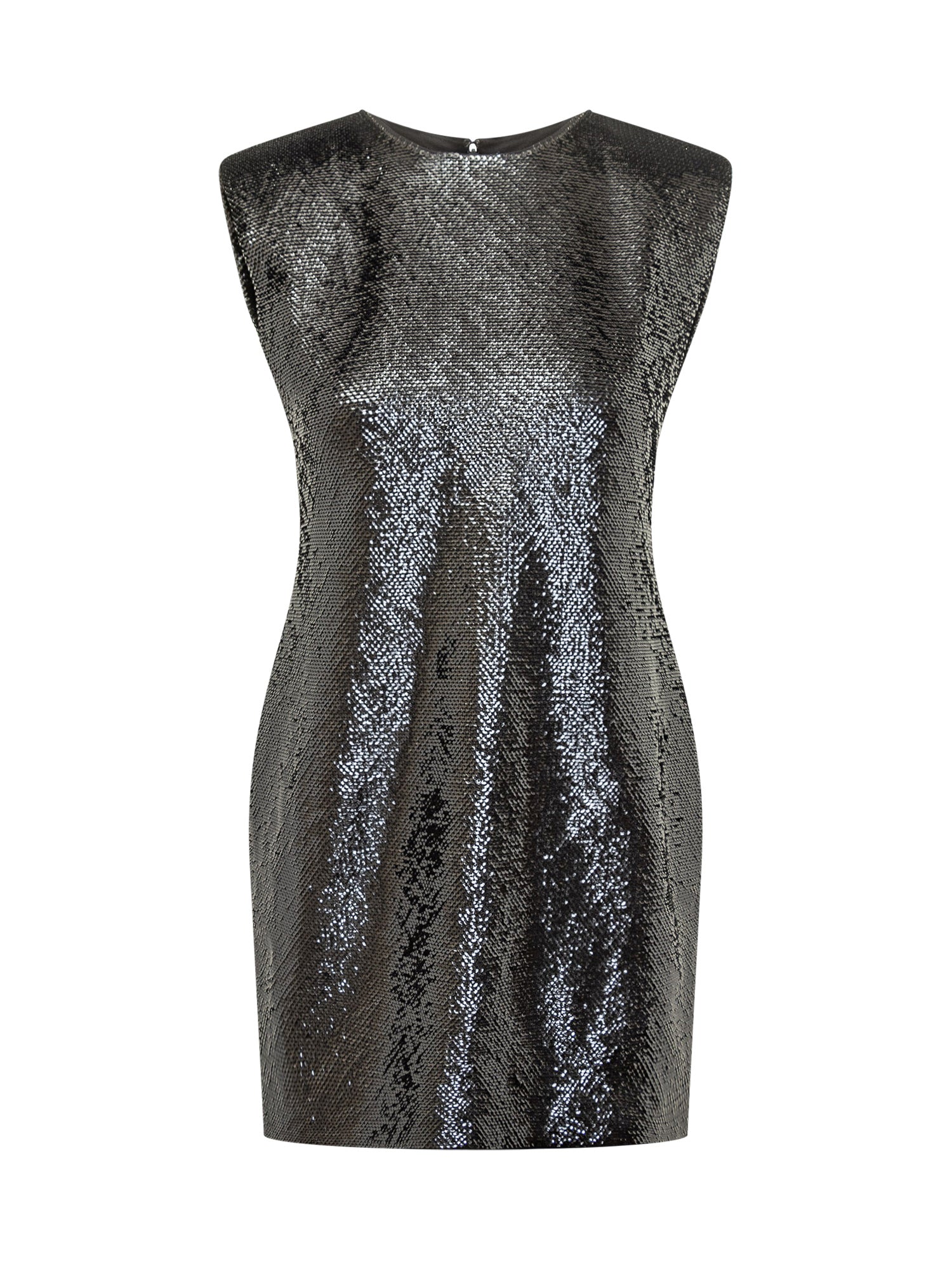 Abito corto Michael Kors in tessuto scintillante con paillettes argento. Silhouette aderente e senza maniche per un look elegante e moderno.