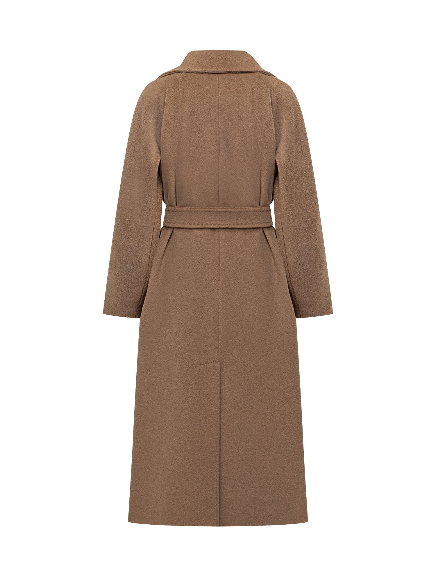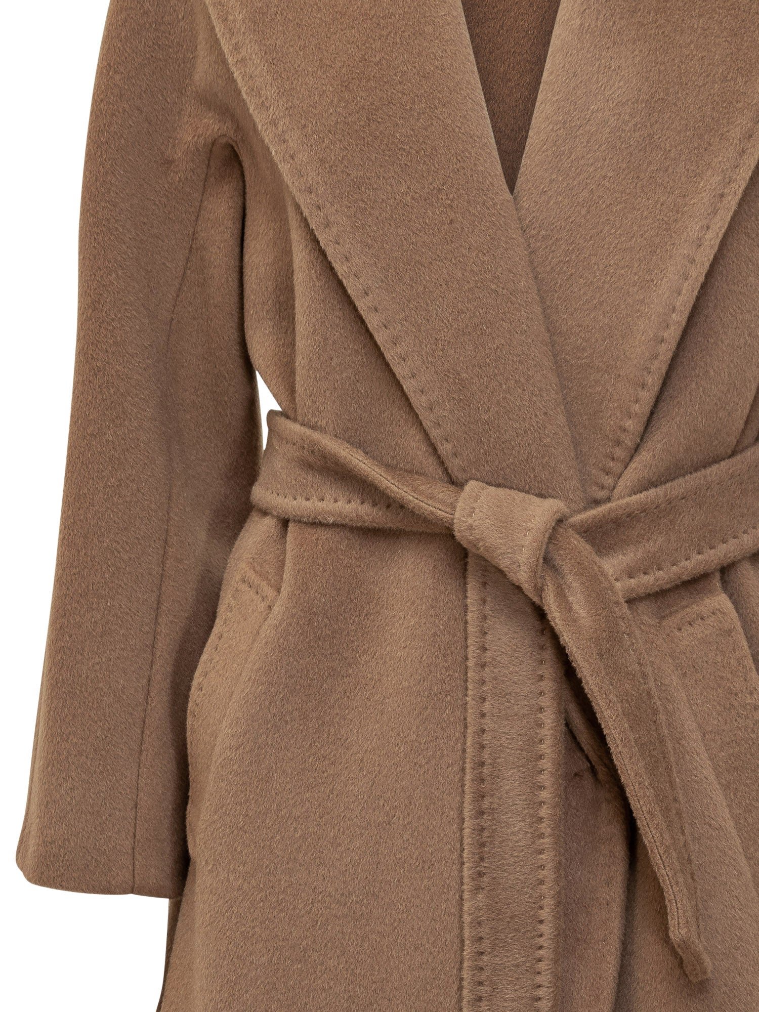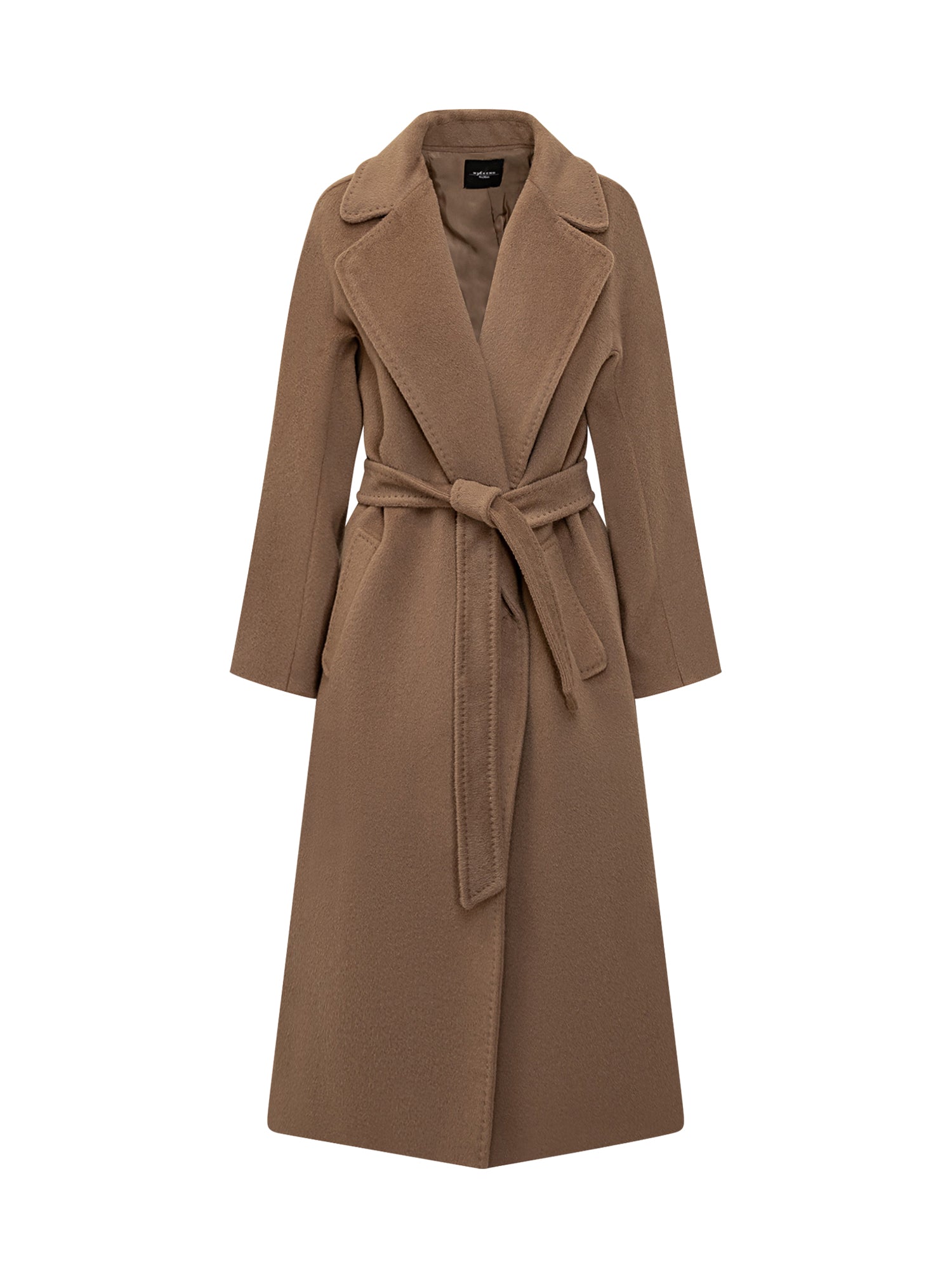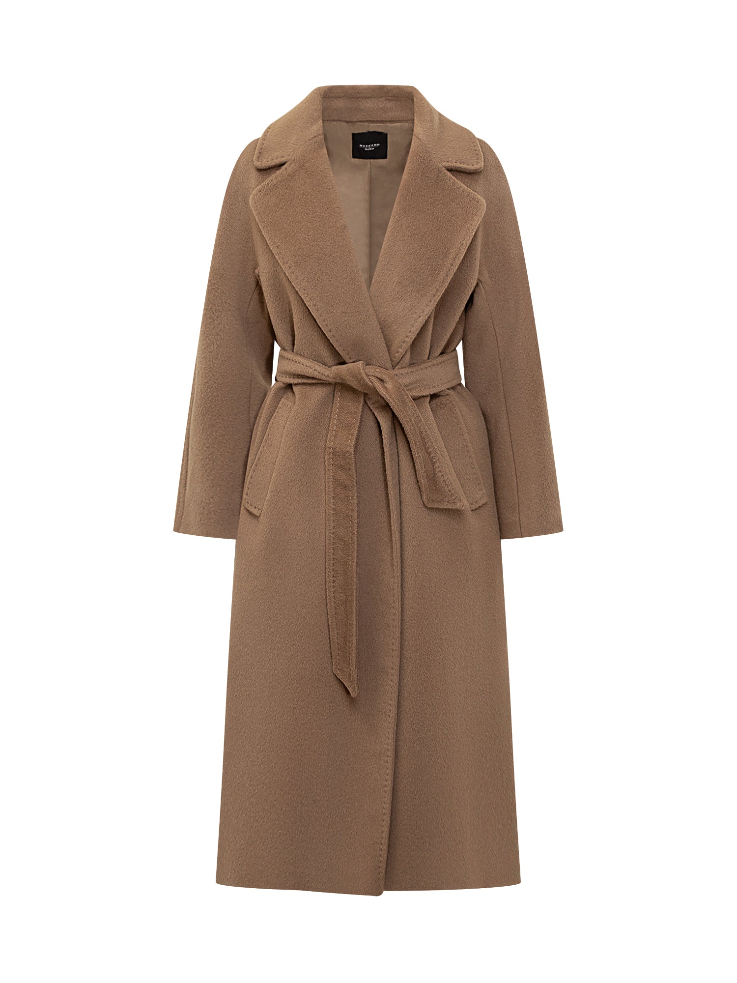 Cappotto Weekend Max Mara in morbida lana color cammello con ampi revers e cintura coordinata.