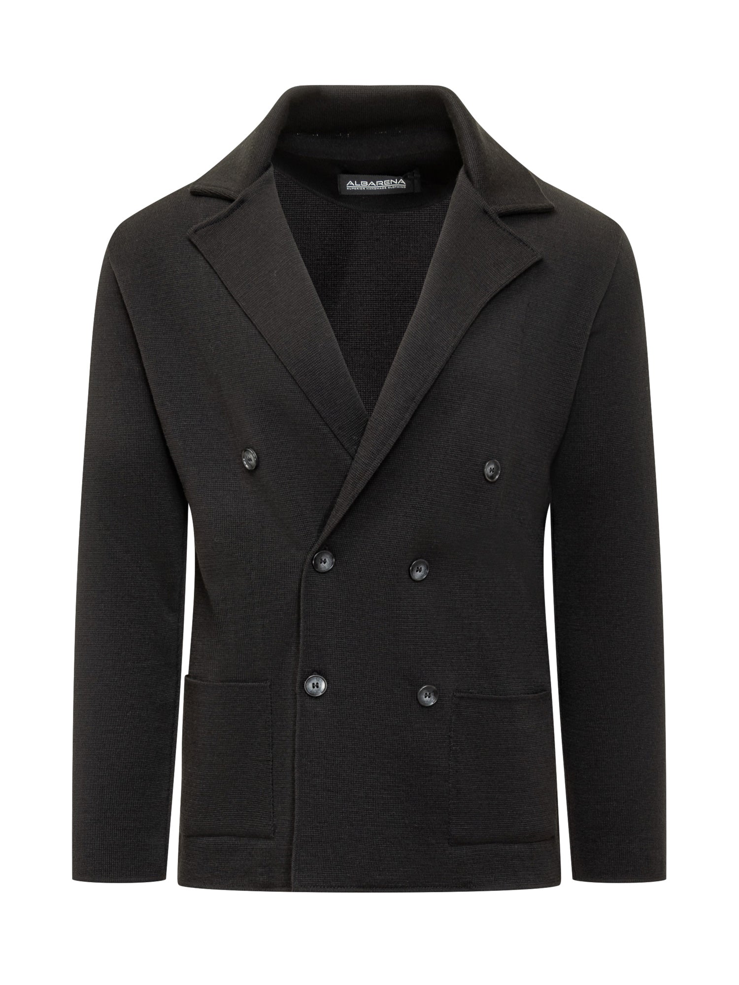Giacca doppiopetto Albanera in maglia nera con sei bottoni e tasche applicate. Elegante e confortevole.