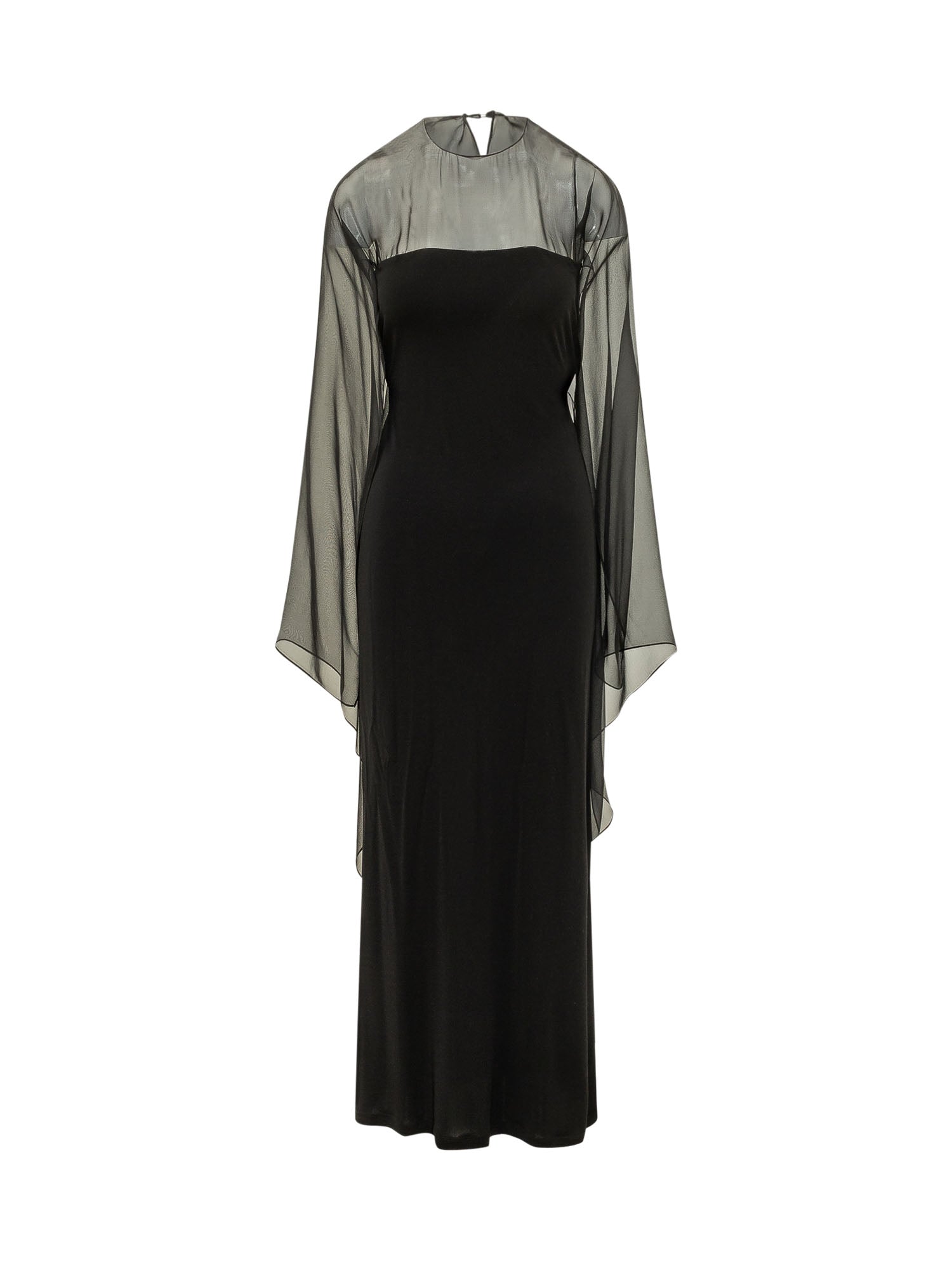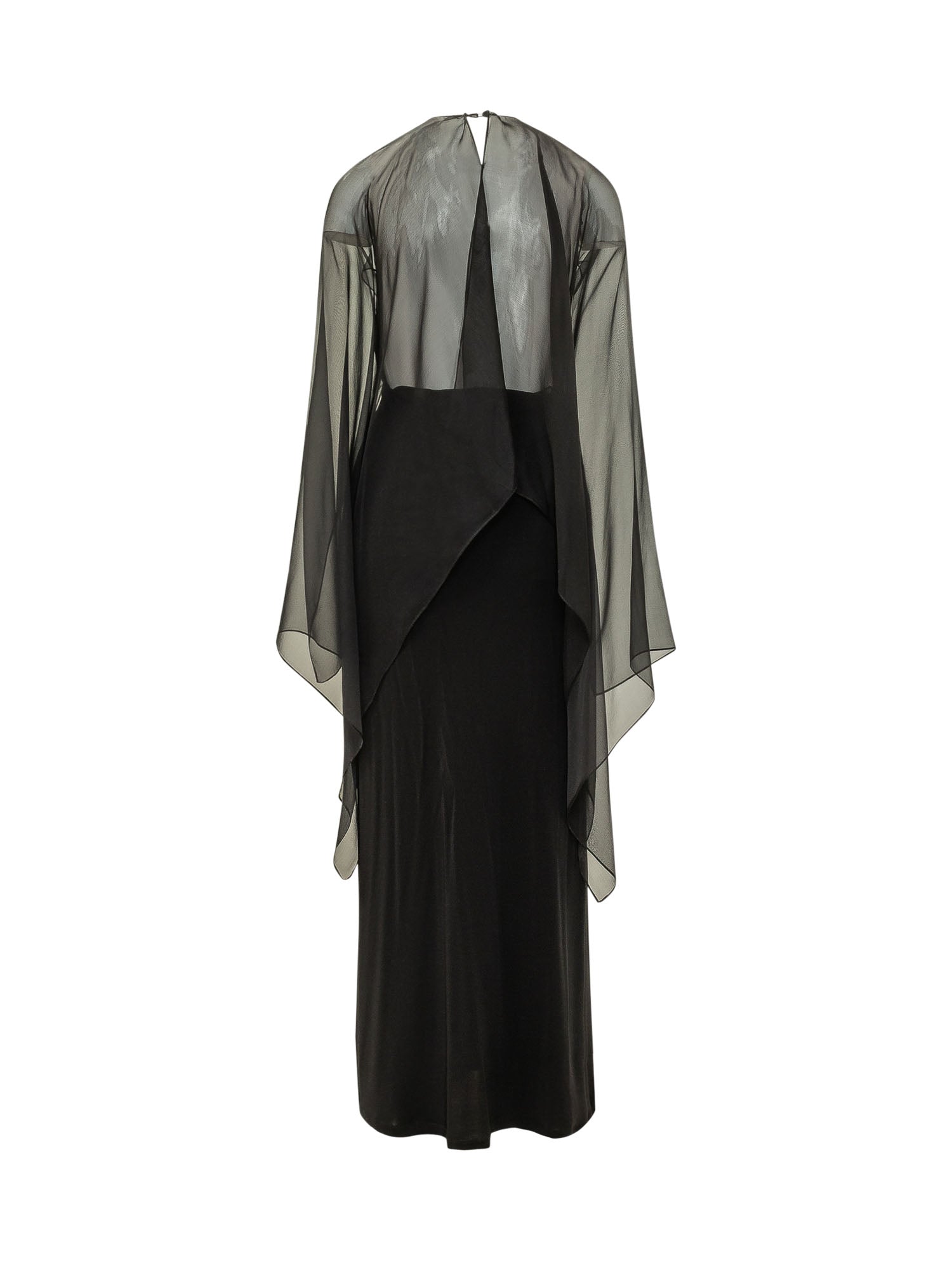 Abito lungo con linea fluida e inserti trasparenti su maniche e parte superiore.