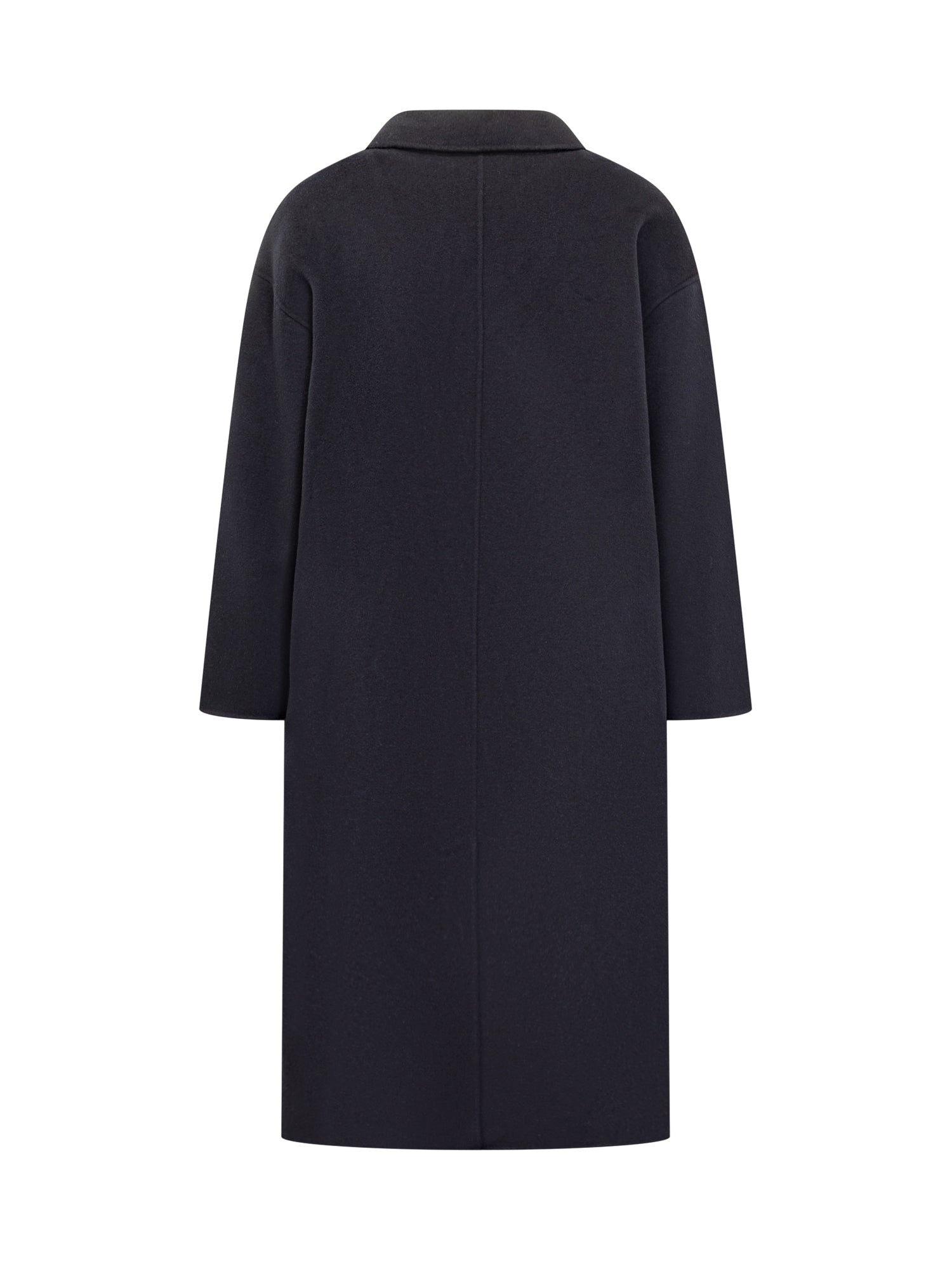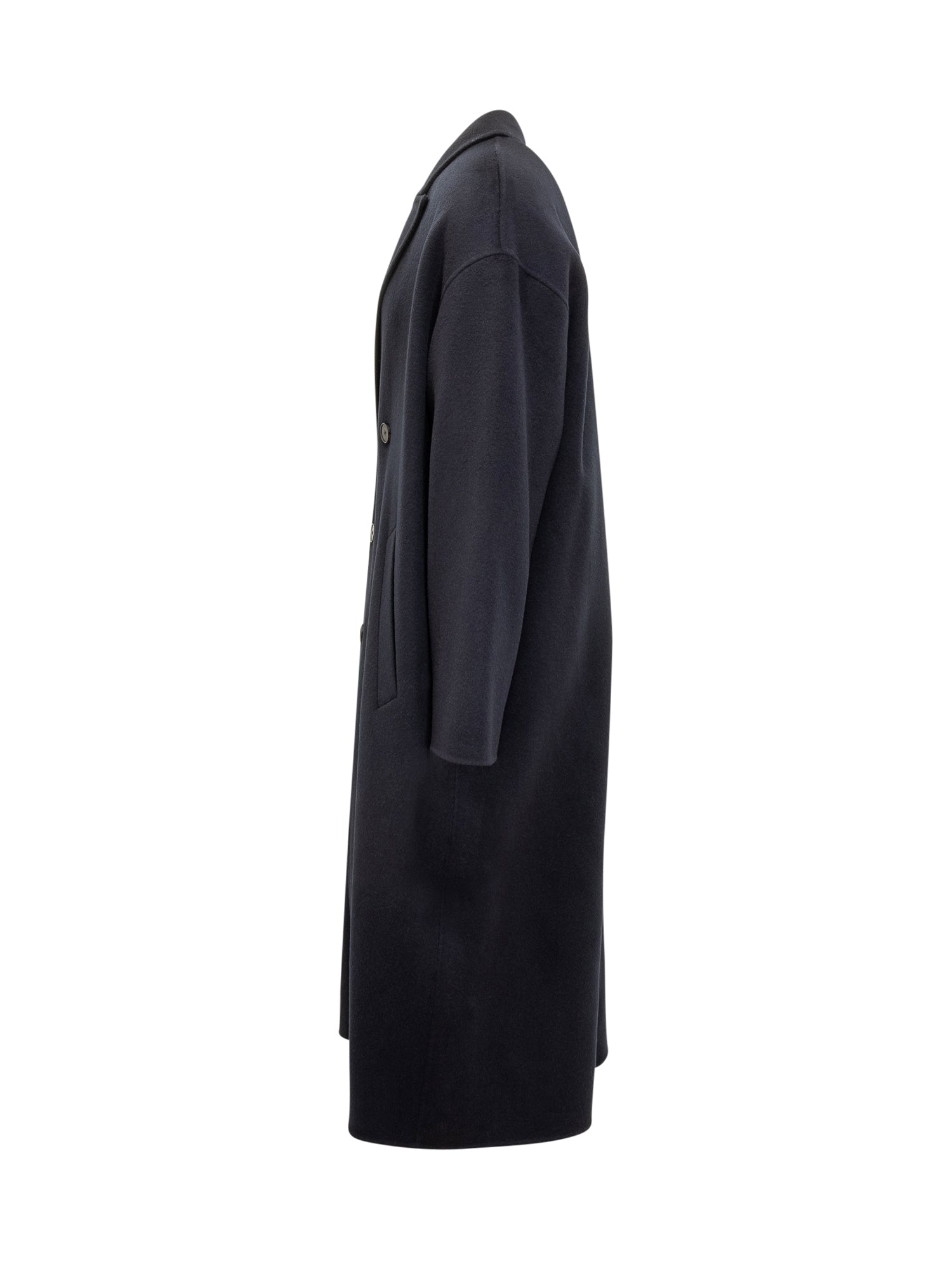 Cappotto doppiopetto Amaranto in lana blu con revers classici e bottoni tono su tono.